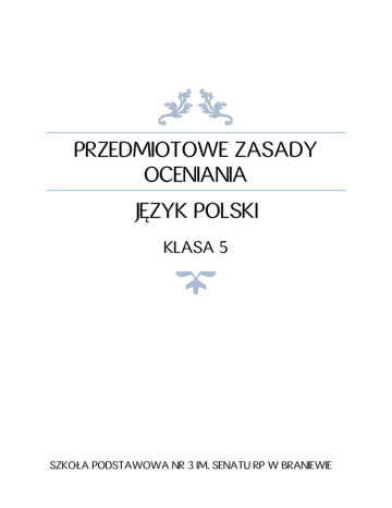 PRZEDMIOTOWE ZASADY OCENIANIA JĘZYK POLSKI KLASA 5 SZKOŁA PODSTAWOWA NR 3 IM. SENATU RP W BRANIEWIE Przedmiotem oceniania z języka polskiego są: 1) wiadomości, 2) umiejętności, 3) aktywność. Ocenianie ma charakter cyfrowy w skali 1-6. 1 – niedostateczny 2 – dopuszczający 3 – dostateczny 4 – dobry 5 – bardzo dobry 6 – celujący Prace pisemne oceniane się punktowo. Dla ustalenia ocen cyfrowych stosowane są progi procentowe według następującej skali: 97%-100 % Celujący 85% - 96% Bardzo dobry 70%-84% Dobry 50%- 69% Dostateczny 30%-49% Dopuszczający 0%-29% Niedostateczny Ocenianiu podlegają wszelkiego rodzaju formy aktywności ucznia. Każda ocena cząstkowa ma ustaloną wagę: Formy aktywności Waga oceny Test diagnostyczny. 5 Osiągnięcie wysokiego wyniku w konkursie przedmiotowym – etap wojewódzki, sukcesy sportowe, artystyczne na szczeblu 5 wojewódzkim, wykonywanie zadań wykraczających poza podstawę programową. Praca klasowa, sprawdzian. 4 Wypracowanie klasowe. 4 Kartkówka 3 Odpowiedź ustna 3 Dyktando 3 Czytanie teksu ze zrozumieniem. 3 Rozumienie tekstu słuchanego. 3 Prezentacja multimedialna. 3 Praca samodzielna na lekcji. 3 Udział w zajęciach dodatkowych. 2 Praca w grupach. 2 Recytacja 2 Aktywność na lekcji 2 Prace plastyczne 2 Inne (np. przygotowanie do zajęć). 2 Zadania domowe 1 Zeszyt przedmiotowy, zeszyt ćwiczeń – prowadzenie. 1 Wykonanie pomocy dydaktycznych, praca na rzecz szkoły w 1 ramach przedmiotu. 1. Zasady oceniania przedmiotowego z języka polskiego: W klasach IV – VI przyjmuje się minimum 6 ocen z języka polskiego w semestrze. 2. Uczeń ma prawo zgłosić 2 nieprzygotowania do lekcji bez ponoszenia konsekwencji. (Nie dotyczy zapowiedzianych prac klasowych). Zgłoszenie nieprzygotowania powinno nastąpić przed rozpoczęciem zajęć. 3. Ocenie podlega prowadzenie zeszytu przedmiotowego z języka polskiego, które sprawdzany jest według następujących kryteriów: kompletność tematów lekcji, notatek i prac domowych oraz estetyka. 4. Obowiązkiem ucznia jest systematyczne odrabianie prac domowych. 5. Znak graficzny, tzw. „parafka” oznacza, że nauczyciel sprawdził wykonanie pracy domowej przez ucznia, ale nie sprawdził jej zawartości merytorycznej. 6. Niewykonanie pracy domowej odnotowane jest przez nauczyciela w dzienniku elektronicznym symbolem „-”. Minusy są informacją dla nauczyciela i rodzica dotyczącą systematyczności wykonywania prac domowych przez ucznia. 7. Kartkówki mogą być niezapowiedziane. Obejmują one materiał z trzech ostatnich lekcji. Kartkówki nie podlegają poprawie. 8. Każda praca klasowa zapowiadana jest z tygodniowym wyprzedzeniem. 9. Praca klasowa jest obowiązkowa. Uczeń, który opuścił pracę klasową z przyczyn losowych lub otrzymał ocenę niedostateczną, może ją napisać w ciągu dwóch tygodni od dnia powrotu do szkoły lub od dnia otrzymania oceny negatywnej. 10. Ocenę z pracy klasowej można poprawić tylko jednorazowo. 11. Prace klasowe są sprawdzone i omówione z uczniami w ciągu trzech tygodni od momentu napisania pracy. 12. Nauczyciel przechowuje prace klasowe do końca danego roku szkolnego, tj. do 31 sierpnia. 13. Rodzice oraz prawni opiekunowie mają możliwość wglądu w prace pisemne swoich dzieci podczas zebrań oraz indywidualnych spotkań z nauczycielem. Śródroczne i roczne oceny klasyfikacyjne z obowiązujących zajęć edukacyjnych ustalają nauczyciele prowadzący te zajęcia na podstawie średniej ważonej ocen cząstkowych zapisanych w dzienniku elektronicznym LIBRUS Synergia według następującej skali: Ocena Średnia ważona Niedostateczny 1,50 i mniej Dopuszczający od 1,51 do 2,50 Dostateczny od 2,51 do 3,50 Dobry od 3,51 do 4,50 Bardzo dobry od 4,51 do 5,50 Celujący od 5,51 do 6,00 Roczna ocena klasyfikacyjna z obowiązujących zajęć ustalana jest na podstawie średniej ważonej ocen cząstkowych uzyskanych w ciągu roku szkolnego (średnia roczna). Ocenę niedostateczną otrzymuje uczeń, który nie spełnia wymagań kryterialnych na ocenę dopuszczającą. Ocenę dopuszczającą otrzymuje uczeń, który: Mówienie nawiązuje kontakt werbalny z kolegami i nauczycielem, formułuje pytania i odpowiedzi odpowiednie do sytuacji komunikacyjnej, potrafi samodzielnie połączyć kilka zdań w logiczną wypowiedź, zachowuje porządek chronologiczny w opowiadaniu i streszczeniu, nazywa cechy, opisując przedmioty, krajobraz, wygląd postaci, potrafi zastosować słownictwo wyrażające prośbę i polecenie, zaproszenie, przeprosiny, potrafi opanować pamięciowo tekst prozatorski lub poetycki, zna najważniejsze zasady poprawności językowej, dzięki którym jego wypowiedzi są zrozumiałe dla odbiorcy, stosuje się do zaleceń nauczyciela w doskonaleniu umiejętności komunikacji werbalnej, zna podstawowe niewerbalne środki wypowiedzi wzbogacające komunikat werbalny. Czytanie czyta teksty cicho i rozumie ich ogólny sens, czyta teksty głośno i z pomocą nauczyciela stara się poprawnie akcentować oraz artykułować wyrazy, zna zasady intonacji zdaniowej, zna podział tekstów na artystyczne i użytkowe, prozatorskie i poetyckie, zna podstawowe pojęcia związane ze światem przedstawionym utworu (opowiadania, baśni, legendy, mitu), odczytuje dane z różnych przekazów informacji (instrukcja, zaproszenie, schemat). Słuchanie słucha i rozumie sens poleceń oraz prostych instrukcji, odróżnia informacje ważne od mniej ważnych w słuchanym tekście, potrafi sformułować pytania zamknięte do najważniejszych treści słyszanej wypowiedzi, rozumie intencję nadawcy wypowiedzi. Pisanie buduje wypowiedzenia proste i złożone, kilkuzdaniowe wypowiedzi na określony temat, redaguje proste opowiadanie z dialogiem, streszcza nieskomplikowane teksty fabularne, zna podstawowe cechy tekstów użytkowych (list, telegram, zaproszenie, ogłoszenie), nazywa cechy wyglądu postaci fikcyjnej lub rzeczywistej, zna zasady opisu cech chara