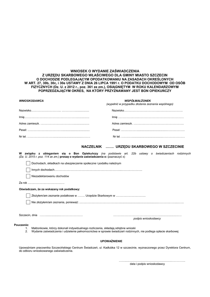 WNIOSEK O WYDANIE ZAŚWIADCZENIA Z URZĘDU SKARBOWEGO WŁAŚCIWEGO DLA GMINY MIASTO SZCZECIN O DOCHODZIE PODLEGAJĄCYM OPODATKOWANIU NA ZASADACH OKREŚLONYCH W ART. 27, 30b, 30c, i 30e USTAWY Z DNIA 26 LIPCA 1991 r. O PODATKU DOCHODOWYM OD OSÓB FIZYCZNYCH (Dz. U. z 2012 r., poz. 361 ze zm.), OSIĄGNIĘTYM W ROKU KALENDARZOWYM POPRZEDZAJĄCYM OKRES, NA KTÓRY PRZYZNAWANY JEST BON OPIEKUŃCZY WSPÓŁMAŁŻONEK (wypełnić w przypadku złożenia zeznania wspólnego) WNIOSKODAWCA Nazwisko………………………….. ……………................. Nazwisko……………………………….…………………….. Imię………………….……………………………................. Imię ………………….………………………………………… Adres zamieszk. ………………………………................... Adres zamieszk. ……………………………………………... Pesel: ……………………………….................................... Pesel: ……………….....................................………………. Nr tel. ……………………….....................................……… Nr tel. …………......................................…………………… NACZELNIK ……. URZĘDU SKARBOWEGO W SZCZECINIE W związku z ubieganiem się o Bon Opiekuńczy (na podstawie art. (Dz. U. 2015 r. poz. 114 ze zm.) proszę o wydanie zaświadczenia o: (zaznaczyć x) 22b ustawy o świadczeniach rodzinnych Dochodach, składkach na ubezpieczenie społeczne i podatku należnym Innych dochodach……………………………………………………………..………………….. Niezadeklarowaniu dochodów Za rok ………………………………… Oświadczam, że za wskazany rok podatkowy: Złożyłem/am zeznanie podatkowe w …….. Urzędzie Skarbowym w …………………..……… Nie złożyłem/am zeznania, ponieważ: ……………………………………..................................................…………….…..……. Szczecin, dnia ……...................…………………… …………………………………….……........................…. podpis wnioskodawcy Pouczenie: 1. Małżonkowie, którzy dokonali indywidualnego rozliczenia, składają odrębne wnioski 2. Wydanie zaświadczenia i udzielenie pełnomocnictwa w sprawie świadczeń rodzinnych, nie podlega opłacie skarbowej UPOWAŻNIENIE Upoważniam pracownika Szczecińskiego Centrum Świadczeń, ul. Kadłubka 12 w szczecinie, wyznaczonego przez Dyrektora Centrum, do odbioru wnioskowanego zaświadczenia. …….............................................................………….. data i podpis wnioskodawcy