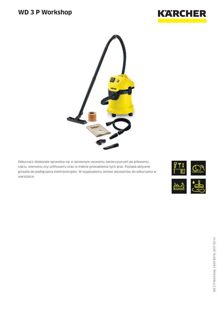 WD 3 P Workshop Odkurzacz doskonale sprawdza się w sprawnym usuwaniu zanieczyszczeń po piłowaniu, cięciu, wierceniu czy szlifowaniu oraz w trakcie prowadzenia tych prac. Posiada aktywne gniazdo do podłączania elektronarzędzi. W wyposażeniu zestaw akcesoriów do odkurzania w WD 3 P Workshop, 1.629-887.0, 2017-02-14 warsztacie. WD 3 P Workshop Praktyczna funkcja wydmuchu Dane techniczne 1.629-887.0 Numer katalogowy 4054278101873 Air Watt 200 Zużycie energii W 1000 Pojemność zbiornika l 17 Kabel zasilający m 4 Średnica wyposażenia mm 35 Ciężar kg 5,7 Wymiary (dł. x szer. x wys.) mm 388 × 340 × 502 Wyposażenie standardowe Wąż ssący m / mm Rury ssące 2 / 35 Demontowalny uchwyt szt. / m / mm 2 × 0,5 / 35 / Elementy z plastiku / – Ssawka uniwersalna Clips with 2 rubber and 2 brush inserts Filtr kartridżowy Standard Ssawka szczelinowa Papierowa torebka filtracyjna Pozycja parking Przechowywanie wyposażenia na urządzeniu Objęte dostawą. szt. 1 WD 3 P Workshop, 1.629-887.0, 2017-02-14 Elementy z plastiku Zbiornik Akcesoria dla WD 3 P Workshop 1.629-887.0 1 2 3 4 5 6 7 8 9 10 11 12 13 14 Numer katalogowy Cena Opis Filtr Wkład filtracyjny Cartridge 1 6.414-552.0 Papierowe torebki filtracyjne 2 6.959-130.0 Filtr typu Cartridge przeznaczony do odkurzania na sucho i mokro bez wymiany filtra. 5 wydajnych papierowych torebek filtracyjnych o dwóch warstwach. Wytrzymałe torebki doskonale zatrzymujące drobny pył. Zestawy wyposażenia Zestaw do podłączenia elektronarzędzi 3 2.863-112.0 Zestaw akcesoriów do odkurzania wnętrz samochodowych 4 2.863-225.0 Zestaw ssawek szczotkowych 5 2.863-221.0 Zestaw do odkurzania domu 6 2.863-002.0 Elastyczny wąż ssący o długości 1 m z adapterem do podłączenia elektronarzędzi (wyrzynarki, szlifierki, wiertarki itp.) Zapewnia czystość w warsztacie. Nowy zestaw akcesoriów do odkurzania wnętrza samochodu. Do czyszczenia bagażnika, deski rozdzielczej, siedzeń, kieszeni bocznych i dywaników. Zestaw ssawek szczotkowych przeznaczony do czyszczenia wnętrz samochodowych. W skład zestawu wchodzi ssawka z miękką i ssawka z twardą szczeciną. Zestaw akcesoriów do odkurzania w domu. Składa się ze ssawki podłogowej przełączanej do odkurzania podłóg twardych i dywanów oraz ssawki do tapicerki. Dysze Uniwersalna przełączana ssawka podłogowa 7 2.863-000.0 Długa ssawka szczelinowa 8 2.863-223.0 Ssawka samochodowa 9 2.863-145.0 Ssawka z twardą szczeciną Ssawka szczotkowa z miękką szczeciną 10 2.863-146.0 11 2.863-147.0 Ssawka uniwersalna przełączana przeznaczona zarówno do odkurzania podłóg twardych jak i wykładzin tekstylnych. Z zaczepem do "parkowania". Nowa przeprojektowana, bardzo długa i wąska ssawka szczelinowa. Poręczna ssawka samochodowa do szybkiego i łatwego czyszczenia - od dywaników po bagażnik. Ssawka do dokładnego czyszczenia tapicerki i wykładziny dywanowej w samochodzie. Bez problemu usuwa zaschnięte zabrudzenia. Ssawka z dodatkową miękką szczeciną do delikatnego czyszczenia wrażliwych powierzchni w samochodzie, np. deska rozdzielcza lub konsola środkowa. Specjalne zastosowania 12 2.863-139.0 Filtr popiołu / Filtr dużych zanieczyszczeń Premium 13 2.863-161.0 Przedłużka węża ssącego 3,5 m 14 2.863-001.0 Przedłużka rury ssącej, DN 35 mm 15 2.863-148.0 Pochłaniacz pyłu do WD 16 2.863-234.0 Objęte dostawą. Dostępne akcesoria. Filtr popiołu Basic składający się z 20-litrowego, metalowego zbiornika, elastycznego, metalowego węża o długości 1 m i metalowej rury ssącej. Filtr popiołu Premium składający się z 20-litrowego, metalowego zbiornika, elastycznego, metalowego węża o długości 1 m i metalowej rury ssącej oraz filtra drobnego pyłu. Przedłużka węża ssącego 3.5 m. Umożliwia swobodę ruchów i poszerza zasięg odkurzacza. Praktyczna przedłużka rury ssącej zapewniająca większy zasięg pracy. Przedłużenie rury ssącej do czyszczenia trudnodostępnych miejsc np. wysokie sufity. Nowe akcesorium do odkurzaczy WD umożliwia bezpyłowe wiercenie w ścianach i sufitach. Pył powstający podczas wiercenia w całości jest zasysany przez odkurzacz. WD 3 P Workshop, 1.629-887.0, 2017-02-14 Filtr popiołu / Filtr dużych zanieczyszczeń Basic