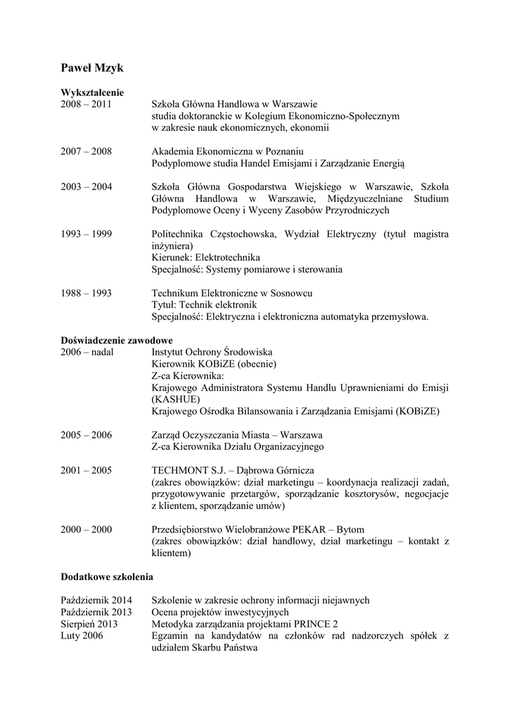 Paweł Mzyk Wykształcenie 2008 – 2011 Szkoła Główna Handlowa w Warszawie studia doktoranckie w Kolegium Ekonomiczno-Społecznym w zakresie nauk ekonomicznych, ekonomii 2007 – 2008 Akademia Ekonomiczna w Poznaniu Podyplomowe studia Handel Emisjami i Zarządzanie Energią 2003 – 2004 Szkoła Główna Gospodarstwa Wiejskiego w Warszawie, Szkoła Główna Handlowa w Warszawie, Międzyuczelniane Studium Podyplomowe Oceny i Wyceny Zasobów Przyrodniczych 1993 – 1999 Politechnika Częstochowska, Wydział Elektryczny (tytuł magistra inżyniera) Kierunek: Elektrotechnika Specjalność: Systemy pomiarowe i sterowania 1988 – 1993 Technikum Elektroniczne w Sosnowcu Tytuł: Technik elektronik Specjalność: Elektryczna i elektroniczna automatyka przemysłowa. Doświadczenie zawodowe 2006 – nadal Instytut Ochrony Środowiska Kierownik KOBiZE (obecnie) Z-ca Kierownika: Krajowego Administratora Systemu Handlu Uprawnieniami do Emisji (KASHUE) Krajowego Ośrodka Bilansowania i Zarządzania Emisjami (KOBiZE) 2005 – 2006 Zarząd Oczyszczania Miasta – Warszawa Z-ca Kierownika Działu Organizacyjnego 2001 – 2005 TECHMONT S.J. – Dąbrowa Górnicza (zakres obowiązków: dział marketingu – koordynacja realizacji zadań, przygotowywanie przetargów, sporządzanie kosztorysów, negocjacje z klientem, sporządzanie umów) 2000 – 2000 Przedsiębiorstwo Wielobranżowe PEKAR – Bytom (zakres obowiązków: dział handlowy, dział marketingu – kontakt z klientem) Dodatkowe szkolenia Październik 2014 Październik 2013 Sierpień 2013 Luty 2006 Szkolenie w zakresie ochrony informacji niejawnych Ocena projektów inwestycyjnych Metodyka zarządzania projektami PRINCE 2 Egzamin na kandydatów na członków rad nadzorczych spółek z udziałem Skarbu Państwa Luty 2006 Listopad 2005 Wrzesień 2002 Szkolenie dla kandydatów na członków rad nadzorczych spółek z udziałem Skarbu Państwa Prawo Zamówień Publicznych Auditor Wewnętrzny Systemu Jakości (Listopad 2004 – Warsztaty Doskonalące) Zainteresowania Ekologia, technika, sport.