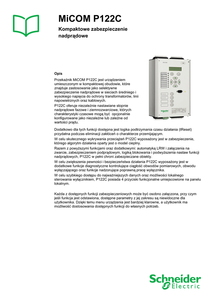 MiCOM P122C Kompaktowe zabezpieczenie nadprądowe Opis Przekaźnik MiCOM P122C jest urządzeniem umieszczonym w kompaktowej obudowie, które znajduje zastosowanie jako selektywne zabezpieczenie nadprądowe w sieciach średniego i wysokiego napięcia do ochrony transformatorów, linii napowietrznych oraz kablowych. P122C oferuje niezależnie nastawiane stopnie nadprądowe fazowe i ziemnozwarciowe, których charakterystyki czasowe mogą być opcjonalnie konfigurowane jako niezależne lub zależne od wartości prądu. Dodatkowo dla tych funkcji dostępna jest logika podtrzymania czasu działania (tReset) przydatna podczas eliminacji zakłóceń o charakterze przemijającym. W celu skutecznego wykrywania przeciążeń P122C wyposażony jest w zabezpieczenie, którego algorytm działania oparty jest o model cieplny. Razem z powyższymi funkcjami oraz dodatkowymi: automatyką LRW i załączenia na zwarcie, zabezpieczeniem podprądowym, logiką blokowania i podwyższenia nastaw funkcji nadprądowych, P122C w pełni chroni zabezpieczane obiekty. W celu zwiększenia pewności i bezpieczeństwa działania P122C wyposażony jest w dodatkowe funkcje diagnostyczne kontrolujące ciągłość obwodów pomiarowych, obwodu wyłączającego oraz funkcje nadzorujące poprawną pracę wyłącznika. W celu szybkiego dostępu do najważniejszych danych oraz możliwości lokalnego sterowania wyłącznikiem, P122C posiada 4 przyciski funkcjonalne umiejscowione na panelu lokalnym. Każda z dostępnych funkcji zabezpieczeniowych może być osobno załączona, przy czym jeśli funkcja jest odstawiona, dostępne parametry z jej zakresu są niewidoczne dla użytkownika. Dzięki temu menu urządzenia jest bardziej klarowne, a użytkownik ma możliwość dostosowania dostępnych funkcji do własnych potrzeb. Funkcje zabezpieczeniowe Zabezpieczenie nadprądowe fazowe zwłoczne (50/51) Zabezpieczenie to zrealizowane jest jako trójstopniowe, przy czym pierwsze dwa stopnie mogą być opcjonalnie skonfigurowane jako czasowo zależne (IDMT). Użytkownik ma wybór spośród 12 dostępnych charakterystyk czasowych. Trzeci stopień dostępny jest wyłącznie z charakterystyką niezależną DT. W celu wykrywania zakłóceń o charakterze przemijającym pierwsze dwa stopnie wyposażone są w logikę podtrzymania Charakterystyka czasowa Stałe i formuły (czas w sekundach) pobudzenia. Wyłączanie Rysunek 1: Parametry krzywych zależnych IDMT Kasowanie Zabezpieczenie nadprądowe ziemnozwarciowe zwłoczne (50N/51N) Podobnie jak zabezpieczenie fazowe, zabezpieczenie to zrealizowane jest jako trójstopniowe, przy czym pierwsze dwa stopnie mogą być opcjonalnie skonfigurowane jako czasowo zależne (IDMT). Użytkownik ma wybór spośród 12 dostępnych charakterystyk czasowych. Trzeci stopień dostępny jest wyłącznie z charakterystyką niezależną DT. Pierwsze dwa stopnie wyposażone są w logikę podtrzymania pobudzenia. Zabezpieczenie od asymetrii prądowej [46] Zabezpieczenie to zrealizowane jest jako dwustopniowe i oparte jest o wyliczanie składowej symetrycznej przeciwnej z mierzonych prądów fazowych. Pierwszy stopień może być opcjonalnie skonfigurowany jako czasowo zależny (IDMT). Użytkownik ma wybór spośród 11 dostępnych charakterystyk czasowych. Drugi stopień dostępny jest wyłącznie z charakterystyką niezależną DT. W celu wykrywania zakłóceń o charakterze przemijającym pierwszy stopień wyposażony jest w logikę podtrzymania pobudzenia. Logika podtrzymania pobudzenia Logika ta stosowana w funkcjach nadprądowych fazowej i ziemnozwarciowej, powoduje kontynuowanie naliczania czasu cząstkowych pobudzeń, jeśli następują one w konfigurowalnej przez użytkownika zwłoce czasowej. Zabezpieczenie przeciążeniowe [49] Zabezpieczenie to może być wykorzystywane do ochrony przed przeciążeniami linii kablowych i napowietrznych oraz transformatorów. Na podstawie pomiaru największej wartości prądu w danej fazie obliczany jest model cieplny zgodnie z DIN IEC 255-8. Czas do wyłączenia zależny jest od wartości stałej czasowej τ, wartości obciążenia: aktualnego Θp oraz krytycznego ΘTrip a także od współczynnika bezpieczeństwa k. Dostępny jest także drugi stopień konfigurowalny w zakresie obciążenia cieplnego alarmowego. 2 Zabezpieczenie podprądowe [37] Utrata obciążenia może być wykrywana dzięki jednemu progowi podprądowemu pracującemu z charakterystyką czasową niezależną. Funkcja ta jest zablokowana, gdy wyłącznik jest otwarty. Stan otwarty wyłącznika może być rozpoznawany na podstawie kontroli jego styków pomocniczych lub poprzez pomiar prądu obciążenia. Pozostałe zabezpieczenia i funkcje kontrolne LRW (50BF) Wraz z sygnałem wyłączającym uruchamiana jest ustawiana przez użytkownika zwłoka czasowa, po upływie której sprawdzana jest wartość 3 prądów fazowych. Wartość ta, mniejsza od nastawionej, odzwierciedla stan wyłącznika „otwarty”. W przeciwnym przypadku (mierzone prądy większe od nastawionej wartości) generowany jest sygnał o niesprawności wyłącznika. Załączenie na zwarcie (ZAZW) Funkcja ta realizuje bezzwłoczne wyłączenie w przypadku próby ręcznego załączenia wyłącznika na istniejące warunki zakłóceniowe. W zależności od konfiguracji, warunkami zakłóceniowymi mogą być: sygnał ogólnego pobudzenia lub pobudzenie stopnia nadprądowego w dowolnej fazie. Blokowanie ponownego załączenia Wszystkie przekaźniki pomocnicze mogą być podtrzymane po ich zadziałaniu. Dodatkowo można wyodrębnić funkcje zabezpieczeniowe, które po zadziałaniu powodować będą podtrzymanie przekaźnika wyłączającego RL1. Pierwsze załączenie (zimny rozruch) Wykorzystanie tej funkcji pozwala na podniesienie progów działania funkcji nadprądowych oraz od asymetrii na określony przez użytkownika czas. Manewr taki zapobiega niepożądanym wyłączeniom, które mogą być spowodowane załączeniem do pracy silnika lub transfo
