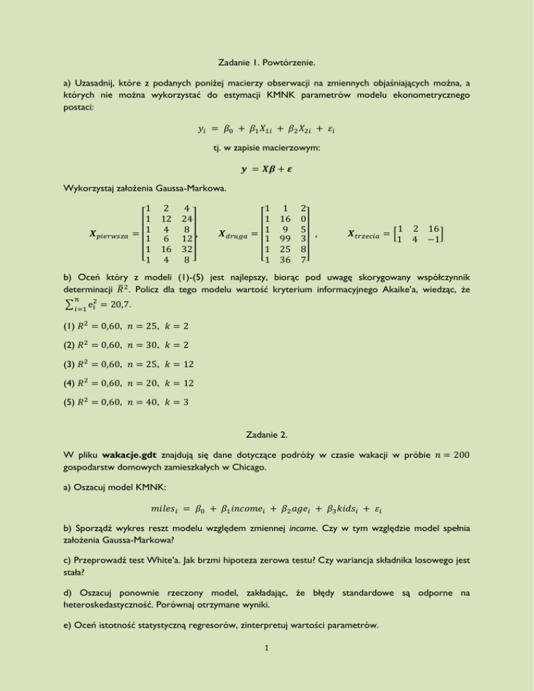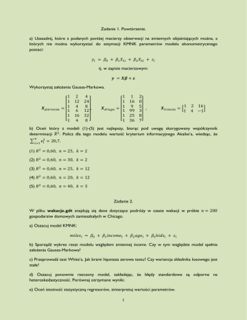 Zadanie 1. Powtórzenie. a) Uzasadnij, które z podanych poniżej macierzy obserwacji na zmiennych objaśniających można, a których nie można wykorzystać do estymacji KMNK parametrów modelu ekonometrycznego postaci: 𝑦𝑖 = 𝛽0 + 𝛽1 𝑋1𝑖 + 𝛽2 𝑋2𝑖 + 𝜀𝑖 tj. w zapisie macierzowym: 𝒚 = 𝑿𝜷 + 𝜺 Wykorzystaj założenia Gaussa-Markowa. 𝑿𝑝𝑖𝑒𝑟𝑤𝑠𝑧𝑎 1 2 1 12 = 1 4 1 6 1 16 [1 4 4 24 8 , 12 32 8] 𝑿𝑑𝑟𝑢𝑔𝑎 1 1 = 1 1 1 [1 1 16 9 99 25 36 2 0 5 , 3 8 7] 𝑿𝑡𝑟𝑧𝑒𝑐𝑖𝑎 = [ 1 2 16 ] 1 4 −1 b) Oceń który z modeli (1)-(5) jest najlepszy, biorąc pod uwagę skorygowany współczynnik determinacji 𝑅̅ 2. Policz dla tego modelu wartość kryterium informacyjnego Akaike’a, wiedząc, że 𝑛 ∑𝑖=1 e2i = 20,7. (1) 𝑅 2 = 0,60, 𝑛 = 25, 𝑘 = 2 (2) 𝑅 2 = 0,60, 𝑛 = 30, 𝑘 = 2 (3) 𝑅 2 = 0,60, 𝑛 = 25, 𝑘 = 12 (4) 𝑅 2 = 0,60, 𝑛 = 20, 𝑘 = 12 (5) 𝑅 2 = 0,60, 𝑛 = 40, 𝑘 = 3 Zadanie 2. W pliku wakacje.gdt znajdują się dane dotyczące podróży w czasie wakacji w próbie 𝑛 = 200 gospodarstw domowych zamieszkałych w Chicago. a) Oszacuj model KMNK: 𝑚𝑖𝑙𝑒𝑠𝑖 = 𝛽0 + 𝛽1 𝑖𝑛𝑐𝑜𝑚𝑒𝑖 + 𝛽2 𝑎𝑔𝑒𝑖 + 𝛽3 𝑘𝑖𝑑𝑠𝑖 + 𝜀𝑖 b) Sporządź wykres reszt modelu względem zmiennej income. Czy w tym względzie model spełnia założenia Gaussa-Markowa? c) Przeprowadź test White’a. Jak brzmi hipoteza zerowa testu? Czy wariancja składnika losowego jest stała? d) Oszacuj ponownie rzeczony model, zakładając, że błędy standardowe są odporne na heteroskedastyczność. Porównaj otrzymane wyniki. e) Oceń istotność statystyczną regresorów, zinterpretuj wartości parametrów. 1 Zadanie 3. Użyj danych z pliku edukacja.gdt do oszacowania zwrotu z edukacji: ℎ𝑟𝑤𝑎𝑔𝑒𝑖 = 𝛽0 + 𝛽1 𝑒𝑑𝑢𝑐𝑎𝑡𝑖𝑜𝑛𝑖 + 𝛽2 𝑎𝑔𝑒𝑖 + 𝜀𝑖 a) Zbadaj heteroskedastyczność przy użyciu testu White’a. Zinterpretuj wynik. b) Oszacuj model z wykorzystaniem odpornych błędów standardowych. Porównaj wyniki. c*) Oszacuj model przy użyciu uogólnionej metody najmniejszych kwadratów. Porównaj wyniki. d) Pomyśl nad poprawnością postaci funkcyjnej zmiennej 𝑎𝑔𝑒. e) Oceń dobroć dopasowania do danych obu modeli. Z jakich miar skorzystasz? Zadanie 4. Dane z pliku krzywa_phillipsa.gdt umożliwiają empiryczną weryfikację krzywej Phillipsa w latach 1958-2004. a) Oszacuj model: 𝑖𝑛𝑓𝑙𝑡 = 𝛽0 + 𝛽1 𝑢𝑛𝑒𝑚𝑝𝑙𝑜𝑦𝑡𝑡 + 𝜀𝑡 Oceń istność statystyczną zmiennej 𝑢𝑛𝑒𝑚𝑝𝑙𝑜𝑦𝑡. b) Przy użyciu testu mnożnika Durbina-Watsona oraz Lagrange’a sprawdź, czy w modelu występuje autokorelacja rzędu 1. Możesz skorzystać z tablicy.pdf statystyk d Durbina-Watsona. c) Po krytyce E. Phelpsa i M. Friedmana zaczęto rozpatrywać rolę oczekiwań dotyczących stopy inflacji. Rozważ oczekiwania adaptacyjne: 𝑖𝑛𝑓𝑙𝑡 = 𝛼0 + 𝛼1 𝑢𝑛𝑒𝑚𝑝𝑙𝑜𝑦𝑡𝑡 + 𝛼2 𝑖𝑛𝑓𝑙𝑡−1 + 𝜉𝑡 Zinterpretuj istotność statystyczną zmiennych. d) Czy w rzeczonym modelu z uwzględnionymi oczekiwaniami adaptacyjnymi występuje problem autokorelacji rzędu 1? Pamiętaj, że w modelu znajduje się opóźniona zmienna objaśniana, stąd nie można w tym przypadku stosować testu Durbina-Watsona. 2