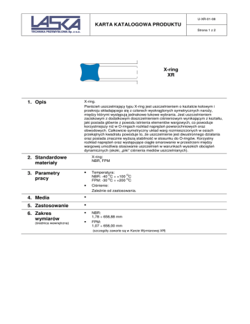 U-XR-01-08 KARTA KATALOGOWA PRODUKTU Strona 1 z 2 X-ring XR 1. Opis X-ring. Pierścień uszczelniający typu X-ring jest uszczelnieniem o kształcie kołowym i przekroju składającego się z czterech wyokrąglonych symetrycznych naroży, między którymi występują jednakowe łukowe wybrania. Jest uszczelnieniem zaciskowym z dodatkowym doszczelnieniem ciśnieniowym wynikającym z kształtu, jaki posiada głównie z powodu istnienia elementów wargowych, co powoduje korzystniejszy niż w O-ringach rozkład naprężeń powierzchniowych oraz obwodowych. Całkowicie symetryczny układ warg rozmieszczonych w osiach przekątnych kwadratu powoduje to, że uszczelnienie jest dwustronnego działania oraz posiada znacznie wyższą stabilność w stosunku do O-ringów. Korzystny rozkład naprężeń oraz występujące ciągłe smarowanie w przestrzeni między wargowej umożliwia stosowanie uszczelnień w warunkach wysokich obciążeń dynamicznych (skoki, „piki” ciśnienia mediów uszczelnianych). X-ring: NBR, FPM 2. Standardowe materiały 3. Parametry pracy 4. Media 5. Zastosowanie 6. Zakres wymiarów (średnica wewnętrzna) Temperatura: O O NBR: -40 C ÷ +100 C O O FPM: -30 C ÷ +200 C Ciśnienie: Zależnie od zastosowania. NBR: 1,78 ÷ 658,88 mm FPM: 1,07 ÷ 658,00 mm (szczegóły zawarte są w Karcie Wymiarowej XR) U-XR-01-08 KARTA KATALOGOWA PRODUKTU Strona 2 z 2 7. Powiązane normy U-XR-A-18-30-5-NB 8. Przykład zamówienia Rodzaj uszczelnienia 9. Uwagi Typ budowy Średnica wewnętrzna Średnica zewnętrzna Grubość Rodzaj elastomeru Istnieje możliwość zaoferowania niniejszego produktu o wymiarach i z materiałów nie ujętych w tej karcie jednak może się to wiązać z koniecznością zamówienia minimalnych ilości określonych przez dostawcę. Niniejsza karta katalogowa służy do opisu naszych produktów. Zawarte w niej informacje nie gwarantują przydatności w określonych zastosowaniach. Wytrzymałość oraz zużycie opisywanego produktu zależne są od specyficznych wpływów środowiska, dlatego wszystkie podane obliczenia i parametry mogą być jedynie wartościami orientacyjnymi. Zalecamy dokonania stosownych prób przez użytkownika.