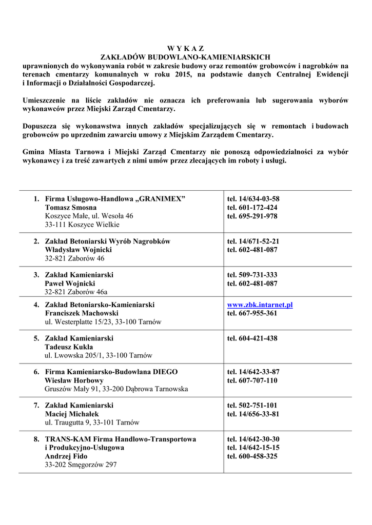 WYKAZ ZAKŁADÓW BUDOWLANO-KAMIENIARSKICH uprawnionych do wykonywania robót w zakresie budowy oraz remontów grobowców i nagrobków na terenach cmentarzy komunalnych w roku 2015, na podstawie danych Centralnej Ewidencji i Informacji o Działalności Gospodarczej. Umieszczenie na liście zakładów nie oznacza ich preferowania lub sugerowania wyborów wykonawców przez Miejski Zarząd Cmentarzy. Dopuszcza się wykonawstwa innych zakładów specjalizujących się w remontach i budowach grobowców po uprzednim zawarciu umowy z Miejskim Zarządem Cmentarzy. Gmina Miasta Tarnowa i Miejski Zarząd Cmentarzy nie ponoszą odpowiedzialności za wybór wykonawcy i za treść zawartych z nimi umów przez zlecających im roboty i usługi. 1. Firma Usługowo-Handlowa „GRANIMEX” Tomasz Smosna Koszyce Małe, ul. Wesoła 46 33-111 Koszyce Wielkie tel. 14/634-03-58 tel. 601-172-424 tel. 695-291-978 2. Zakład Betoniarski Wyrób Nagrobków Władysław Wojnicki 32-821 Zaborów 46 tel. 14/671-52-21 tel. 602-481-087 3. Zakład Kamieniarski Paweł Wojnicki 32-821 Zaborów 46a tel. 509-731-333 tel. 602-481-087 4. Zakład Betoniarsko-Kamieniarski Franciszek Machowski ul. Westerplatte 15/23, 33-100 Tarnów www.zbk.intarnet.pl tel. 667-955-361 5. Zakład Kamieniarski Tadeusz Kukla ul. Lwowska 205/1, 33-100 Tarnów tel. 604-421-438 6. Firma Kamieniarsko-Budowlana DIEGO Wiesław Horbowy Gruszów Mały 91, 33-200 Dąbrowa Tarnowska tel. 14/642-33-87 tel. 607-707-110 7. Zakład Kamieniarski Maciej Michałek ul. Traugutta 9, 33-101 Tarnów tel. 502-751-101 tel. 14/656-33-81 8. TRANS-KAM Firma Handlowo-Transportowa i Produkcyjno-Usługowa Andrzej Fido 33-202 Smęgorzów 297 tel. 14/642-30-30 tel. 14/642-15-15 tel. 600-458-325 9. Zakład Betoniarski Krzysztof Fedek Biadoliny Radłowskie 4, 32-828 Biadoliny Radłowskie tel. 14/679-14-89 tel. 602-376-241 10. Kamieniarstwo Nagrobkowe „GRANI LAST” Strojek Paweł ul. Błonie 59, 33-100 Tarnów tel. 14/ 623-23-62 tel. 601-507-262 tel. 603-930-182 11. Zakład Kamieniarski „SKAŁA” Bogdan Prażuch 33-250 Otfinów Kłyż 104 ul. Legionistów 13, 33-200 Dąbrowa Tarnowska tel. 600-237-425 tel. 14/645-24-17 12. Firma OMEGA inż. Kazimierz Krawczyk 33-156 Skrzyszów 332 ul. Na Łąkach 4/3, 33-100 Tarnów tel. 14/674-52-36 tel. 603-260-676 13. Zakład Budowlano-Kamieniarski GRANMAR Marcin Krzemiński ul. Konopnickiej 43, 32-830 Wojnicz tel. 889-225-433 14. MARMOPOL Dariusz Łączak Bobrowa 230, 39-203 Nagoszyn tel. 501-601-115 15. Zakład Kamieniarsko-Budowlany „GRANITEX” Jacek Krzak ul. Kolejowa 23, 33-131 Łęg Tarnowski tel. 601-406-857 16. Kamieniarstwo Stanisław Partyka Stanisław Partyka 33-271 Jadowniki Mokre 5 tel. 601-874-770 14/641-75-72 17. Kamieniarstwo Strojny Sławomir Strojny 33-121 Bogumiłowice 238 tel. 791-390-884 18. Wykonanie i Remonty Grobowców i Nagrobków Michalski Adam ul. Burtnicza 6/8, 33-100 Tarnów tel. 14/696-51-50 tel. 606-220-354 19. Zakład Kamieniarsko-Betoniarski Nowak Sylwester ul. Warszawska 91, 33-240 Żabno tel. 14/645-64-42 tel. 609-255-181 20. Zakład Kamieniarski-Usługi Ogólno-Budowlane Andrzej Skrężyna Burzyn 199B, 33-170 Tuchów tel. 696-207-826 21. Usługi Kamieniarsko-Lastrikowe Piotr Wabno Dąbrówki Breńskie 9A, 33-210 Olesno tel. 607-740-300 tel. 14/641-11-92 22. Zakład Rzemieślniczy MURARSTWO tel. 14/622-36-87 budowa, naprawa i konserwacja grobowców oraz tel. 604-629-484 usługi transportowe Ludwik Tyrka ul. Bema 18/6, 33-100 Tarnów 23. „WIEMAL” Wiesław Martyński 32-821 Zaborów 163 tel. 14/671-53-74 tel. 604-142-644 24. Zakład Kamieniarski – Usługi pogrzebowe Wiesław Witek Rzepiennik Biskupi 178, 33-163 Rzepiennik Strzyżewski tel. 14/ 653-01-88 tel. 600-164-934 25. Usługi Kamieniarskie Jacek Świegoda Burzyn 198, 33-170 Tuchów tel. 14/652-60-56 tel. 600-720-607 26. Zakład Betoniarsko-Lastrikarski Rafał Wielgus ul. Starodąbrowska 15/39, 33-100 Tarnów tel. 14/626-11-91 tel. 668-524-813 27. Paweł Łakoma Nowe Żukowice 59, 33-151 Nowa Jastrząbka tel. 14/678-61-21 tel. 694-024-327 28. Firma Produkcyjno-Handlowo-Usługowa Leszek Tubek 38 – 322 Łużna 606 www.tubek.prv.pl tel. 14/625-17-17 tel. 18/354-30-19