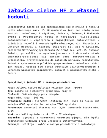 Jałowice cielne HF z własnej hodowli Gospodarstwo nasze od lat specjalizuje się w chowie i hodowli bydła mlecznego rasy HF. Gospodarstwo jest pod stałą oceną wartości hodowlanej i użytkowej Polskiej Federacji Hodowców Bydła i Producentów Mleka w Warszawie. Wieloletnie doświadczenie i współpraca z największymi autorytetami w dziedzinie hodowli i rozrodu bydła mlecznego, min. Mazowieckim Centrum Hodowli i Rozrodu Zwierząt Sp. zoo w Łowiczu, Gabinetem Weterynaryjnym Rozrodu Zwierząt lek. wet. M. Skowron Żółwin, pozwoliła na wyselekcjonowanie i dobranie stada charakteryzującego się bardzo dobą zdrowotnością i wydajnością, przystosowanego do polskich warunków hodowlanych. Jałowice wyhodowane w polskich gospodarstwach hodowlach takich jak nasze, cieszą się coraz większym zainteresowaniem i uznaniem wiodących gospodarstw rolnych i producentów mleka w Polsce. Specyfikacje jałowic HF z naszego gospodarstwa Rasa: Jałówki cielne Holstein Friesian (min. 75%HF) Typ: zgodne są z mlecznym typem krów rasy HF Cielność: 5-8 miesięcy przy zakupie Waga: min. waga – 500 kg. Wydajność matki: pierwsza laktacja min. 5500 kg mleka lub kolejna 6500 kg mleka lub kolejna 7000 kg mleka; Parametry: zawartość tłuszczu min. 3,5%, zawartość białka min. 3,0% Wiek: w chwili wycielenia ok. 25 – 32 miesiące. Badania: zgodnie z warunkami weterynaryjnymi dla bydła hodowlanego wydanymi przez Inspekcję Weterynaryjną. Selekcja: selekcja i wybór w naszym gospodarstwie hodowlanym W stałej sprzedaży posiadamy kilkadziesiąt sztuk zwierząt do wyboru. Istnieje możliwość osobistej selekcji i wyboru jałowic w gospodarstwie. Na życzenie wysyłamy drogą elektroniczną zdjęcia i dokumentację oferowanych zwierząt. Na zakupione zwierzęta hodowlane istnieje możliwość uzyskania kredytu w bankach, instytucjach finansowych oraz za pośrednictwem mleczarni współpracujących z nami. Okres kredytowania do 5 lat. Decyzja kredytowa podejmowana nawet w ciągu 1 godziny. W rozliczeniu oferujemy odkup bydła rzeźnego oraz płodów rolnych jak również wymianę towar za towaru tzw. barter. W celu uzyskania szczegółowych informacji proszę zadzwonić Tel. 600 605 307 606 402 100 lub wysłać zapytanie: e-mail: [email protected]