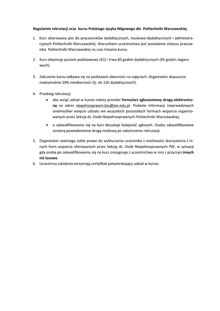 Regulamin rekrutacji oraz kursu Polskiego Języka Migowego dla Politechniki Warszawskiej 1. Kurs skierowany jest do pracowników dydaktycznych, naukowo-dydaktycznych i administracyjnych Politechniki Warszawskiej. Warunkiem uczestnictwa jest posiadanie statusu pracownika Politechniki Warszawskiej na czas trwania kursu. 2. Kurs obejmuje poziom podstawowy (A1) i trwa 60 godzin dydaktycznych (45 godzin zegarowych). 3. Zaliczenie kursu odbywa się na podstawie obecności na zajęciach. Organizator dopuszcza maksymalnie 20% nieobecności (tj. do 12h dydaktycznych). 4. Przebieg rekrutacji: aby wziąć udział w kursie należy przesłać formularz zgłoszeniowy drogą elektroniczną na adres [email protected]. Podanie informacji nieprawdziwych uniemożliwi wzięcie udziału we wszystkich pozostałych formach wsparcia organizowanych przez Sekcję ds. Osób Niepełnosprawnych Politechniki Warszawskiej, o zakwalifikowaniu się na kurs decyduje kolejność zgłoszeń. Osoby zakwalifikowane zostaną powiadomione drogą mailową po zakończeniu rekrutacji. 5. Organizator zastrzega sobie prawo do wykluczenia uczestnika z możliwości skorzystania z innych form wsparcia oferowanych przez Sekcję ds. Osób Niepełnosprawnych PW, w sytuacji gdy osoba po zakwalifikowaniu się na kurs zrezygnuje z uczestnictwa w nim z przyczyn innych niż losowe. 6. Uczestnicy szkolenia otrzymają certyfikat potwierdzający udział w kursie.