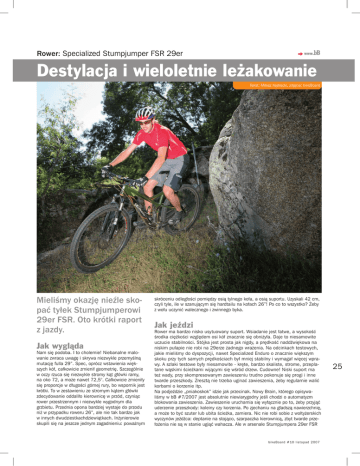 Rower: Specialized Stumpjumper FSR 29er Destylacja i wieloletnie leżakowanie Tekst: Miłosz Kędracki, zdjęcia: bikeBoard Mieliśmy okazję nieźle skopać tyłek Stumpjumperowi 29er FSR. Oto krótki raport z jazdy. Jak wygląda Nam się podoba. I to cholernie! Niebanalne malowanie zwraca uwagę i skrywa niezwykle przemyślną mutację fulla 29”. Spec, oprócz wstawienia większych kół, całkowicie zmienił geometrię. Szczególnie w oczy rzuca się niezwykle stromy kąt główki ramy, na oko 72, a może nawet 72,5°. Całkowicie zmieniły się proporcje w długości górnej rury, bo wspornik jest krótki. To w zestawieniu ze stromym kątem główki zdecydowanie oddaliło kierownicę w przód, czyniąc rower przestrzennym i niezwykle wygodnym dla grzbietu. Przednia opona bardziej wystaje do przodu niż w przypadku roweru 26”, ale nie tak bardzo jak w innych dwudziestkachdziewiątkach. Inżynierowie skupili się na jeszcze jednym zagadnieniu: poważnym skróceniu odległości pomiędzy osią tylnego koła, a osią suportu. Uzyskali 42 cm, czyli tyle, ile w szanującym się hardtailu na kołach 26”! Po co to wszystko? Żeby z wołu uczynić walecznego i zwinnego byka. Jak jeździ Rower ma bardzo nisko usytuowany suport. Wsiadanie jest łatwe, a wysokość środka ciężkości względem osi kół znacznie się obniżyła. Daje to niesamowite uczucie stabilności. Stójka jest prosta jak nigdy, a prędkość naddźwiękowa na niskim pułapie nie robi na 29erze żadnego wrażenia. Na odcinkach testowych, jakie mieliśmy do dyspozycji, nawet Specialized Enduro o znacznie większym skoku przy tych samych prędkościach był mniej stabilny i wymagał więcej wprawy. A szlaki testowe były niesamowite - kręte, bardzo skaliste, strome, przeplatane wąskimi ścieżkami wijącymi się wśród drzew. Cudowne! Niski suport ma też wady, przy skompresowanym zawieszeniu trudno pokonuje się progi i inne twarde przeszkody. Zresztą nie trzeba uginać zawieszenia, żeby regularnie walić korbami o korzenie itp. Na podjeździe „pniakoskok” idzie jak przecinak. Nowy Brain, którego opisywaliśmy w bB #7/2007 jest absolutnie niewiarygodny jeśli chodzi o automatyzm blokowania zawieszenia. Zawieszenie uruchamia się wyłącznie po to, żeby przyjąć uderzenie przeszkody: koleiny czy korzenia. Po zjechaniu na gładszą nawierzchnię, a może to być szuter lub ubita ścieżka, zamiera. Nic nie robi sobie z woltyżerskich wyczynów jeźdźca: deptanie na stojąco, szarpaczka kierownicą, zbyt twarde przełożenia nie są w stanie ugiąć wahacza. Ale w arsenale Stumpjumpera 29er FSR bi k e Boa rd # 1 0 list o p a d 2 0 0 7 25 Sztywności bocznej olbrzymiemu wahaczowi nadaje stylowa i potężna odkówka Bolączką „tłentynajnerów” są nieprecyzyjnie działające przednie przerzutki. Spec na sztywno połączył korpus przerzutki E do wahacza, nazywa tę technologię DMD. Ułatwia to montaż przerzutki względem suportu i zapewnia odpowiedni, inny niż w przypadku 26” kół, kąt natarcia wodzika Charakterystycznie wygięta „szyja” to nie zabieg stylistyczny. Dzięki temu głowica widelca i pokrętła nie uderzają o ramę. Spec zawsze dbał o stronę graficzną swoich rowerów, ale niebanalna grafika i odważny dobór kolorów komponentów, np. pancerzy czy dodatków w 29erze bardzo przypadł nam do gustu Specialized Stumpjumper FSR 29 Kontakt: 69 Company, www.specialized.cz Cena: 12 999 zł są jeszcze koła o dużej średnicy. One dodatkowo czynią jazdę komfortową i lepiej przylegając do nawierzchni wspomagają podjeżdżanie i hamowanie. 29er wjedzie wszędzie. Zawieszenie ma 100 mm skoku z przodu i z tyłu, ale odczuwa się jakby było go o 30% więcej. Ale jak wiemy, są takie dziedziny, w których przewaga kół 26” jest oczywista. Łatwość rozpędzania, zmiany tempa, długie podjazdy, no cóż odpowiednik cenowy tego modelu zbudowany na kołach 26” będzie w powyższych dziedzinach sprawdzał się lepiej. Będzie też tańszy. Ale zanim zdecydujecie, przeczytajcie jeszcze dziesięć zdań. 26 Jak skręca Znaczne skrócenie tylnego widelca w tym rowerze całkiem zmieniło nasze zapatrywanie na skrętność „tłentynajnerów”. Na agrafkach Stumpjumper 29er FSR jest zwrotniejszy niż enduro z dwupółkowym widelcem i pozwala na płynne i szybsze ich pokonywanie! Zwiększenie wartości kąta główki ramy sprawiło, że szybkie wchodzenie w zakręty jest niemalże tak proste, jak w wypadku klasyka MTB na 26” kołach. Mimo testowania roweru z widelcem Reba, bez modnego ostatnio większego wyprzedzenia osi koła od osi obrotu widelca, Spec był bardzo przewidywalny, nawet na bardzo szybko pokonywanych zakrętach. No a dzięki niezwykle krótkiemu ogonowi wystarczyło zainicjować skręt i złożyć się w zakręcie, żeby rower wykonał naszą ulubioną sztuczkę i zacieśnił pod koniec promień zakrętu. bi k eB oar d #1 0 l i stopad 2007 Tego wahacza nie sposób pomylić z żadnym innym: ogniwo Horsta i amortyzator Specialized AFR ze zdalnym czujnikiem Trail Tune, pozwalającym indywidualnie dobrać czułość amortyzacji do potrzeb użytkownika Rama: aluminium FSR M5 Rozmiary: M, L, XL, XXL Geometria: rozmiar testowany: 483 mm - L Baza kół: 1166 mm Długość tylnego widelca: 448 mm Długość górnej rury: 630 mm Kąt główki ramy: 69.5° Kąt rury podsiodłowej: 71° (74.5° efekt.) Skok amortyzacji: przód: 100 mm, tył: 105 mm Przedni widelec: Rock Shox Reba SL 29 Damper: Specialized AFR Brain Fade Piasty: Specialized Hi Lo Disc / DT Swiss 370 Obręcze: DT Swiss X470 Opony: Specialized S-Works The Capitan 2.0 Korby: Shimano XT 44/32/22T Kaseta: Shimano CS-HG-50 (11-34) 9-rz. Łańcuch: SRAM PC-971 Przerzutka przód: Shimano LX Przerzutka tył: SRAM X.0 Manetki: SRAM X.9 Trigger Klamki: Avid Ultimate 7 Custom Hamulce: Avid Ultimate 7 Custom 203/185 mm Łożyska sterów: aheadset Wspornik kierownicy: Specialized Kierownica: Specialized (640 mm) Wspornik siode