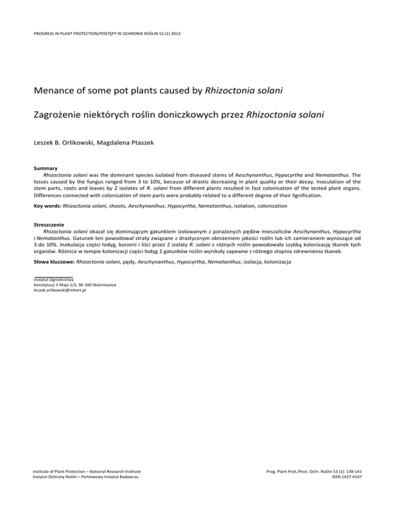 PROGRESS IN PLANT PROTECTION/POSTĘPY W OCHRONIE ROŚLIN 53 (1) 2013 Menance of some pot plants caused by Rhizoctonia solani Zagrożenie niektórych roślin doniczkowych przez Rhizoctonia solani Leszek B. Orlikowski, Magdalena Ptaszek Summary Rhizoctonia solani was the dominant species isolated from diseased stems of Aeschynanthus, Hypocyrtha and Nematanthus. The losses caused by the fungus ranged from 3 to 10%, because of drastic decreasing in plant quality or their decay. Inoculation of the stem parts, roots and leaves by 2 isolates of R. solani from different plants resulted in fast colonisation of the tested plant organs. Differences connected with colonisation of stem parts were probably related to a different degree of their lignification. Key words: Rhizoctonia solani, shoots, Aeschynanthus, Hypocyrtha, Nematanthus, isolation, colonization Streszczenie Rhizoctonia solani okazał się dominującym gatunkiem izolowanym z porażonych pędów mieszańców Aeschynanthus, Hypocyrtha i Nematanthus. Gatunek ten powodował straty związane z drastycznym obniżeniem jakości roślin lub ich zamieraniem wynoszące od 3 do 10%. Inokulacja części łodyg, korzeni i liści przez 2 izolaty R. solani z różnych roślin powodowała szybką kolonizację tkanek tych organów. Różnice w tempie kolonizacji części łodyg 2 gatunków roślin wynikały zapewne z różnego stopnia zdrewnienia tkanek. Słowa kluczowe: Rhizoctonia solani, pędy, Aeschynanthus, Hypocyrtha, Nematanthus, izolacja, kolonizacja Instytut Ogrodnictwa Konstytucji 3 Maja 1/3, 96‐100 Skierniewice [email protected] Institute of Plant Protection – National Research Institute Instytut Ochrony Roślin – Państwowy Instytut Badawczy Prog. Plant Prot./Post. Ochr. Roślin 53 (1): 138‐141 ISSN 1427‐4337 Progress in Plant Protection/Postępy w Ochronie Roślin 53 (1) 2013 Wstęp / Introduction 139 Wzrastający międzynarodowy obrót materiałem roślinnym w minionym 20-leciu oraz bardzo szybko powiększająca się liczba roślin uzyskiwanych z sadzonek powoduje, że w uprawach roślin pod osłonami pojawiają się nowe zagrożenia powodowane m.in. przez gatunki rodzaju Phytophthora i Cylindrocladium scoparium (Orlikowski i wsp. 2010; Orlikowski i Ptaszek 2011). W ostatnich latach również gatunek Rhizoctonia solani pojawia się coraz częściej w uprawie roślin doniczkowych, w tym na mieszańcach Aeschynanthus, Hypocyrtha i Nematanthus. Pierwsze objawy, w formie wydłużonych, brązowych plam stopniowo czerniejących i rozszerzających się na obwodzie, obserwowano u nasady lub w wyższej partii pędów, gdy stykały się one z podłożem. Objawy rozszerzały się na kolejne pędy. Prowadziło to do żółknięcia, brązowienia łodyg i liści, a następnie zamierania części lub całych pędów. Celem przeprowadzonych badań było określenie zagrożenia związanego z występowaniem omawianego czynnika chorobotwórczego na 3 wymienionych gatunkach roślin. Zainfekowane pędy, najczęściej z pierwszymi objawami choroby, pobierano do worków foliowych i przewożono do laboratorium. Izolację mikroorganizmów, zasiedlających porażone tkanki prowadzono stosując metodę opisaną przez Orlikowskiego i Szkutę (2002). Fragmenty roślin po wypłukaniu i powierzchniowej sterylizacji nad płomieniem palnika wykładano na pożywkę PDA (Potato Dextrose Agar). Kultury patogenów wyrastające wokół wyłożonych tkanek przeszczepiano na czyste szalki z pożywką PDA. Identyfikację kultur do rodzajów i gatunków przeprowadzono w oparciu o dostępne klucze. Ocenę chorobotwórczości izolatów R. solani, uzyskanych z Aeschynanthus i Nematanthus przeprowadzono na częściach łodyg, liściach i korzeniach tych roślin, stosując metodę opisaną przez Orlikowskiego i Szkutę (2002). Fragmenty roślin umieszczano w kuwetach wyłożonych wilgotną bibułą filtracyjną i przykrytą nylonową siatką, a następnie inokulowano 3 mm krążkami pożywki PDA przerośniętej strzępkami badanego patogena. Pomiarów rozwoju nekrozy dokonywano po 8 dniach inkubacji. Doświadczenia założono w układzie całkowicie losowym w 4 powtórzeniach po 5 części roślin i powtórzono je 2-krotnie. Materiały i metody / Materials and methods Wyniki i dyskusja / Results and discussion W latach 2010–2011 prowadzono obserwacje zdrowotności upraw doniczkowych w 4 obiektach szklarniowych, notując straty powodowane przez czynniki chorobotwórcze oraz pobierając do badań laboratoryjnych rośliny z objawami zgnilizny podstawy pędów. W jednym z obiektów, specjalizujących się w ukorzenianiu sadzonek z przeznaczeniem na obrót krajowy i w około 50% również na eksport, stwierdzono zamieranie pojedynczych pędów, a rzadziej całych roślin mieszańców Aeschynanthus, Hypocyrtha i Nematanthus. Obserwacje strat powodowanych przez R. solani w nasadzeniach 3 gatunków roślin wykazały, że były one zróżnicowane w zależności od roku badań i upraw (rys. 1). W 2010 roku straty te wynosiły od 3 do 5%, natomiast już w następnym roku dochodziły do 10% (rys. 1). Przyczyną rosnących strat było zapewne pobieranie sadzonek z roślin z niewidocznymi jeszcze objawami rizoktoniozy i przenoszenie patogena do mnożarki, a następnie na parapety, gdzie uprawiano rośliny do obrotu handlowego. Rys. 1. Straty w uprawie 3 gatunków roślin doniczkowych powodowane przez R. solani Fig. 1. Losses in 3 plant pot species production caused by R. solani 140 Menance of pot plants by R. solani / Zagrożenie roślin doniczkowych przez R. solani Analiza mikologiczna fragmentów porażonych pędów, pobranych z 3 gatunków roślin, wykazała występowanie na większości z nich R. solani. Obok tego gatunku izolowano: Alternaria alternata, Botrytis cinerea, Fusarium oxysporum, gatunki rodzajów: Penicillium i Rhizopus oraz Trichoderma. Inokulacja części łodyg liści i korzeni Aeschynanthus, krążkami pożywki przerośniętymi strzępkami izolatów R. solani powodow