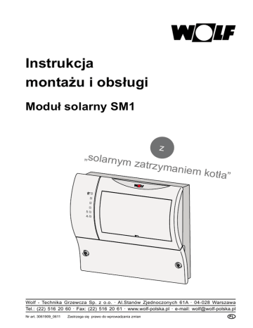 Instrukcja montażu i obsługi Moduł solarny SM1 z „solarny m zatrzy maniem kotła” Wolf - Technika Grzewcza Sp. z o.o. · Al.Stanów Zjednoczonych 61A · 04-028 Warszawa Tel.: (22) 516 20 60 · Fax: (22) 516 20 61 · www.wolf-polska.pl · e-mail: [email protected] Nr art. 3061909_0611 Zastrzega się prawo do wprowadzania zmian PL Spis treści Wskazówki dotyczące bezpieczeństwa / utylizacja...............4 Normy / przepisy.......................................................................5 Objaśnienie pojęć / skróty........................................................6 Opis urządzenia.........................................................................7 Montaż Montaż modułu solarnego.....................................................8 Montaż BM-Solar..................................................................9 Podłączenie elektryczne................................................10-11 Ustawianie mikroprzełączników DIP...................................12 Możliwe konstelacje modułu solarnego SM1......................13 Poziom parametrów 2 Wykaz parametrów.............................................................14 Opis parametrów........................................................... 15-22 01 Różnica załączenia................................................15 02 Różnica wyłączenia................................................15 03 Funkcja chłodzenia kolektora.................................15 04 Krytyczna temperatura kolektora............................15 05 Maksymalna temperatura kolektora.......................16 06 Maksymalna temperatura zasobnika......................16 07 Przyporządkowanie zasobników............................16 Przykład przyporządkowania zasobników....................17 08 Pomiar ilości ciepła.................................................18 09 Natężenie przepływu..............................................19 10 Dobór medium........................................................19 11 Zasilanie magistrali.................................................20 27 Funkcja kolektora rurowego...................................20 28 Funkcja zabezpieczenia przed zamarznięciem......20 33 Histereza zasobnika...............................................20 36 Wyłączenie awaryjne zasobnika............................21 39 Minimalne ograniczenie kolektora..........................21 41 Kontrola strumienia przepływu...............................21 42 Kontrola sprawności hamulca grawitacyjnego.......21 44 Funkcja chłodzenia odwróconego..........................22 51 Udział glikolu..........................................................22 60 Test przekaźników..................................................22 3061909_0611 Spis treści Funkcje dodatkowe Blokada doładowania zasobnika „Solarne zatrzymanie kotła”................................................23 Blokada funkcji ochrony przed legionellą............................23 Ochrona pompy przed przestojem .....................................24 Ładowanie wartości standardowych (reset)........................24 Maks. temperat. zasobnika i kolektora w ciągu 24 godz.....24 Liczba godzin pracy............................................................24 Zerowanie wartości.............................................................24 Usuwanie usterek....................................................................25 Wymiana bezpiecznika............................................................26 Oporności czujników..............................................................27 Dane techniczne......................................................................28 3061909_0611 3 Zasady bezpieczeństwa Zasady bezpieczeństwa W niniejszej instrukcji używane są następujące symbole oraz wskazówki graficzne. Najważniejsze wskazówki dotyczą ochrony osób i technicznej gotowości eksploatacyjnej urządzenia. „Zasada bezpieczeństwa” oznacza wskazówki, których należy bezwzględnie przestrzegać w celu uniknięcia zagrożenia dla życia i zdrowia osób oraz ryzyka uszkodzenia urządzenia. Zagrożenie ze strony napięcia elektrycznego w podzespołach elektrycznych! Uwaga: Przed zdjęciem obudowy należy wyłączyć urządzenie wyłącznikiem głównym. Zabronione jest dotykanie elementów elektrycznych oraz styków, gdy urządzenie jest załączone wyłącznikiem głównym! Grozi to porażeniem prądem elektrycznym niebezpiecznym dla zdrowia i życia. Zaciski przyłączeniowe są pod prądem nawet po wyłączeniu urządzenia wyłącznikiem głównym. Uwaga Utylizacja i recykling „Uwaga” oznacza wskazówki techniczne, których należy przestrzegać w celu uniknięcia uszkodzenia oraz zakłóceń funkcjonowania urządzenia. Przy utylizacji uszkodzonych elementów systemu lub systemu po zakończeniu okresu eksploatacji przestrzegać następujących zasad: Właściwie utylizować elementy, tzn. według grup materiałów. Celem powinno być zawsze ponowne wykorzystanie maksymalnej ilości materiałów podstawowych przy możliwe najmniejszym obciążeniu środowiska naturalnego. W żadnym razie nie wyrzucać złomu elektrycznego lub elektronicznego do śmieci, lecz skorzystać z usług odpowiednich punktów zbiórki. Utylizacja powinna odbywać się koniecznie w ekologiczny sposób, zgodnie z aktualnym poziomem techniki ochrony środowiska, przetwarzania i utylizacji. 4 3061909_0611 Normy / Przepisy Normy / dyrektywy Urządzenie i osprzęt regulacyjny spełniają następujące przepisy: Dyrektywy WE – 2006/95/WE Dyrektywa niskonapięciowa – 2004/108/WE Dyrektywa EMC Normy EN – EN 60730-1 – EN 55014-2 Odporność na zaburzenia elektromagnetyczne – EN 55014-1 Emisja zaburzeń elektromagnetycznych –EN 60529 Montaż / uruchomienie Wskazówki ostrzegawcze - Przy instalacji, uruchamianiu, obsłudze i konserwacji należy przestrzegać aktualnych przepisów, norm i wytycznych (m.in.): - 90/396/EWG „Dyrektywa d