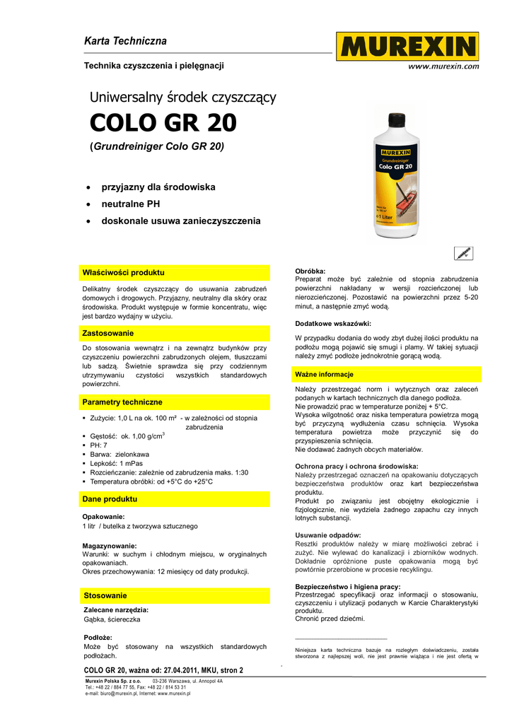 Karta Techniczna Technika popr Coloczyszczenia GR 20_pl i pielęgnacji Uniwersalny środek czyszczący COLO GR 20 (Grundreiniger Colo GR 20) przyjazny dla środowiska neutralne PH doskonale usuwa zanieczyszczenia Obróbka: Preparat może być zależnie od stopnia zabrudzenia powierzchni nakładany w wersji rozcieńczonej lub nierozcieńczonej. Pozostawić na powierzchni przez 5-20 minut, a następnie zmyć wodą. Właściwości produktu Delikatny środek czyszczący do usuwania zabrudzeń domowych i drogowych. Przyjazny, neutralny dla skóry oraz środowiska. Produkt występuje w formie koncentratu, więc jest bardzo wydajny w użyciu. Dodatkowe wskazówki: Zastosowanie W przypadku dodania do wody zbyt dużej ilości produktu na podłożu mogą pojawić się smugi i plamy. W takiej sytuacji należy zmyć podłoże jednokrotnie gorącą wodą. Do stosowania wewnątrz i na zewnątrz budynków przy czyszczeniu powierzchni zabrudzonych olejem, tłuszczami lub sadzą. Świetnie sprawdza się przy codziennym utrzymywaniu czystości wszystkich standardowych powierzchni. Ważne informacje Należy przestrzegać norm i wytycznych oraz zaleceń podanych w kartach technicznych dla danego podłoża. Nie prowadzić prac w temperaturze poniżej + 5°C. Wysoka wilgotność oraz niska temperatura powietrza mogą być przyczyną wydłużenia czasu schnięcia. Wysoka temperatura powietrza może przyczynić się do przyspieszenia schnięcia. Nie dodawać żadnych obcych materiałów. Parametry techniczne Zużycie: 1,0 L na ok. 100 m² - w zależności od stopnia zabrudzenia 3 Gęstość: ok. 1,00 g/cm PH: 7 Barwa: zielonkawa Lepkość: 1 mPas Rozcieńczanie: zależnie od zabrudzenia maks. 1:30 Temperatura obróbki: od +5°C do +25°C Ochrona pracy i ochrona środowiska: Należy przestrzegać oznaczeń na opakowaniu dotyczących bezpieczeństwa produktów oraz kart bezpieczeństwa produktu. Produkt po związaniu jest obojętny ekologicznie i fizjologicznie, nie wydziela żadnego zapachu czy innych lotnych substancji. Dane produktu Opakowanie: 1 litr / butelka z tworzywa sztucznego Usuwanie odpadów: Resztki produktów należy w miarę możliwości zebrać i zużyć. Nie wylewać do kanalizacji i zbiorników wodnych. Dokładnie opróżnione puste opakowania mogą być powtórnie przerobione w procesie recyklingu. Magazynowanie: Warunki: w suchym i chłodnym miejscu, w oryginalnych opakowaniach. Okres przechowywania: 12 miesięcy od daty produkcji. Bezpieczeństwo i higiena pracy: Przestrzegać specyfikacji oraz informacji o stosowaniu, czyszczeniu i utylizacji podanych w Karcie Charakterystyki produktu. Chronić przed dziećmi. Stosowanie Zalecane narzędzia: Gąbka, ściereczka Podłoże: Może być podłożach. ________________________________ stosowany na wszystkich standardowych COLO GR 20, ważna od: 27.04.2011, MKU, stron 2 Murexin Polska Sp. z o.o. 03-236 Warszawa, ul. Annopol 4A Tel.: +48 22 / 884 77 55, Fax: +48 22 / 814 53 31 e-mail: [email protected], Internet: www.murexin.pl Niniejsza karta techniczna bazuje na rozległym doświadczeniu, została stworzona z najlepszej woli, nie jest prawnie wiążąca i nie jest ofertą w 1 Karta Techniczna Technika popr Coloczyszczenia GR 20_pl i pielęgnacji rozumieniu prawa czy też gwarancją wynikającą z zamówienia lub umowy sprzedaży. Aby zminimalizować ryzyko popełnienia błędów wykonawczych w karcie zawarto określone, ograniczone informacje. Naturalnie nie mogą być tam dokładnie opisane wszystkie dotychczasowe i możliwe zastosowania produktu. Zrezygnowano z danych, które dla fachowców są oczywiste. W przypadku niejasności bądź wątpliwości, jak również ujawnienia jakichkolwiek dodatkowych czynników mogących mieć wpływ na prawidłowość aplikacji produktu bądź technologii wykonania systemu, Wykonawca winien uprzednio przeprowadzić próbę na miejscu budowy, zabezpieczając w odpowiedni sposób jej wyniki oraz skontaktować się z działem technicznym firmy Murexin Polska Sp. z o.o. Niezależnie od powyższych zaleceń Wykonawca zobowiązany jest do działania zgodnie z obowiązującymi przepisami, normami i wytycznymi oraz z zasadami sztuki budowlanej. W momencie wydania nowego opracowania tej karty technicznej, poprzednia wersja traci swoją ważność. COLO GR 20, ważna od: 27.04.2011, MKU, stron 2 Murexin Polska Sp. z o.o. 03-236 Warszawa, ul. Annopol 4A Tel.: +48 22 / 884 77 55, Fax: +48 22 / 814 53 31 e-mail: [email protected], Internet: www.murexin.pl 2