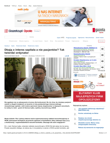 Dbają o interes szpitala a nie pacjentów? Tak twierdzi ordynator Gazeta.pl Tokfm.pl Poczta Forum Blogi 13.05.2013 13:41 Gazeta Wyborcza Przełącz Szukaj Wiadomości Gazeta.pl Opole Miasta regionu Wiadomości Opole Co Jest Grane Opole 14ºC Sport Kina Na weekend Prognoza pogody Forum Ogłoszenia 11.05.2013 , aktualizacja: 10.05.2013 21:35 Zmień miasto Miejsca Kontakt reklama Wiadomości z Opola Mieszkania Opole 3690zł/m Dbają o interes szpitala a nie pacjentów? Tak twierdzi ordynator Rozmawiała Beata Łabutin Ogłoszenia - Nieruchomości generalska2.pl/atlantis_deweloper Generalska2 Apartamenty Atlantis Deweloper k. 668 037 362 Kosmetyczka Opole A AA salonpieknecialo.pl Zadbaj o Piękne Ciało w przyjaznych cenach! Kredyt Hipoteczny w 5 min www.GetinBank.pl Oblicz Ratę Kredytu Hipotecznego. w 3 krótkich krokach. Sprawdź ! Kredyt Bez Bik I Krd pozyczki-bez-bik24.pl/BezBIKiKRD Bez BIK. Bez Formalności. Na Dowód. Niska prowizja! Wypełnij Wniosek. REKLAMA REKLAMA REKLAMA Dr Dariusz Łątka (Fot. Adam Juszczak / AG) Nie zgadzam się na zakazywanie mi pracy dla konkurencji. Bo nie chcę, by cierpiący pacjenci czekali w długich kolejkach na leczenie w imię partykularnego interesu jednego niewydolnego szpitala. Jeśli można operować więcej, bezpieczniej i w lepszych warunkach, to należy to robić - grzmi dr Dariusz Łątka, wybitny neurochirurg z WCM Beata Łabutin: Pan i pańscy lekarze macie supernowoczesny oddział neurochirurgiczny w WCM, tymczasem buntujecie się przeciw zapisowi w kontraktach, który zakazuje wam pracy u konkurencji, i wypowiedzieliście warunki kontraktu. Dlaczego tak ostro reagujecie? Dr n. med. Dariusz Łątka, ordynator oddziału neurochirurgii w WCM: Bo taki zakaz nie ma sensu. Przede wszystkim dlatego, że zdarza się, iż nie jesteśmy w stanie w WCM wyrobić kontraktu, jaki Najczęściej czytane 1. Jak wypełnić deklarację odpadową? [INSTRUKCJA] 2. Koniec autostrady na Odrze 3. Rodzice nie chcieli niepełnosprawnego dziecka na komunii? Ekolożka ocenia: Mamy nowy (nie)porządek śmieciowy 4. Ratusz się wzmacnia na negocjacje http://opole.gazeta.pl/opole/1,35114,13889924,Dbaja_o_interes_szpitala_a_nie_pacjentow__Tak_twierdzi.html#TRrelSST Strona 1 z 4 Dbają o interes szpitala a nie pacjentów? Tak twierdzi ordynator mamy z NFZ. Z różnych powodów, np. awarii mikroskopu śródoperacyjnego albo wreszcie z powodu niewydolności bloku operacyjnego. My się czasami po prostu na ten blok nie możemy dopchać, bo operują tam wszystkie specjalizacje zabiegowe. To nie brak pieniędzy jest hamulcem naszego rozwoju - bo odkąd zostałem ordynatorem w 2003 roku, nasz budżet zwiększył się trzykrotnie: z 5,5 do ok. 17 milionów złotych. Hamulcem rozwoju są problemy sprzętowe, organizacyjne, gdy chodzi o pracę bloku operacyjnego. Jeśli z takich powodów nie możemy więcej ludzi operować, to operujmy także gdzie indziej! Wygłasza pan poglądy niezgodne z odczuciem szefostwa. 13.05.2013 13:41 5. 6. z Solarisem o plac Kopernika Obwodnica przy powstającym węźle będzie zwężona 7. Rusza budowa nowej drogi na cmentarz na Półwsi 8. Nowe osiedla w Opolu. Zobacz ceny i wizualizacje mieszkań deweloperskich Reklama - Zdaję sobie z tego sprawę. Ale nie może na przykład być tak, że na bloku operacyjnym brakuje podstawowych rzeczy, jak jałowe obłożenia czy sterylna odzież. Dość powiedzieć, że często gęsto operowaliśmy kręgosłup lędźwiowy, używając obłożeń... okulistycznych. Zgubiłeś kartę kodową? Sprawdź ofertę oryginalnych kart w serwisach Renault. Nowe Renault Clio Dostępne w kredycie 4x25. Wejdź - sprawdź ofertę! Najnowsze modele, Toyoty. Atrakcyjne miesięczne raty! Nie przegap wiosennej okazjii! Reklama BusinessClick Wprowadzanie zapisów o zakazie konkurencji jest w Polsce dość powszechne, żadna nowość. - Niestety tak, dotyczy to głównie ordynatorów, ale także specjalistów, i to reprezentujących deficytowe specjalizacje. A wynika to najczęściej z bardzo przyziemnych pobudek: uniemożliwienia konkurencyjnym ośrodkom (prywatnym, ale także publicznym) ubiegania się o kontrakt z NFZ-em w danej deficytowej dziedzinie. Bo odpowiednia liczba specjalistów będących w dyspozycji jest warunkiem ubiegania się o taki kontrakt. Ale bynajmniej nie chodzi tu w żaden sposób o dobro pacjenta, który musi czekać w kolejkach. Reklamuj się tutaj! Kliknij! AdTaily.pl Ogłoszenia PRACA STUDIA I SZKOLENIA Sprzedaż: sprawdź oferty Prestiżowy kierunek IT, technika i inżynieria Najbardziej oblegany Praca w finansach Interesujące szkolenia NIERUCHOMOŚCI MOTORYZACJA Centrum, 39 m2 Audi A4 2.0 2005 r Zaodrze, 64 m2 Auta do 10 tysięcy Półwieś, 47 m2 Samochody rodzinne Jednak z punktu widzenia dyrekcji szpitala to racjonalne stawianie sprawy: chroni w ten sposób interes kierowanej przez siebie placówki - neurochirurgia to bardzo intratna dziedzina, tylko w zeszłym roku przynieśliście szpitalowi 5 mln zł zysku. - Prowadzi to jednak do monopolu graczy, którzy znaleźli się na rynku jako pierwsi. A monopol oznacza między innymi dłuższe kolejki do zabiegów. Jestem zdecydowanym przeciwnikiem takiej sytuacji, uważam każdą formę monopolu za coś szkodliwego. Taki model rynku medycznego ręcznie sterowanego zdecydowanie odbiega od bliskiego mojemu sercu anglosaskiego modelu, w którym zawód lekarza jest zawodem całkowicie wolnym, a na rynku medycznym ma miejsce zdrowa konkurencja lekarzy, szpitali i ubezpieczalni. Tam lekarze operują w dwóch-trzech, a nawet pięciu szpitalach, wybierając dla swoich pacjentów tę jednostkę, która zapewnia optymalne warunki do leczenia danego typu schorzenia. Tam zakaz konkurencji byłby oczywistym pogwałceniem prawa pacjenta do wyboru lekarza i ośrodka leczącego. Lekarz leczy pacjenta tam, gdzie chce pacjent i gdzie może lekarz. To tworzy zdrową zasadę ubiegania się centrów medycznych o lekarza - poprzez stwarzanie im optymalnych warunków do lecz