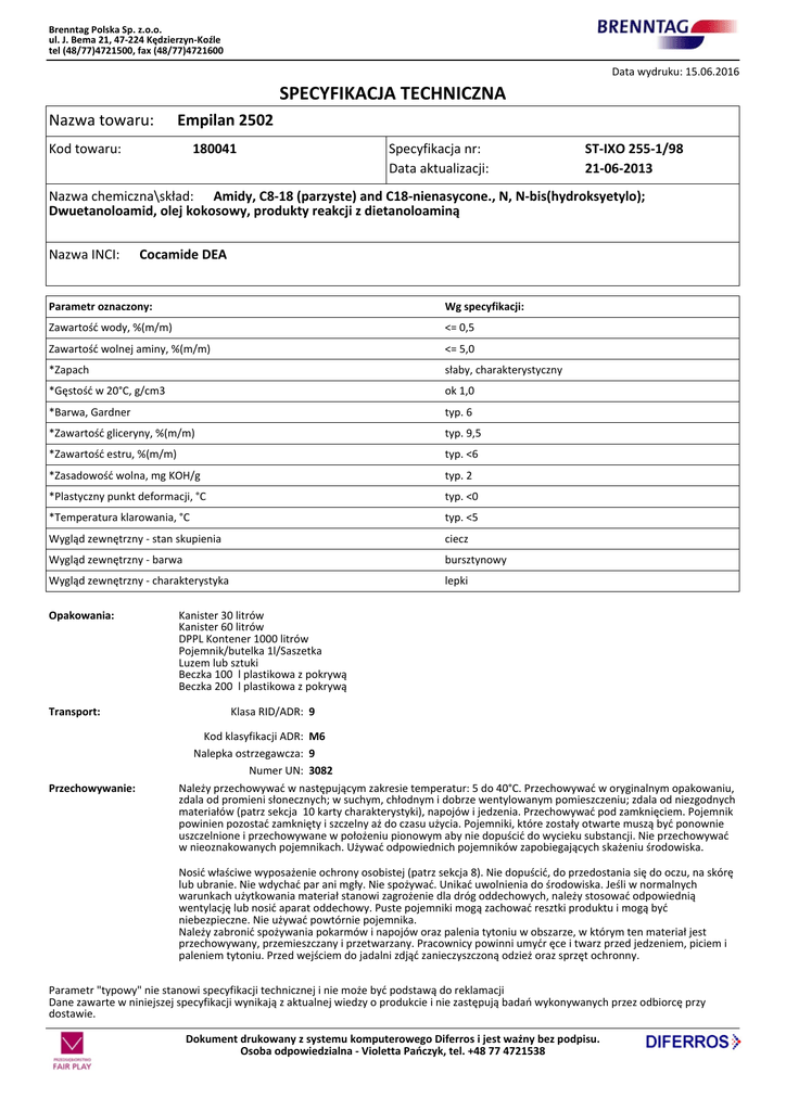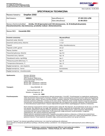 Brenntag Polska Sp. z.o.o. ul. J. Bema 21, 47-224 Kędzierzyn-Koźle tel (48/77)4721500, fax (48/77)4721600 Data wydruku: 15.06.2016 SPECYFIKACJA TECHNICZNA Nazwa towaru: Empilan 2502 Kod towaru: 180041 Specyfikacja nr: Data aktualizacji: ST-IXO 255-1/98 21-06-2013 Nazwa chemiczna\skład: Amidy, C8-18 (parzyste) and C18-nienasycone., N, N-bis(hydroksyetylo); Dwuetanoloamid, olej kokosowy, produkty reakcji z dietanoloaminą Nazwa INCI: Cocamide DEA Parametr oznaczony: Wg specyfikacji: Zawartość wody, %(m/m) <= 0,5 Zawartość wolnej aminy, %(m/m) <= 5,0 *Zapach słaby, charakterystyczny *Gęstość w 20°C, g/cm3 ok 1,0 *Barwa, Gardner typ. 6 *Zawartość gliceryny, %(m/m) typ. 9,5 *Zawartość estru, %(m/m) typ. <6 *Zasadowość wolna, mg KOH/g typ. 2 *Plastyczny punkt deformacji, °C typ. <0 *Temperatura klarowania, °C typ. <5 Wygląd zewnętrzny - stan skupienia ciecz Wygląd zewnętrzny - barwa bursztynowy Wygląd zewnętrzny - charakterystyka lepki Opakowania: Transport: Przechowywanie: Kanister 30 litrów Kanister 60 litrów DPPL Kontener 1000 litrów Pojemnik/butelka 1l/Saszetka Luzem lub sztuki Beczka 100 l plastikowa z pokrywą Beczka 200 l plastikowa z pokrywą Klasa RID/ADR: 9 Kod klasyfikacji ADR: M6 Nalepka ostrzegawcza: 9 Numer UN: 3082 Należy przechowywać w następującym zakresie temperatur: 5 do 40°C. Przechowywać w oryginalnym opakowaniu, zdala od promieni słonecznych; w suchym, chłodnym i dobrze wentylowanym pomieszczeniu; zdala od niezgodnych materiałów (patrz sekcja 10 karty charakterystyki), napojów i jedzenia. Przechowywać pod zamknięciem. Pojemnik powinien pozostać zamknięty i szczelny aż do czasu użycia. Pojemniki, które zostały otwarte muszą być ponownie uszczelnione i przechowywane w położeniu pionowym aby nie dopuścić do wycieku substancji. Nie przechowywać w nieoznakowanych pojemnikach. Używać odpowiednich pojemników zapobiegających skażeniu środowiska. Nosić właściwe wyposażenie ochrony osobistej (patrz sekcja 8). Nie dopuścić, do przedostania się do oczu, na skórę lub ubranie. Nie wdychać par ani mgły. Nie spożywać. Unikać uwolnienia do środowiska. Jeśli w normalnych warunkach użytkowania materiał stanowi zagrożenie dla dróg oddechowych, należy stosować odpowiednią wentylację lub nosić aparat oddechowy. Puste pojemniki mogą zachować resztki produktu i mogą być niebezpieczne. Nie używać powtórnie pojemnika. Należy zabronić spożywania pokarmów i napojów oraz palenia tytoniu w obszarze, w którym ten materiał jest przechowywany, przemieszczany i przetwarzany. Pracownicy powinni umyćr ęce i twarz przed jedzeniem, piciem i paleniem tytoniu. Przed wejściem do jadalni zdjąć zanieczyszczoną odzież oraz sprzęt ochronny. Parametr "typowy" nie stanowi specyfikacji technicznej i nie może być podstawą do reklamacji Dane zawarte w niniejszej specyfikacji wynikają z aktualnej wiedzy o produkcie i nie zastępują badań wykonywanych przez odbiorcę przy dostawie. Dokument drukowany z systemu komputerowego Diferros i jest ważny bez podpisu. Osoba odpowiedzialna - Violetta Pańczyk, tel. +48 77 4721538 Brenntag Polska Sp. z.o.o. ul. J. Bema 21, 47-224 Kędzierzyn-Koźle tel (48/77)4721500, fax (48/77)4721600 Okres ważności: 360 dni Uwagi: Produkt nie zawiera konserwantów. *informacje dodatkowe Ten produkt nie jest jakości spożywczej, paszowej, farmaceutycznej. W związku z tym nie może być użyty jako dodatek/składnik żywności, pasz lub produktów farmaceutycznych. Użycie produktu do tych zastosowań pozostaje w zakresie odpowiedzialności klienta. Parametr "typowy" nie stanowi specyfikacji technicznej i nie może być podstawą do reklamacji Dane zawarte w niniejszej specyfikacji wynikają z aktualnej wiedzy o produkcie i nie zastępują badań wykonywanych przez odbiorcę przy dostawie. Dokument drukowany z systemu komputerowego Diferros i jest ważny bez podpisu. Osoba odpowiedzialna - Violetta Pańczyk, tel. +48 77 4721538
