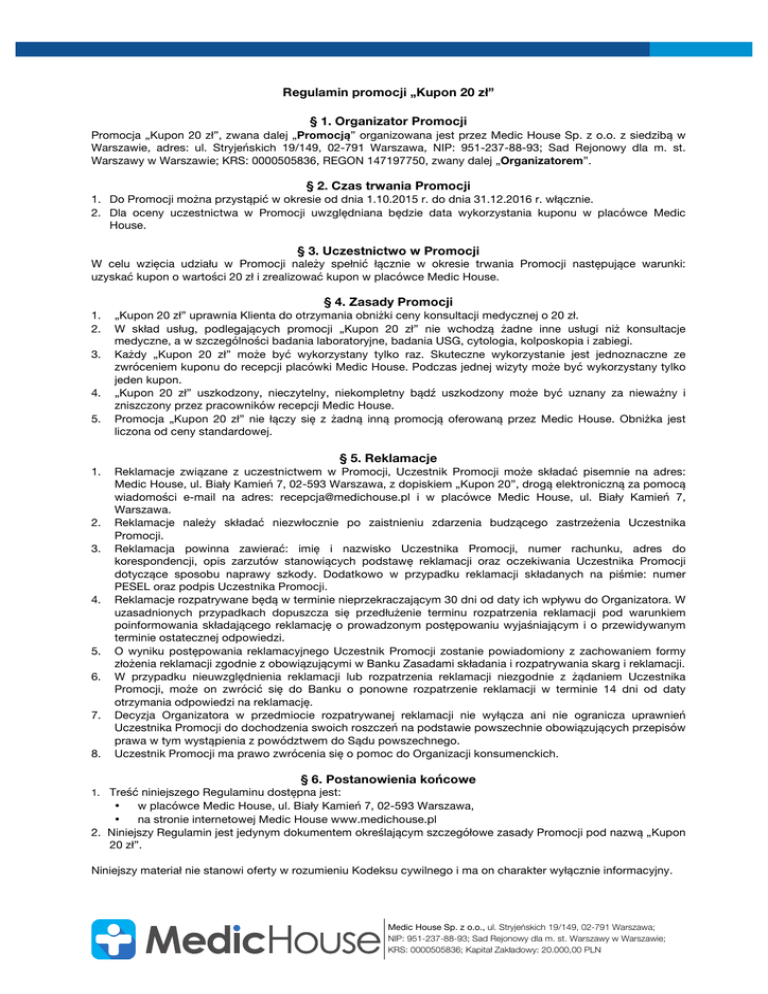 Regulamin promocji „Kupon 20 zł” § 1. Organizator Promocji Promocja „Kupon 20 zł”, zwana dalej „Promocją” organizowana jest przez Medic House Sp. z o.o. z siedzibą w Warszawie, adres: ul. Stryjeńskich 19/149, 02-791 Warszawa, NIP: 951-237-88-93; Sad Rejonowy dla m. st. Warszawy w Warszawie; KRS: 0000505836, REGON 147197750, zwany dalej „Organizatorem”. § 2. Czas trwania Promocji 1. Do Promocji można przystąpić w okresie od dnia 1.10.2015 r. do dnia 31.12.2016 r. włącznie. 2. Dla oceny uczestnictwa w Promocji uwzględniana będzie data wykorzystania kuponu w placówce Medic House. § 3. Uczestnictwo w Promocji W celu wzięcia udziału w Promocji należy spełnić łącznie w okresie trwania Promocji następujące warunki: uzyskać kupon o wartości 20 zł i zrealizować kupon w placówce Medic House. § 4. Zasady Promocji 1. 2. 3. 4. 5. „Kupon 20 zł” uprawnia Klienta do otrzymania obniżki ceny konsultacji medycznej o 20 zł. W skład usług, podlegających promocji „Kupon 20 zł” nie wchodzą żadne inne usługi niż konsultacje medyczne, a w szczególności badania laboratoryjne, badania USG, cytologia, kolposkopia i zabiegi. Każdy „Kupon 20 zł” może być wykorzystany tylko raz. Skuteczne wykorzystanie jest jednoznaczne ze zwróceniem kuponu do recepcji placówki Medic House. Podczas jednej wizyty może być wykorzystany tylko jeden kupon. „Kupon 20 zł” uszkodzony, nieczytelny, niekompletny bądź uszkodzony może być uznany za nieważny i zniszczony przez pracowników recepcji Medic House. Promocja „Kupon 20 zł” nie łączy się z żadną inną promocją oferowaną przez Medic House. Obniżka jest liczona od ceny standardowej. § 5. Reklamacje 1. 2. 3. 4. 5. 6. 7. 8. Reklamacje związane z uczestnictwem w Promocji, Uczestnik Promocji może składać pisemnie na adres: Medic House, ul. Biały Kamień 7, 02-593 Warszawa, z dopiskiem „Kupon 20”, drogą elektroniczną za pomocą wiadomości e-mail na adres: [email protected] i w placówce Medic House, ul. Biały Kamień 7, Warszawa. Reklamacje należy składać niezwłocznie po zaistnieniu zdarzenia budzącego zastrzeżenia Uczestnika Promocji. Reklamacja powinna zawierać: imię i nazwisko Uczestnika Promocji, numer rachunku, adres do korespondencji, opis zarzutów stanowiących podstawę reklamacji oraz oczekiwania Uczestnika Promocji dotyczące sposobu naprawy szkody. Dodatkowo w przypadku reklamacji składanych na piśmie: numer PESEL oraz podpis Uczestnika Promocji. Reklamacje rozpatrywane będą w terminie nieprzekraczającym 30 dni od daty ich wpływu do Organizatora. W uzasadnionych przypadkach dopuszcza się przedłużenie terminu rozpatrzenia reklamacji pod warunkiem poinformowania składającego reklamację o prowadzonym postępowaniu wyjaśniającym i o przewidywanym terminie ostatecznej odpowiedzi. O wyniku postępowania reklamacyjnego Uczestnik Promocji zostanie powiadomiony z zachowaniem formy złożenia reklamacji zgodnie z obowiązującymi w Banku Zasadami składania i rozpatrywania skarg i reklamacji. W przypadku nieuwzględnienia reklamacji lub rozpatrzenia reklamacji niezgodnie z żądaniem Uczestnika Promocji, może on zwrócić się do Banku o ponowne rozpatrzenie reklamacji w terminie 14 dni od daty otrzymania odpowiedzi na reklamację. Decyzja Organizatora w przedmiocie rozpatrywanej reklamacji nie wyłącza ani nie ogranicza uprawnień Uczestnika Promocji do dochodzenia swoich roszczeń na podstawie powszechnie obowiązujących przepisów prawa w tym wystąpienia z powództwem do Sądu powszechnego. Uczestnik Promocji ma prawo zwrócenia się o pomoc do Organizacji konsumenckich. § 6. Postanowienia końcowe 1. Treść niniejszego Regulaminu dostępna jest: • w placówce Medic House, ul. Biały Kamień 7, 02-593 Warszawa, • na stronie internetowej Medic House www.medichouse.pl 2. Niniejszy Regulamin jest jedynym dokumentem określającym szczegółowe zasady Promocji pod nazwą „Kupon 20 zł”. Niniejszy materiał nie stanowi oferty w rozumieniu Kodeksu cywilnego i ma on charakter wyłącznie informacyjny. Medic House Sp. z o.o., ul. Stryjeńskich 19/149, 02-791 Warszawa; NIP: 951-237-88-93; Sad Rejonowy dla m. st. Warszawy w Warszawie; KRS: 0000505836; Kapitał Zakładowy: 20.000,00 PLN