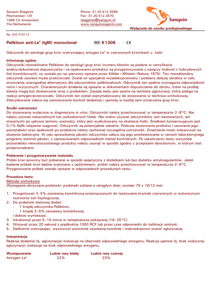Sanquin Reagents Plesmanlaan 125 1066 CX Amsterdam The Netherlands Phone: 31.20.512.3599 Fax: 31.20.512.3570 [email protected] www.sanquinreagents.com Wyłącznie do użytku profesjonalnego No. 022 010112 Pelikloon anti-Lea (IgM) monoclonal K1306 Odczynnik do serologii grup krwi wykrywający antygen Lea w czerwonych krwinkach u ludzi Informacje ogólne Odczynniki monoklinalne Pelikloon do serologii grup krwi (numery klonów są podane w certyfikacie analizy/dokumencie dopuszczenia i na opakowaniu produktu) są przygotowywane z nasączy hodowli z hybrydowych linii komórkowych, co zostało po raz pierwszy opisane przez Köhler i Milstein (Nature 1975). Ten monoklonalny odczynnik zawiera mysie przeciwciała. Został on specjalnie wyselekcjonowany i poddany dalszej obróbce w celu stworzenia wiarygodnej alternatywy dla odczynników poliklonalnych. Odczynnik ten spełnia wymagania odpowiednich norm i wytycznych. Charakterystyki działania są opisane w dokumentach dopuszczenia do obrotu, które na prośbę klienta mogą być dostarczone wraz z produktem. Zasada testu jest oparta na technice aglutynacji, która polega na reakcji antygen/przeciwciało. Odczynnik ten został zoptymalizowany do stosowania w technice wirówkowej. Zdecydowanie zaleca się zastosowanie kontroli dodatniej i ujemnej w każdej serii oznaczania grup krwi. Środki ostrożności Do stosowania wyłącznie w diagnostyce in vitro. Odczynniki należy przechowywać w temperaturze 2–8°C. Nie należy używać nieszczelnych lub uszkodzonych fiolek. Nie wolno używać odczynników (ani nieotwartych, ani otwartych) po upływie terminu ważności, który jest wydrukowany na etykiecie fiolki. Środkiem konserwującym jest 0,1% NaN3 (stężenie wagowe). Odczynniki są potencjalnie zakaźne. Podczas stosowania produktu i usuwania jego pozostałości oraz opakowań po produkcie należy zachować szczególną ostrożność. Zmętnienie może wskazywać na skażenie bakteryjne. W celu sprawdzenia jakości odczynnika zaleca się jego przetestowanie w ramach laboratoryjnego programu kontroli jakości, z zastosowaniem odpowiednich metod kontrolnych. Po zakończeniu testu wszystkie pozostałości niewykorzystanego produktu należy usunąć w sposób zgodny z przepisami laboratorium, w którym test przeprowadzano. Pobieranie i przygotowywanie materiału Próbki krwi powinny być pobierane w sposób aseptyczny z dodatkiem lub bez dodatku antykoagulantów. Jeżeli badanie próbek krwi będzie wykonane z opóźnieniem, próbki należy przechowywać w temperaturze 2–8°C. Przygotowanie próbek zostało opisane w odpowiednich procedurach testu. Procedura testu Metoda wirówkowa Wymagania dotyczące probówki: probówki szklane o okrągłym dnie; rozmiar 75 x 10/12 mm. 1. Przygotować 3–5% zawiesinę komórkową przeznaczonych do testowania krwinek czerwonych w izotonicznym roztworze soli fizjologicznej. 2. Do probówki testowej dodać: - 1 kroplę odczynnika Pelikloon, - 1 kroplę 3–5% zawiesiny komórkowej i dobrze wymieszać. 3. Inkubować przez 5–15 minut w temperaturze pokojowej (18–25°C). 4. Wirować przez 20 sekund z prędkością 1000 RCF lub przez czas odpowiedni do kalibracji wirówki. 5. Delikatnie wstrząsając, wytworzyć ponownie zawiesinę komórek i makroskopowo ocenić aglutynację. Interpretacja Reakcja dodatnia (tj. aglutynacja) wskazuje na obecność odpowiedniego antygenu. Reakcja ujemna (tj. brak widocznej aglutynacji) wskazuje na brak odpowiedniego antygenu. Występowanie Antygen Lea Ludzie rasy białej 22% Ludzie rasy czarnej 23% Ograniczenia Niespodziewane wyniki dodatnie z powodu: pseudoaglutynacji, autoaglutynacji, mieszanej reakcji pola, obecności galaretki Whartona razem z komórkami pępowiny. Niespodziewane wyniki ujemne lub wyniki słabo wyrażone z powodu: słabych antygenów, mieszanej reakcji pola, zmniejszonej aktywności odczynnika. Wyniki fałszywie dodatnie lub fałszywie ujemne mogą mieć miejsce w rezultacie skażenia badanych materiałów lub innych odchyleń od zalecanej techniki. Krwinki czerwone dodatnie w bezpośrednim teście antyglobulinowym (DAT) mogą dawać wyniki fałszywie dodatnie. Zaleca się użycie kontroli monoklonalnej Pelikloon w celu wykrycia nieważnych wyników testu. Odczynniki monoklonalne Pelikloon do serologii grup krwi zostały zoptymalizowane do stosowania w technice (technikach) zalecanej (zalecanych) w ulotce, dołączonej do opakowania. Jeżeli nie określono inaczej, to ich przydatność do zastosowania w innych technikach musi być ustalona przez użytkownika. Materiały źródłowe 1. Race R.R. and Sanger R.; Blood Groups in Man, 6th ed. Oxford Blackwell Scientific Publishers 1975. 2. Issit P.D.; Applied Blood Group Serology, 3rd ed. Montgomery Scientific Publications, Miami, Florida, USA, 1985. 3. Daniels G.; Human Blood Groups. Blackwell Science Ltd. 1995. 4. Reid M.E. and Lomas-Francis C.; The Blood Group Antigen Facts Book. Facts Book Series, 1997. 5. Mollison P.L. et al.; Blood Transfusion In Clinical Medicine, 9th ed. Blackwell, Oxford, 1993.