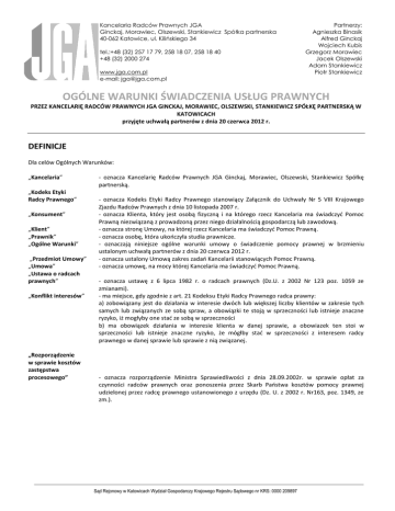 Kancelaria Radców Prawnych JGA Ginckaj, Morawiec, Olszewski, Stankiewicz Spółka partnerska 40-062 Katowice, ul. Kilińskiego 34 tel.:+48 (32) 257 17 79, 258 18 07, 258 18 40 +48 (32) 2000 274 www.jga.com.pl e-mail: [email protected] Partnerzy: Agnieszka Binasik Alfred Ginckaj Wojciech Kubis Grzegorz Morawiec Jacek Olszewski Adam Stankiewicz Piotr Stankiewicz OGÓLNE WARUNKI ŚWIADCZENIA USŁUG PRAWNYCH PRZEZ KANCELARIĘ RADCÓW PRAWNYCH JGA GINCKAJ, MORAWIEC, OLSZEWSKI, STANKIEWICZ SPÓŁKĘ PARTNERSKĄ W KATOWICACH przyjęte uchwałą partnerów z dnia 20 czerwca 2012 r. DEFINICJE Dla celów Ogólnych Warunków: „Kancelaria” „Kodeks Etyki Radcy Prawnego” „Konsument” „Klient” „Prawnik” „Ogólne Warunki” „Przedmiot Umowy” „Umowa” „Ustawa o radcach prawnych” „Konflikt interesów” „Rozporządzenie w sprawie kosztów zastępstwa procesowego” - oznacza Kancelarię Radców Prawnych JGA Ginckaj, Morawiec, Olszewski, Stankiewicz Spółkę partnerską. - oznacza Kodeks Etyki Radcy Prawnego stanowiący Załącznik do Uchwały Nr 5 VIII Krajowego Zjazdu Radców Prawnych z dnia 10 listopada 2007 r. - oznacza Klienta, który jest osobą fizyczną i na którego rzecz Kancelaria ma świadczyć Pomoc Prawną niezwiązaną z prowadzoną przez niego działalnością gospodarczą lub zawodową. - oznacza stronę Umowy, na której rzecz Kancelaria ma świadczyć Pomoc Prawną. - oznacza osobę, która ukończyła studia prawnicze. - oznaczają niniejsze ogólne warunki umowy o świadczenie pomocy prawnej w brzmieniu ustalonym uchwałą partnerów z dnia 20 czerwca 2012 r. - oznacza ustalony Umową zakres zadań Kancelarii stanowiących Pomoc Prawną. - oznacza umowę, na mocy której Kancelaria ma świadczyć Pomoc Prawną. - oznacza ustawę z 6 lipca 1982 r. o radcach prawnych (Dz.U. z 2002 Nr 123 poz. 1059 ze zmianami). - ma miejsce, gdy zgodnie z art. 21 Kodeksu Etyki Radcy Prawnego radca prawny: a) zobowiązany jest do działania w interesie dwóch lub większej liczby klientów w zakresie tych samych lub związanych ze sobą spraw, a obowiązki te stoją w sprzeczności lub istnieje znaczne ryzyko, iż mogłyby one stać ze sobą w sprzeczności b) ma obowiązek działania w interesie klienta w danej sprawie, a obowiazek ten stoi w sprzeczności lub istnieje znaczne ryzyko, że mógłby stać w sprzeczności z interesem radcy prawnego w danej sprawie lub sprawie z nią związanej. - oznacza rozporządzenie Ministra Sprawiedliwości z dnia 28.09.2002r. w sprawie opłat za czynności radców prawnych oraz ponoszenia przez Skarb Państwa kosztów pomocy prawnej udzielonej przez radcę prawnego ustanowionego z urzędu (Dz. U. z 2002 r. Nr163, poz. 1349, ze zm.). Sąd Rejonowy w Katowicach Wydział Gospodarczy Krajowego Rejestru Sądowego nr KRS: 0000 209897 2. Umowa i Ogólne Warunki 2.1 2.2 2.3 Ogólne Warunki stanowią zbiór norm uzupełniających Umowę. Ogólne Warunki będą wiązać strony Umowy, jeżeli: a) będą stanowić załącznik do Umowy, b) zostaną przywołane w treści Umowy i doręczone drugiej stronie przed zawarciem Umowy; lub c) o ile drugą stroną Umowy nie jest Konsument, jeżeli Ogólne Warunki zostaną przywołane w treści Umowy z powołaniem się na ich publikację na stronie internetowej Kancelarii (www.jga.com.pl), W razie rozbieżności między postanowieniami Umowy i Ogólnych Warunków, postanowienia Umowy mają znaczenie rozstrzygające. 3. Świadczenie pomocy prawnej przez Kancelarię 3.1 3.2 3.3 3.4 Pomoc prawna świadczona przez Kancelarię oparta jest na rozumieniu przez radców prawnych i innych Prawników Kancelarii odpowiednich ustaw, orzecznictwa oraz praktyki będących w mocy w chwili świadczenia pomocy prawnej. Pomoc prawna polega w szczególności na udzielaniu porady prawnej, sporządzaniu opinii prawnych, opracowywaniu projektów umów lub aktów normatywnych, lub reprezentowaniu osób przed sądem lub organem administracji. Późniejsze zmiany przepisów, nowe orzecznictwo lub praktyka mogą mieć wpływ na aktualność udzielonej Pomocy Prawnej. Kancelaria nie jest zobowiązana do aktualizowania udzielonych porad pod kątem późniejszych zmian w przepisach i praktyce, chyba że Umowa stanowi inaczej. Kancelaria świadczy Pomoc Prawną Klientowi zgodnie z przepisami ustawy o radcach prawnych i Kodeksem etyki radcy prawnego, na następujących zasadach: 3.4.1 Kancelaria nie udziela porad odnośnie meritum transakcji inwestycyjnych, ani, o ile inaczej nie zastrzeżono, jej aspektów podatkowych; 3.4.2 Kancelaria nie występuje w charakterze pośrednika bądź organizatora jakiejkolwiek transakcji, chyba, że wyraźnie zastrzeżono inaczej; 3.4.3 decyzja Klienta o przedyskutowaniu lub negocjowaniu transakcji została – jak też wszelka decyzja o przystąpieniu do takiej transakcji będzie – podjęta przez Klienta na podstawie jego własnej oceny aspektów i ryzyk komercyjnych i finansowych danej transakcji; 3.4.4 żadnej porady Kancelarii (ustnej, pisemnej czy w jakiejkolwiek innej formie) nie należy uważać za zaproszenie lub nakłanianie (bezpośrednie bądź pośrednie) Klienta lub kogokolwiek innego do podjęcia działalności inwestycyjnej; oraz 3.4.5 Kancelaria nie ma obowiązku przekazywać w imieniu Klienta lub osób trzecich zaproszeń bądź nakłaniać do podjęcia działalności inwestycyjnej. 4. Zawarcie Umowy 4.1 4.2 4.3 Kancelaria i Klient mogą zawrzeć Umowę w dowolny sposób, w tym także ustnie bądź za pośrednictwem środków porozumiewania się na odległość, w szczególności poczty elektronicznej. W przypadku zawarcia Umowy w formie pisemnej Kancelaria proponuje wzór Umowy, podlegający obustronnemu uzgodnieniu. Umowa może dotyczyć konkretnego zlecenia lub być umową o stałą obsługę prawną. Umowa powinna określać przynajmniej Przedmiot Umowy i sposób określenia wynagrodzenia Kancelarii. 5. Wersje dokumentów 5.1 5.2 5.3 Kancelaria może zapoznać Klienta z projektem