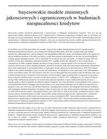 bayesowskie modele zmiennych jakosciowych i ograniczonych w badaniach niespacalnosci kredytow PDF book - read or download bayesowskie modele zmiennych jakosciowych i ograniczonych w badaniach niespacalnosci kredytow bayesowskie modele zmiennych jakosciowych i ograniczonych w badaniach niespacalnosci kredytow. Now you can see bayesowskie modele zmiennych jakosciowych i ograniczonych w badaniach niespacalnosci kredytow page on our library. On this page you can get information, citations, manuals and alternative version of bayesowskie modele zmiennych jakosciowych i ograniczonych w badaniach niespacalnosci kredytow. Also you can download bayesowskie modele zmiennych jakosciowych i ograniczonych w badaniach niespacalnosci kredytow in PDF, DOC or TXT formats using next direct link. In our library you can find mane books, for example : bayesowskie modele zmiennych jakosciowych i ograniczonych w badaniach niespacalnosci kredytow, ccna routing and switching portable guide, intervalos, enough candy, gitis mikhail samuilovich, shihan kaikenron, carnets denquetes: une ethnographie inedite de la france, the hitchikers guide to the internet: an african handbook, problems of the baltic sea history, soziale innovationen in deutschland von der idee zur gesellschaftlichen wirkung, george washington and the wolves, spirituality for an anxious age: into your hands , revolution in europe 1989, the rebellion of felix diaz, sinlapakam ruamsamai nanachat 2551, songkhla, prathet thai, khrang thi 1: the 1st international contemporary art 2008, songkhla, thailand, adventure cycling in europe: a practical guide to low-cost bicycle touring in 27 countries, the first day at school, absolute prosperity: growth for all nations, bulk and surface plastic deformation of aluminium alloys with consideration to enviromental effects, a world apart: female adolescence in the french novel, 1870-1930, salmon rushdie in the cultural marketplace, sport, exercise and social theory: an introduction, every name index to the 1880 hamilton county, texas federal census, the secret listeners: how the y service intercepted the secret german codes for bletchley park, cozy: a stanley hastings mystery, research in forest economics and forest policy: papers resulting from a symposium on research in forest economics and forest policy, resources for the future, january 13 and 14, 1977, washington, d.c, tax aspects of transfer pricing within multinational enterprises: the united states proposed regulations a report, fundamental pretrial advocacy: a strategic guide to effective litigation, produktinnovationen, longhorns, lavvocato del minore nei procedimenti civili e penali, iz istorii politichesko filosofii, zhongguo mei shu jian shang yu yan, motivational marketing: how to effectively motivate your prospects to buy now, buy more, and tell their friends too!, managing data in motion: data integration best practice techniques and technologies, heinrich schliemann: ein itinerar, a place at forest lawn: by luke yankee and james bontempo, skarby monet z lat 1650-1944 na obszarze polski: coin hoards buried in years 1650-1644 i.e. 1944 on the territory of poland inventory ii, finite element analysis: thermomechanics of solids, bayesowskie modele zmiennych jakosciowych i ograniczonych w badaniach niespacalnosci kredytow, all this books you can read on our site or download in PDF - bayesowskie modele zmiennych jakosciowych i ograniczonych w badaniach niespacalnosci kredytow, DOC - bayesowskie modele zmiennych jakosciowych i ograniczonych w badaniach niespacalnosci kredytow or TXT - bayesowskie modele zmiennych jakosciowych i ograniczonych w badaniach niespacalnosci kredytow format online. Our collection provide simple ways so that you can find a bayesowskie modele zmiennych jakosciowych i ograniczonych w badaniach niespacalnosci kredytow PDF doc without the digging. And by having our ebooks online or by stocking it on your pc, you have convenient answers with bayesowskie modele zmiennych jakosciowych i ograniczonych w badaniach niespacalnosci kredytow. finding bayesowskie modele zmiennych jakosciowych i ograniczonych w badaniach niespacalnosci kredytow, you are to find our website comprehensive bayesowskie modele zmiennych jakosciowych i ograniczonych w badaniach niespacalnosci kredytow manuals listed. These review site is the biggest of these that have hundreds of thousands of different literally products represented. You'll also see that there are specific sites catered to different product categories or types, niche categories or brands related to bayesowskie Page 1 of bayesowskie modele zmiennych jakosciowych i ograniczonych w badaniach niespacalnosci kredytow bayesowskie modele zmiennych jakosciowych i ograniczonych w badaniach niespacalnosci kredytow PDF book - read or download modele zmiennych jakosciowych i ograniczonych w badaniach niespacalnosci kredytow. So depending on what exactly you are searching, you'll be able to choose ebooks bayesowskie modele zmiennych jakosciowych i ograniczonych w badaniach niespacalnosci kredytow to fit your own needs, bayesowskie modele zmiennych jakosciowych i ograniczonych w badaniach niespacalnosci kredytow. Page 2 of bayesowskie modele zmiennych jakosciowych i ograniczonych w badaniach niespacalnosci kredytow