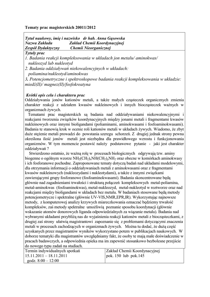 Tematy prac magisterskich 20011/2012 Tytuł naukowy, imię i nazwisko dr hab. Anna Gąsowska Nazwa Zakładu Zakład Chemii Koordynacyjnej Zespół Dydaktyczny Chemii Nieorganicznej Tytuły prac 1. Badania reakcji kompleksowania w układach jon metalu/ aminokwas/ nukleozyd lub nukleotyd 2. Badania oddziaływań niekowalencyjnych w układach: poliamina/nukleotyd/aminokwas 3. Potencjometryczne i spektroskopowe badania reakcji kompleksowania w układzie: miedź(II)/ magnez(II)/fosfokreatyna Krótki opis celu i charakteru prac Oddziaływania jonów kationów metali, a takŜe małych cząsteczek organicznych zmienia charakter reakcji z udziałem kwasów nukleinowych i innych biocząsteczek waŜnych w organizmach Ŝywych. Tematami prac magisterskich są badania nad oddziaływaniami niekowalencyjnymi i reakcjami tworzenia związków koordynacyjnych między jonami metali i fragmentami kwasów nukleinowych oraz innymi bioligandami (poliaminami, aminokwasami i fosfoaminokwasami). Badania te stanowią krok w ocenie roli kationów metali w układach Ŝywych. Wiadomo, Ŝe zbyt duŜe stęŜenie metali prowadzi do powstania szeregu schorzeń. Z drugiej jednak strony pewna określona ilość jonów metali jest niezbędna dla prawidłowego wzrostu i funkcjonowania organizmów. W tym momencie postawić naleŜy podstawowe pytanie - jaki jest charakter oddziaływań ? Stwierdzono ostatnio, Ŝe waŜną rolę w procesach biologicznych odgrywają tzw. aminy biogenne o ogólnym wzorze NH2(CH2)xNH(CH2)yNH2 oraz obecne w komórkach aminokwasy i ich fosforanowe pochodne. Zaproponowane tematy dotyczą badań nad układami modelowymi, dla otrzymania informacji o oddziaływaniach metali z aminokwasami oraz z fragmentami kwasów nukleinowych (nukleozydami i nukleotydami), a takŜe z innymi związkami zawierającymi grupy fosforanowe (fosfoaminokwasami). Badania skoncentrowane będą głównie nad zagadnieniami trwałości i strukturą połączeń kompleksowych metal-poliamina, metal-aminokwas (fosfoaminokwas), metal-nukleozyd, metal-nukleotyd w roztworze oraz nad reakcjami między bioligandami w układach bez metalu. W badaniach stosowane będą metody potencjometrycze i spektralne (głównie UV-VIS,NMR,EPR,IR). Wykorzystując najnowsze metody, z komputerowej analizy krzywych miareczkowania oznaczać będziemy trwałość kompleksów, zaś metody spektralne umoŜliwią poznanie sposobu koordynacji (głównie wskazanie atomów donorowych liganda odpowiedzialnych za wiązanie metalu). Badania nad wybranymi układami przybliŜą nas do wyjaśnienia reakcji kationów metali z biocząsteczkami, z drugiej zaś strony ułatwią magistrantowi zapoznanie się z problemami dotyczącymi znaczenia metali w procesach zachodzących w organizmach Ŝywych. MoŜna tu dodać, Ŝe duŜą część uzyskanych przez magistrantów wyników wykorzystano potem w publikacjach naukowych. W doborze tematyki dla magistrantów uwzględniamy fakt, Ŝe osoby te mają małe doświadczenie w pracach badawczych, a odpowiednia opieka ma im zapewnić stosunkowo bezbolesne przejście do nowego typu zadań na studiach. Termin indywidualnych spotkań Zakład Chemii Koordynacyjnej 15.11.2011 – 18.11.2011 pok. 150 lub pok.145 godz. 8:00 – 12:00