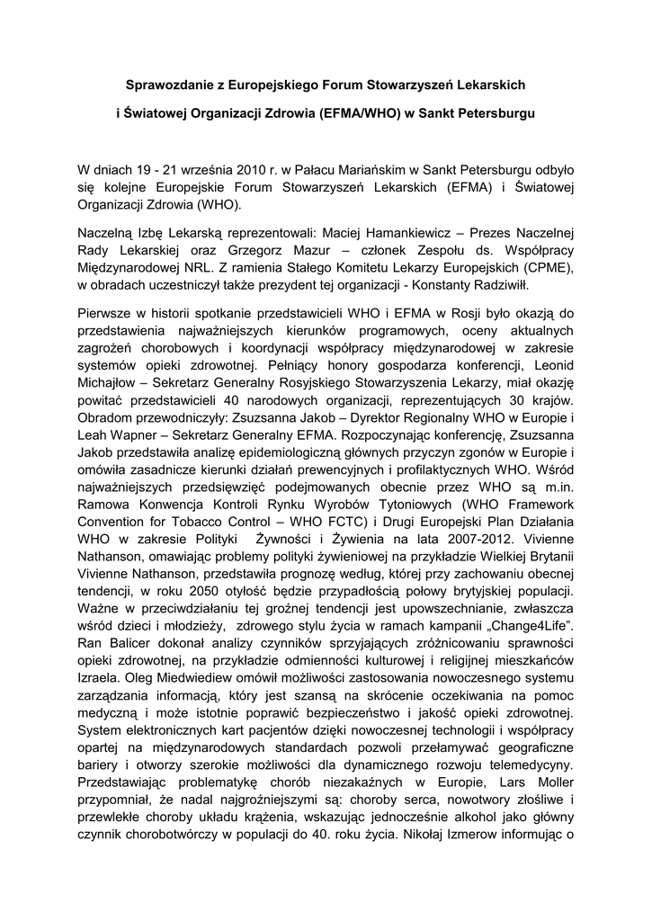 Sprawozdanie z Europejskiego Forum Stowarzyszeń Lekarskich i Światowej Organizacji Zdrowia (EFMA/WHO) w Sankt Petersburgu W dniach 19 - 21 września 2010 r. w Pałacu Mariańskim w Sankt Petersburgu odbyło się kolejne Europejskie Forum Stowarzyszeń Lekarskich (EFMA) i Światowej Organizacji Zdrowia (WHO). Naczelną Izbę Lekarską reprezentowali: Maciej Hamankiewicz – Prezes Naczelnej Rady Lekarskiej oraz Grzegorz Mazur – członek Zespołu ds. Współpracy Międzynarodowej NRL. Z ramienia Stałego Komitetu Lekarzy Europejskich (CPME), w obradach uczestniczył także prezydent tej organizacji - Konstanty Radziwiłł. Pierwsze w historii spotkanie przedstawicieli WHO i EFMA w Rosji było okazją do przedstawienia najważniejszych kierunków programowych, oceny aktualnych zagrożeń chorobowych i koordynacji współpracy międzynarodowej w zakresie systemów opieki zdrowotnej. Pełniący honory gospodarza konferencji, Leonid Michajłow – Sekretarz Generalny Rosyjskiego Stowarzyszenia Lekarzy, miał okazję powitać przedstawicieli 40 narodowych organizacji, reprezentujących 30 krajów. Obradom przewodniczyły: Zsuzsanna Jakob – Dyrektor Regionalny WHO w Europie i Leah Wapner – Sekretarz Generalny EFMA. Rozpoczynając konferencję, Zsuzsanna Jakob przedstawiła analizę epidemiologiczną głównych przyczyn zgonów w Europie i omówiła zasadnicze kierunki działań prewencyjnych i profilaktycznych WHO. Wśród najważniejszych przedsięwzięć podejmowanych obecnie przez WHO są m.in. Ramowa Konwencja Kontroli Rynku Wyrobów Tytoniowych (WHO Framework Convention for Tobacco Control – WHO FCTC) i Drugi Europejski Plan Działania WHO w zakresie Polityki Żywności i Żywienia na lata 2007-2012. Vivienne Nathanson, omawiając problemy polityki żywieniowej na przykładzie Wielkiej Brytanii Vivienne Nathanson, przedstawiła prognozę według, której przy zachowaniu obecnej tendencji, w roku 2050 otyłość będzie przypadłością połowy brytyjskiej populacji. Ważne w przeciwdziałaniu tej groźnej tendencji jest upowszechnianie, zwłaszcza wśród dzieci i młodzieży, zdrowego stylu życia w ramach kampanii „Change4Life”. Ran Balicer dokonał analizy czynników sprzyjających zróżnicowaniu sprawności opieki zdrowotnej, na przykładzie odmienności kulturowej i religijnej mieszkańców Izraela. Oleg Miedwiediew omówił możliwości zastosowania nowoczesnego systemu zarządzania informacją, który jest szansą na skrócenie oczekiwania na pomoc medyczną i może istotnie poprawić bezpieczeństwo i jakość opieki zdrowotnej. System elektronicznych kart pacjentów dzięki nowoczesnej technologii i współpracy opartej na międzynarodowych standardach pozwoli przełamywać geograficzne bariery i otworzy szerokie możliwości dla dynamicznego rozwoju telemedycyny. Przedstawiając problematykę chorób niezakaźnych w Europie, Lars Moller przypomniał, że nadal najgroźniejszymi są: choroby serca, nowotwory złośliwe i przewlekłe choroby układu krążenia, wskazując jednocześnie alkohol jako główny czynnik chorobotwórczy w populacji do 40. roku życia. Nikołaj Izmerow informując o implementacji programów WHO w Rosji, podkreślał trudności w ich realizacji w zderzeniu z uwarunkowaniami kulturowymi, takimi jak choćby konsumpcja alkoholu czy używanie tytoniu. W dyskusji podkreślano potrzebę uwzględnienia działań wielosektorowych w nowym programie antyalkoholowym WHO, który wejdzie w życie w 2011r. Ponadto, omówiono główne kierunki poprawy systemu pomocy doraźnej, mając na uwadze poprawę organizacji i wykorzystanie zasobów dla wzrostu efektywności. Znaczną część konferencji poświęcono tematom chorób zakaźnych, a zwłaszcza problemowi grypy H1N1. Od kwietnia 2009r. do chwili obecnej w związku zachorowaniem na grypę H1N1 odnotowano w Europie 4879 zgonów, głównie między 15-tym a 64-tym rokiem życia. Biorąc pod uwagę pojawiające się nadal pojedyncze przypadki zachorowań w krajach Ameryki Środkowej i Południowej, nie można wykluczyć nadejścia kolejnej fali pandemii. Jak podkreślił Dawid Mercer, po doświadczeniach pandemii grypy H1N1 z 2009 roku koniecznością jest opracowanie planu działania, który zapewni szybkie wykrycie źródeł zakażenia i koordynację działań międzynarodowych. Należy też bezwzględnie zapewnić możliwość szczepień ochronnych dla grup najbardziej zagrożonych ryzykiem zachorowań. Konferencja w Sankt Petersburgu, była poprzedzona 16-tą sesją Regionalnego Komitetu WHO w Europie, która odbyła się dwa tygodnie wcześniej w Moskwie z udziałem premiera Federacji Rosyjskiej Władimira Putina. Zaangażowanie WHO i EFMA we współpracę z Rosją wydaje się być szansą na dostosowanie systemów opieki zdrowotnej i może przyczynić się do zwiększenia bezpieczeństwa zdrowotnego na obszarze całej Europy. Sporządził: Grzegorz Mazur