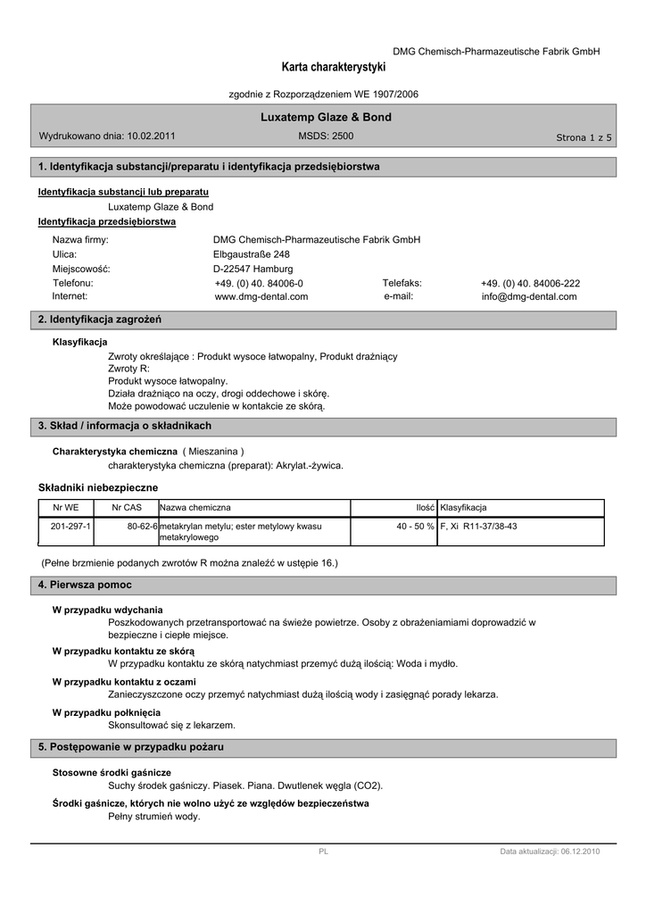 DMG Chemisch-Pharmazeutische Fabrik GmbH Karta charakterystyki zgodnie z Rozporządzeniem WE 1907/2006 Luxatemp Glaze & Bond Wydrukowano dnia: 10.02.2011 MSDS: 2500 Strona 1 z 5 1. Identyfikacja substancji/preparatu i identyfikacja przedsiębiorstwa Identyfikacja substancji lub preparatu Luxatemp Glaze & Bond Identyfikacja przedsiębiorstwa Nazwa firmy: Ulica: Miejscowość: Telefonu: Internet: DMG Chemisch-Pharmazeutische Fabrik GmbH Elbgaustraße 248 D-22547 Hamburg Telefaks: +49. (0) 40. 84006-0 e-mail: www.dmg-dental.com +49. (0) 40. 84006-222 [email protected] 2. Identyfikacja zagrożeń Klasyfikacja Zwroty określające : Produkt wysoce łatwopalny, Produkt drażniący Zwroty R: Produkt wysoce łatwopalny. Działa drażniąco na oczy, drogi oddechowe i skórę. Może powodować uczulenie w kontakcie ze skórą. 3. Skład / informacja o składnikach Charakterystyka chemiczna ( Mieszanina ) charakterystyka chemiczna (preparat): Akrylat.-żywica. Składniki niebezpieczne Nr WE 201-297-1 Nr CAS Nazwa chemiczna Ilość Klasyfikacja 80-62-6 metakrylan metylu; ester metylowy kwasu metakrylowego 40 - 50 % F, Xi R11-37/38-43 (Pełne brzmienie podanych zwrotów R można znaleźć w ustępie 16.) 4. Pierwsza pomoc W przypadku wdychania Poszkodowanych przetransportować na świeże powietrze. Osoby z obrażeniamiami doprowadzić w bezpieczne i ciepłe miejsce. W przypadku kontaktu ze skórą W przypadku kontaktu ze skórą natychmiast przemyć dużą ilością: Woda i mydło. W przypadku kontaktu z oczami Zanieczyszczone oczy przemyć natychmiast dużą ilością wody i zasięgnąć porady lekarza. W przypadku połknięcia Skonsultować się z lekarzem. 5. Postępowanie w przypadku pożaru Stosowne środki gaśnicze Suchy środek gaśniczy. Piasek. Piana. Dwutlenek węgla (CO2). Środki gaśnicze, których nie wolno użyć ze względów bezpieczeństwa Pełny strumień wody. PL Data aktualizacji: 06.12.2010 DMG Chemisch-Pharmazeutische Fabrik GmbH Karta charakterystyki zgodnie z Rozporządzeniem WE 1907/2006 Luxatemp Glaze & Bond Wydrukowano dnia: 10.02.2011 MSDS: 2500 Strona 2 z 5 6. Postępowanie w przypadku niezamierzonego uwolnienia do środowiska Indywidualnych środków ostrożności Należy zadbać o należyte wietrzenie pomieszczeń i wentylację. Środków ostrożności w odniesieniu do środowiska Nie odprowadzać do kanalizacji i zbiorników wodnych. Metody oczyszczania Należy zebrać przy pomocy materiałów wiążących płyny (piasek, ziemia okrzemkowa, uniwersalny środek wiążący). 7. Postępowanie z substancją/preparatem i jej/jego magazynowanie Postępowanie Wskazówki odnośnie bezpiecznego obchodzenia się z substancją Nosić odpowiednie rękawice ochronne. Unikać zanieczyszczenia oczu. Wskazówki w zakresie ochrony ppoż i przeciwwybuchowej Nie przechowywać w pobliżu źródeł zaplonu - nie palić tytoniu. Stosować chronione przed wybuchem instalacje, aparatury, instalacje odsysające, urządzenia. Składowanie Wymagania względem pomieszczeń i pojemników magazynowych Pojemniki przechowywać szczelnie zamknięte w chłodnym, dobrze wentylowanym miejscu. 8. Kontrola narażenia/środki ochrony indywidualnej Wartości dopuszczalnych norm narażenia na działanie Inne informacje dotyczące dopuszczalnych wartości narażenia wartości dopuszczalne na stanowisku roboczym: (MMA): 210 mg/mł; 50 ml/mł Środki zmniejszenia narażenia na działanie w miejscu pracy Środki zmniejszające narażenie na działanie Zapewnić wystarczającą wentylację obszaru magazynowania. Środki higieny Nie jeść i nie pić podczas stosowania produktu. Ochrona dróg oddechowych urządzenie filtrujące ( pełna maska lub ochrona na buzię) z filtrem: A Ochrona rąk Należy używać przetestowanych rękawic ochronnych: Właściwy materiał: NBR (Nitrylokauczuk). Ochrona oczu Szczelne okulary ochronne. 9. Właściwości fizyczne i chemiczne Informacje ogólne Postać: Kolor: Zapach: ciekły żółty ester Istotne informacje dotyczące zdrowia, bezpieczeństwa i środowiska Metoda testu PL Data aktualizacji: 06.12.2010 DMG Chemisch-Pharmazeutische Fabrik GmbH Karta charakterystyki zgodnie z Rozporządzeniem WE 1907/2006 Luxatemp Glaze & Bond Wydrukowano dnia: 10.02.2011 MSDS: 2500 pH: Strona 3 z 5 nie stosowany Zmiana stanu Temperatura rozkładu: > 100 °C Temperatura zapłonu: 10 °C Granice wybuchowości - dolna: Granice wybuchowości - górna: 2,1 obj. % 12,5 obj. % Prężność pary: (przy 20 °C) Gęstość: 40 hPa ca. 1,1 g/cm³ Rozpuszczalność w wodzie: (przy 20 °C) Zagęszczenie oparów względna: 16 g/L >1 Inne informacje > 430 °C Samozapalność: 10. Stabilność i reaktywność Warunki, których należy unikać gorąco. Światło. Rozkład następuje od temperatury: 100 °C Substancje, których należy unikać Trzymać z dala od kwasów, ługów, soli metali ciężkich i substancji redukujących. Niebezpieczne produkty rozkładu Podczas pożaru mogą powstawać: gazy / opary, drażniący. (Akrylat., kłujący) Informacja uzupełniająca Światłoczuły(-e) materiał(-y). 11. Informacje toksykologiczne Specyficzne działanie w próbie na zwierzętach LD50: (Szczur.) > 8.000 mg/kg (MMA) > 5.000 mg/kg (Akrylat.) Podrażnienie/uszkodzenie skóry Drażniające działanie na oczy: Produkt może wywoływać w rzadkich przypadkach chwilowe zaczerwienienia skóry. Częsty i przewlekły kontakt ze skórą może prowadzić do podrażnień i infekcji skóry. Działanie uczulające Może powodować uczulenie w kontakcie ze skórą. Informacja uzupełniająca do badań Zawarty Metakrylan metylu.: Może wywoływać reakcje alergiczne. Może powodować uczulenie w kontakcie ze skórą. 12. Informacje ekologiczne Ekotoksyczność produkt jest częściowo rozkładalny. >50 % Ostra toksyczność ryb LC50: >230 mg / l / 96 h PL Data aktualizacji: 06.12.2010 DMG Chemisch-Pharmazeutische Fabrik GmbH Karta charakterystyki zgodnie z Rozporządzeniem WE 1907/2006 Luxatemp Glaze & Bond Wydrukowano dn