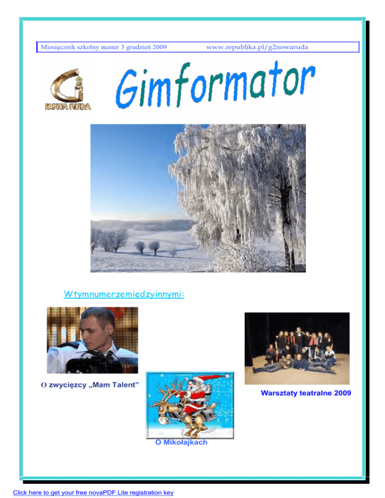 Miesięcznik szkolny numer 3 grudzień 2009 www.republika.pl/g2nowaruda W tym numerze między innymi : O zwycięzcy „Mam Talent” Warsztaty teatralne 2009 O Mikołajkach Click here to get your free novaPDF Lite registration key SPIS TREŚCI : + O Sylwestrze + Warsztaty teatralne – Czechy 2009 + Pierwszy w dziejach szkoły festiwal piosenki patriotycznej + Mikołajki +Finał programu „Mam Talent” +Walka Pudzian vs. Najman + I dodatek specjalny napisany przez uczniów klasy „Dividie et impera” + Jak zwykle trochę humoru 2 Click here to get your free novaPDF Lite registration key Sylwester Sylwester jest to święto obchodzone przez nas z trzydziestego pierwszego grudnia na pierwszego stycznia, w imieniny Sylwestra. Obchodzimy go, tańcząc i bawiąc się na różnego rodzaju przyjęciach, a także wznosząc toasty, puszczając liczne petardy i składając sobie nawzajem noworoczne życzenia. Święto to jest przełomowym momentem, gdyż witamy Nowy, a żegnamy Stary Rok, a także od tego momentu pisać będziemy liczbę o jeden większą w dacie, przez co będziemy czuli się starsi. Będzie to również początek nowego etapu w naszym życiu, w którym nie popełnimy tych samych błędów, co w minionym roku. Każdy z nas ma również nadzieję na to, że nadchodzący rok 2010 będzie lepszy od poprzedniego. Z nadchodzącym przyszłym rokiem wiążemy swoje postanowienia, plany, które chcemy zrealizować, a także chcemy, aby wszystko układało się po naszej myśli i żeby ten czas był dla nas udany i pełen miłych niespodzianek. Sylwester jest okazją do szampańskiej zabawy, a także do wielu przemyśleń i refleksji związanych z nadchodzącym rokiem. Snujemy w tym czasie różnego rodzaju plany na przyszłość i podejmujemy się wielu wyrzeczeń. Wszystkim czytelnikom z okazji sylwestra, życzę, aby przyszły rok był lepszy od poprzedniego i żeby spełniły się Wasze najskrytsze marzenia i oczekiwania!!! 3 Click here to get your free novaPDF Lite registration key Warsztaty teatralne-Czechy 2009 W dniach 23.10-25.10.2009 roku uczniowie z Gimnazjum nr 2 im. Marii Skłodowskiej Curie w Nowej Rudzie - Słupcu wzięli udział w projekcie polskoczeskim. Jest to grupa młodzieży z kółka teatralnego pod opieką pani Zosi Twardowskiej. Uczniowie zamieszkali w ''domu aktora'' przy samym teatrze w Broumovie. Pierwszego dnia zapoznaliśmy się młodzieżą czeską, reprezentantkami tamtejszej szkoły, a były nimi: Bara, Denisa, Tereza, Klara i Aniczka. Tego dnia również okazało się, że będziemy przedstawiać dramat " Romeo i Julia" Szekspira do muzyki techno. Nie było to łatwym zadaniem. Ale dzięki pomocy naszych reżyserów, pani Zosi, która nas wspierała ipomagała, kilkunastu godzinach ciężkiej pracy, udało nam się dojść do celu i skończyć przedstawienie. Ostatniego dnia pobytu w Czechach okazało się, że będziemy nagrywani. Mieliśmy tremę. 4 Click here to get your free novaPDF Lite registration key Niepotrzebnie. Wszystko się udało. Na popołudnie tego samego dnia zostały zaproszone na przedstawienie polskie nasze, rodziny, jak i czeskie. Tym razem byliśmy naprawdę stremowani. Udało się. Osiągnęliśmy cel. Po zakończeniu wszystkich prób i występów, po otrzymaniu upominków udaliśmy się do naszych pokoi razem z nowymi koleżankami. Próbowaliśmy się dogadać, wymieniliśmy się emailami i zostały zrobione pamiątkowe zdjęcia. Pełni wrażeń i nowych umiejętności aktorskich, niestety, musieliśmy wracać do domu. to Była wspaniała przygoda, którą na pewno każdy z nas będzie miło wspominać. Na szczęście, na tym nie zakończy się nasza współpraca. Mamy już wstępne terminy przyjazdu do nich i ich do nas. Będziemy występować, ale również wymyślać nowe ciekawe spektakle. 5 Click here to get your free novaPDF Lite registration key PIERWSZY W DZIEJACH SZKOŁY FESTIWAL PIOSENKI PATRIOTYCZNEJ I ŻOŁNIERSKIEJ 5 listopada 2009 roku, młodzież naszego gimnazjum po raz pierwszy uczestniczyła w Festiwalu Piosenki Patriotycznej i Żołnierskiej. Komisja konkursowa oceniała skalę trudności wykonywanego utworu, wyraz artystyczny piosenek i atrakcyjność prezentowanego materiału. Każdy z prezentowanych utworów wyróżniał się czymś osobliwym, ale na szczególną uwagę zasługuje klasa IC, której wychowawczynią jest p. Anna Mrukowska. Uczniowie przygotowali prawdziwą inscenizację z czasów wojny i okupacji, (wiemy, że nie bez owocnej współpracy z wychowawczynią), dbając o ruch sceniczny i odpowiedni ubiór. Przedstawili też trudny do wykonania, ze względu na dość skomplikowaną linię melodyczną, utwór zespołu Czerwone Gitary pt. „Biały krzyż”. Niezmiernie ciekawą interpretację, znanej wszystkim „Roty” Marii Konopnickiej, przygotowały uczennice klasy III – Marysia Woźna i Iza Waligóra, wzbudzając podziw głosem - niemal operowym. Taki talent wymaga pracy, fachowego szlifu, więc może dziewczęta powinny zadbać o ten niezwykły dar. Równie ciekawie zaprezentowała się uczennica klasy IIb – Magdalena Kawulak, która zaprezentowała żołnierską piosenkę „Rozkwitały pąki białych róż”. Duże brawa dla Madzi, bo wystąpiła solo i śpiewała a capella. Pozostaje tylko mieć nadzieję, że w przyszłym roku będzie więcej chętnych rozśpiewanych, którzy nie wstydzą się wydać z siebie głosu. Byle nie w myśl zasady, że śpiewać każdy może, trochę lepiej lub trochę gorzej… Tymczasem: I miejsce zdobyła klasa Ic; II miejsce ex aequo duet Marysia Woźna i Iza Waligóra z klasy III oraz Magdalena Kawulak z klasy IIb. NUTA 6 Click here to get your free novaPDF Lite registration key MIKOŁAJKI Mikołajki to święto obchodzone 6 grudnia na cześć świętego Mikołaja, Miry. Zasłynął on jako cudotwórca, ratował żeglarzy i uratował miasto od głodu. Wielką odwagą i sprawiedliwością wykazał się, ratując od śmierci niesłusznie skazanych urz