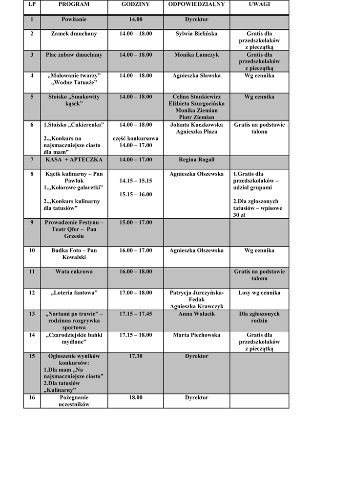 LP PROGRAM GODZINY ODPOWIEDZIALNY 1 Powitanie 14.00 Dyrektor 2 Zamek dmuchany 14.00 – 18.00 Sylwia Bielińska 3 Plac zabaw dmuchany 14.00 – 18.00 Monika Lamczyk 4 „Malowanie twarzy” „Wodne Tatuaże” 14.00 – 18.00 Agnieszka Sławska 5 Stoisko „Smakowity kąsek” 14.00 – 18.00 6 1.Stoisko „Cukierenka” 14.00 – 18.00 Celina Stankiewicz Elżbieta Szurgocińska Monika Ziemian Piotr Ziemian Jolanta Kuczkowska Agnieszka Płaza część konkursowa 14.00 – 17.00 7 2.„Konkurs na najsmaczniejsze ciasto dla mam” KASA + APTECZKA 8 Kącik kulinarny – Pan Pawluk 1.„Kolorowe galaretki” 14.00 – 17.00 UWAGI Gratis dla przedszkolaków z pieczątką Gratis dla przedszkolaków z pieczątką Wg cennika Wg cennika Gratis na podstawie talonu Regina Rogall Agnieszka Olszewska 14.15 – 15.15 1.Gratis dla przedszkolaków – udział grupami 15.15 – 16.00 2.„Konkurs kulinarny dla tatusiów” 2.Dla zgłoszonych tatusiów – wpisowe 30 zł 9 Prowadzenie Festynu – Teatr Qfer – Pan Grzesiu 15.00 – 17.00 10 Budka Foto – Pan Kowalski 16.00 – 17.00 11 Wata cukrowa 16.00 – 18.00 12 „Loteria fantowa” 17.00 – 18.00 13 „Nartami po trawie” – rodzinna rozgrywka sportowa „Czarodziejskie bańki mydlane” Ogłoszenie wyników konkursów: 1.Dla mam „Na najsmaczniejsze ciasto” 2.Dla tatusiów „Kulinarny” Pożegnanie uczestników 14 15 16 Agnieszka Olszewska Wg cennika Gratis na podstawie talonu Losy wg cennika 17.15 – 17.45 Patrycja JurczyńskaFedak Agnieszka Krawczyk Anna Walacik 17.15 – 18.00 Marta Piechowska Gratis dla przedszkolaków z pieczątką 17.30 Dyrektor 18.00 Dyrektor Dla zgłoszonych rodzin