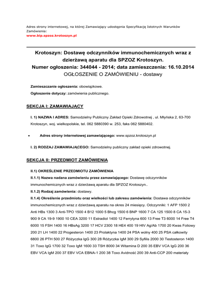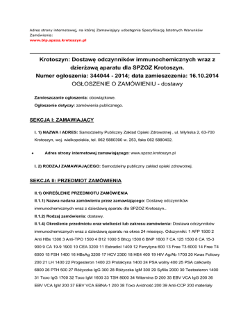 Adres strony internetowej, na której Zamawiający udostępnia Specyfikację Istotnych Warunków Zamówienia: www.bip.spzoz.krotoszyn.pl Krotoszyn: Dostawę odczynników immunochemicznych wraz z dzierżawą aparatu dla SPZOZ Krotoszyn. Numer ogłoszenia: 344044 - 2014; data zamieszczenia: 16.10.2014 OGŁOSZENIE O ZAMÓWIENIU - dostawy Zamieszczanie ogłoszenia: obowiązkowe. Ogłoszenie dotyczy: zamówienia publicznego. SEKCJA I: ZAMAWIAJĄCY I. 1) NAZWA I ADRES: Samodzielny Publiczny Zakład Opieki Zdrowotnej , ul. Młyńska 2, 63-700 Krotoszyn, woj. wielkopolskie, tel. 062 5880390 w. 253, faks 062 5880402. • Adres strony internetowej zamawiającego: www.spzoz.krotoszyn.pl I. 2) RODZAJ ZAMAWIAJĄCEGO: Samodzielny publiczny zakład opieki zdrowotnej. SEKCJA II: PRZEDMIOT ZAMÓWIENIA II.1) OKREŚLENIE PRZEDMIOTU ZAMÓWIENIA II.1.1) Nazwa nadana zamówieniu przez zamawiającego: Dostawę odczynników immunochemicznych wraz z dzierżawą aparatu dla SPZOZ Krotoszyn.. II.1.2) Rodzaj zamówienia: dostawy. II.1.4) Określenie przedmiotu oraz wielkości lub zakresu zamówienia: Dostawa odczynników immunochemicznych wraz z dzierżawą aparatu na okres 24 miesięcy. Odczynniki: 1 AFP 1500 2 Anti HBs 1300 3 Anti-TPO 1500 4 B12 1000 5 Bhcg 1500 6 BNP 1600 7 CA 125 1500 8 CA 15-3 900 9 CA 19-9 1900 10 CEA 3200 11 Estradiol 1400 12 Ferrytyna 600 13 Free T3 6000 14 Free T4 6000 15 FSH 1400 16 HBsAg 3200 17 HCV 2300 18 HE4 400 19 HIV Ag/Ab 1700 20 Kwas Foliowy 200 21 LH 1400 22 Progesteron 1400 23 Prolaktyna 1400 24 PSA wolny 400 25 PSA całkowity 6800 26 PTH 500 27 Różyczka IgG 300 28 Różyczka IgM 300 29 Syfilis 2000 30 Testosteron 1400 31 Toxo IgG 1700 32 Toxo IgM 1600 33 TSH 8000 34 Witamina D 200 35 EBV VCA IgG 200 36 EBV VCA IgM 200 37 EBV VCA EBNA-1 200 38 Toxo Avidność 200 39 Anti-CCP 200 materiały zużywalne, kalibratory i kontrole * ilość oznaczeń brutto tj. z uwzględnioną kontrolą ( wszystkie dni powszednie ) oraz kalibracją. II.1.5) przewiduje się udzielenie zamówień uzupełniających: • Określenie przedmiotu oraz wielkości lub zakresu zamówień uzupełniających • Dostawę odczynników immunochemicznych wraz z dzierżawą aparatu, maksymalnie 20% zamówienia podstawowego. II.1.6) Wspólny Słownik Zamówień (CPV): 33.12.70.00-6, 33.96.50.00-0. II.1.7) Czy dopuszcza się złożenie oferty częściowej: nie. II.1.8) Czy dopuszcza się złożenie oferty wariantowej: nie. II.2) CZAS TRWANIA ZAMÓWIENIA LUB TERMIN WYKONANIA: Okres w miesiącach: 24. SEKCJA III: INFORMACJE O CHARAKTERZE PRAWNYM, EKONOMICZNYM, FINANSOWYM I TECHNICZNYM III.1) WADIUM Informacja na temat wadium: nie dotyczy III.2) ZALICZKI III.4) INFORMACJA O OŚWIADCZENIACH LUB DOKUMENTACH, JAKIE MAJĄ DOSTARCZYĆ WYKONAWCY W CELU POTWIERDZENIA SPEŁNIANIA WARUNKÓW UDZIAŁU W POSTĘPOWANIU ORAZ NIEPODLEGANIA WYKLUCZENIU NA PODSTAWIE ART. 24 UST. 1 USTAWY III.4.1) W zakresie wykazania spełniania przez wykonawcę warunków, o których mowa w art. 22 ust. 1 ustawy, oprócz oświadczenia o spełnianiu warunków udziału w postępowaniu należy przedłożyć: III.4.2) W zakresie potwierdzenia niepodlegania wykluczeniu na podstawie art. 24 ust. 1 ustawy, należy przedłożyć: • oświadczenie o braku podstaw do wykluczenia; • aktualny odpis z właściwego rejestru lub z centralnej ewidencji i informacji o działalności gospodarczej, jeżeli odrębne przepisy wymagają wpisu do rejestru lub ewidencji, w celu wykazania braku podstaw do wykluczenia w oparciu o art. 24 ust. 1 pkt 2 ustawy, wystawiony nie wcześniej niż 6 miesięcy przed upływem terminu składania wniosków o dopuszczenie do udziału w postępowaniu o udzielenie zamówienia albo składania ofert; III.4.3) Dokumenty podmiotów zagranicznych Jeżeli wykonawca ma siedzibę lub miejsce zamieszkania poza terytorium Rzeczypospolitej Polskiej, przedkłada: III.4.3.1) dokument wystawiony w kraju, w którym ma siedzibę lub miejsce zamieszkania potwierdzający, że: • nie otwarto jego likwidacji ani nie ogłoszono upadłości - wystawiony nie wcześniej niż 6 miesięcy przed upływem terminu składania wniosków o dopuszczenie do udziału w postępowaniu o udzielenie zamówienia albo składania ofert; III.4.4) Dokumenty dotyczące przynależności do tej samej grupy kapitałowej • lista podmiotów należących do tej samej grupy kapitałowej w rozumieniu ustawy z dnia 16 lutego 2007 r. o ochronie konkurencji i konsumentów albo informacji o tym, że nie należy do grupy kapitałowej; III.5) INFORMACJA O DOKUMENTACH POTWIERDZAJĄCYCH, ŻE OFEROWANE DOSTAWY, USŁUGI LUB ROBOTY BUDOWLANE ODPOWIADAJĄ OKREŚLONYM WYMAGANIOM W zakresie potwierdzenia, że oferowane roboty budowlane, dostawy lub usługi odpowiadają określonym wymaganiom należy przedłożyć: • inne dokumenty W celu potwierdzenia, że oferowane dostawy odpowiadają wymaganiom określonym przez Zamawiającego do oferty należy dołączyć następujące dokumenty: a) Parametry graniczne analizatora - załącznik nr 5, b) dokumenty dla oferowanego aparatu wymagane zgodnie z ustawą z dnia 20 maja 2010 o wyrobach medycznych (Dz. U. 10.107.679) odpowiednio do klasy wyrobów, c) oryginał lub poświadczona przez Wykonawcę za zgodność z oryginałem kopia dokumentu producenta potwierdzająca, iż Wykonawca jest upełnomocnionym i autoryzowanym przedstawicielem w Polsce producenta zagranicznego, d) oświadczenie, iż Wykonawca posiada na terenie Polski autoryzowany serwis gwarancyjny i pogwarancyjny. III.6) INNE DOKUMENTY Inne dokumenty niewymienione w pkt III.4) albo w pkt III.5) 2.Oferta winna zawierać wszystkie dokumenty i oświadczenia wymienione w rozdziale III pkt 4 i rozdziale VI niniejszej SIWZ oraz : a.Formularz ofertowy podpisany przez osobę upoważnioną do składania oświadczenia woli w imieniu wykonawcy z wykorzystaniem wzoru - załącznik nr 1. b.Formularz cenowy podpisany przez osobę upoważnioną do składania oświadczenia woli w imieniu wykonawcy z wykorzystaniem w