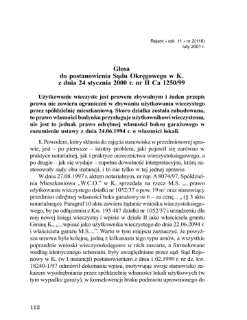 Glosa Rejent * rok 11 * nr 2(118) luty 2001 r. Glosa do postanowienia S¹du Okrêgowego w K. z dnia 24 stycznia 2000 r. nr II Ca 1250/99 U¿ytkowanie wieczyste jest prawem zbywalnym i ¿aden przepis prawa nie zawiera ograniczeñ w zbywaniu u¿ytkowania wieczystego przez spó³dzielniê mieszkaniow¹. Skoro dzia³ka zosta³a zabudowana, to prawo w³asnoœci budynku przys³uguje u¿ytkownikowi wieczystemu, nie jest to jednak prawo odrêbnej w³asnoœci boksu gara¿owego w rozumieniu ustawy z dnia 24.06.1994 r. o w³asnoœci lokali. 1. Powodem, który sk³ania do zajêcia stanowiska w przedmiotowej sprawie, jest – po pierwsze – istotny problem, jaki pojawi³ siê zarówno w praktyce notarialnej, jak i praktyce orzecznictwa wieczystoksiêgowego, a po drugie – jak siê wydaje – zupe³na dowolnoœæ interpretacyjna, któr¹ zastosowa³y s¹dy obu instancji, i to nie tylko w tej jednej sprawie. W dniu 27.08.1997 r. aktem notarialnym, nr rep. A 8074/97, Spó³dzielnia Mieszkaniowa „W.C.O.” w K. sprzeda³a na rzecz M.S. „...prawo u¿ytkowania wieczystego dzia³ki nr 1052/37 o pow. 19 m2 oraz stanowi¹cy przedmiot odrêbnej w³asnoœci boks gara¿owy nr 6 – za cenê... „ (§ 3 aktu notarialnego). Paragraf 10 aktu zawiera ¿¹danie wniosku wieczystoksiêgowego, by po od³¹czeniu z Kw. 195 487 dzia³ki nr 1052/37 i urz¹dzeniu dla niej nowej ksiêgi wieczystej i wpisie w dziale II jako w³aœciciela gruntu Gminê K., „...wpisaæ jako u¿ytkownika wieczystego do dnia 22.06.2094 r. i w³aœciciela gara¿u M.S....”. Warto w tym miejscu zaznaczyæ, ¿e powy¿sza umowa by³a kolejn¹, jedn¹ z kilkunastu tego typu umów, a wszystkie poprzednie wnioski wieczystoksiêgowe w nich zawarte, a formu³owane wed³ug identycznego schematu, by³y uwzglêdniane przez s¹d. S¹d Rejonowy w K. (w I instancji) postanowieniem z dnia 1.02.1999 r. nr dz. kw. 18240-1/97 odmówi³ dokonania wpisu, motywuj¹c swoje stanowisko zakazem wyodrêbniania przez spó³dzielniê w³asnoœci lokali u¿ytkowych (w tym wypadku gara¿y), w konsekwencji braku podmiotu uprawnionego do 112 Jacek Frelich, Glosa do postanowienia S¹du Okrêgowego w K. ... takiego gara¿u, a co za tym idzie – brak mo¿liwoœci zawarcia przedmiotowej umowy. Powy¿sze stanowisko podzieli³ S¹d Okrêgowy w K., rozpatruj¹c apelacjê nr II Ca 1250/99 od powy¿szego orzeczenia. W tym miejscu dochodzimy do pierwszej konkluzji, któr¹ mo¿na by skwitowaæ „komediê pomy³ek”, gdyby nie fakt, i¿ skutki dla nabywcy wcale nie s¹ œmieszne. S¹dy obu instancji doszuka³y siê mianowicie w treœci umowy sprzeda¿y faktów i oœwiadczeñ, które w ogóle nie mia³y tam miejsca. Nawet stosuj¹c zasadê maksymalizacji poszukiwañ autentycznej woli stron i celu umowy okreœlonej w art. 65 § 2 k.c. (sk¹din¹d tak rzadko wykorzystywanej przez s¹dy w innych sprawach wieczystoksiêgowych), trudno znaleŸæ w treœci aktu notarialnego, nr rep. A 8074/97, choæby cieñ tego, i¿ wol¹ stron by³o wyodrêbnienie w³asnoœci lokalu u¿ytkowego (gara¿u) i nastêpnie jego sprzeda¿. Dla przypomnienia, do ustanowienia odrêbnej w³asnoœci lokalu potrzebne jest stosowne zaœwiadczenie organu nadzoru architektoniczne-budowlanego, wydane na podstawie inwentaryzacji, stwierdzaj¹ce samodzielnoœæ takiego lokalu. Ponadto niezbêdna jest zgodna wola stron wywo³ania takich w³aœnie skutków czynnoœci cywilnoprawnej. Jednego i drugiego brak w przedmiotowej umowie. Pozostanie ju¿ chyba na zawsze tajemnic¹, gdzie sk³ad orzekaj¹cy wyczyta³ i sk¹d wyinterpretowa³ tak¹ w³aœnie wolê przypisywan¹ stronom tego aktu notarialnego. Nasuwa siê nieodparte wra¿enie, ¿e znaleziona zosta³a pewna teza, do której dopasowano ca³e uzasadnienie. Punktem oparcia uzasadnienia jest analiza wyra¿enia s³ownego: „odrêbna w³asnoœæ boksu gara¿owego”, zawarta w § 3 umowy w kontekœcie wyra¿enia u¿ytego we wniosku wieczystoksiêgowym, a mianowicie „w³aœciciela gara¿u”. Orzekaj¹ce w tej sprawie s¹dy nada³y wyra¿eniu „odrêbna w³asnoœæ boksu gara¿owego” znaczenie takie, jakie wynika z treœci art. 7 ustawy o w³asnoœci lokali z dnia 24 czerwca 1994 r. (Dz.U. Nr 85, poz. 388 ze zm.), zapominaj¹c zupe³nie o art. 235 k.c. W tym miejscu warto zatem przypomnieæ niektóre zasady wywodz¹ce siê z czêœci ogólnej kodeksu cywilnego (¿eby nie powiedzieæ z prawa rzymskiego), np. superficies solo cedit. Na polski jêzyk prawny zosta³o to prze³o¿one w art. 47 § 1 w zw. z art. 48 k.c., statuuj¹c, ¿e budynki – jako czêœci sk³adowe gruntu – dziel¹ jego los prawny. Jednoczeœnie jednak w art. 46 § 1 k.c., definiuj¹c pojêcie nieruchomoœci ustawodawca podzieli³ je na: 113 Glosa – gruntowe, – budynkowe i – lokalowe. Tam te¿ bodaj po raz pierwszy u¿y³ nastêpuj¹cego sformu³owania w stosunku do tych dwóch ostatnich: „je¿eli na mocy przepisów szczególnych stanowi¹ odrêbny od gruntu przedmiot w³asnoœci”. Takim w³aœnie szczególnym przepisem, powo³uj¹cym do ¿ycia instytucjê odrêbnego od gruntu przedmiotu w³asnoœci, jest art. 235 k.c., którego rozwiniêciem s¹ normy prawne zawarte w art. 239 § 2 i 240 k.c. czy te¿ przepisy art. 27 ustawy o gospodarce nieruchomoœciami z dnia 21 sierpnia 1997 r. (Dz.U. Nr 46, poz. 543). Oczywiœcie prawo w³asnoœci budynku jest œciœle zwi¹zane z prawem u¿ytkowania wieczystego gruntu, na którym budynek jest posadowiony (art. 235 § 2 k.c.) co jest wyrazem pryncypialnoœci zasady superficies solo cedit, nawet je¿eli formy prawne w³adania gruntem i budynkiem s¹ ró¿ne. Tak zatem orzeczenie obejmuj¹ce wolê sprzeda¿y prawa wieczystego u¿ytkowania gruntu wraz ze „stanowi¹cym przedmiot odrêbnej w³asnoœci boksem gara¿owym nr 6” czyni ca³kowicie zadoœæ formule kodeksowej (art. 46 § 1 w zw. z art. 235 § 1 k.c.). Co wiêcej, powy¿szej terminologii konsekwentnie u¿ywaj¹ przepisy rozporz¹dzenia wykonawczego do ustawy o ksiêgach wieczystych i hip