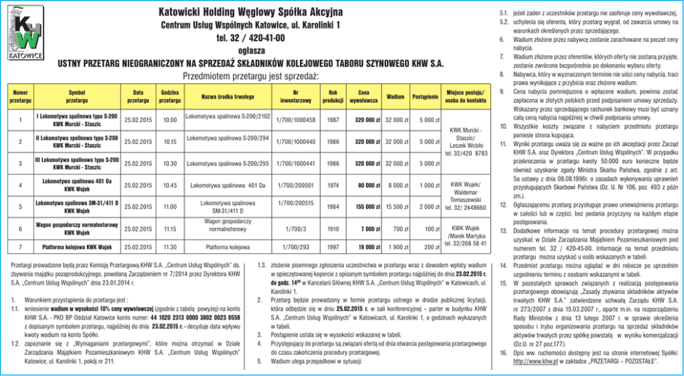 Katowicki Holding Węglowy Spółka Akcyjna Centrum Usług Wspólnych Katowice, ul. Karolinki 1 tel. 32 / 420-41-00 ogłasza USTNY PRZETARG NIEOGRANICZONY NA SPRZEDAŻ SKŁADNIKÓW KOLEJOWEGO TABORU SZYNOWEGO KHW S.A. Przedmiotem przetargu jest sprzedaż: Numer przetargu Symbol przetargu Data przetargu Godzina przetargu 1 I Lokomotywa spalinowa typu S-200 KWK Murcki - Staszic 25.02.2015 10.00 2 II Lokomotywa spalinowa typu S-200 25.02.2015 KWK Murcki - Staszic 10.15 3 III Lokomotywa spalinowa typu S-200 25.02.2015 KWK Murcki - Staszic 10.30 25.02.2015 Lokomotywa spalinowa SM-31/411 D 25.02.2015 KWK Wujek 4 5 6 7 Lokomotywa spalinowa 401 Da KWK Wujek Wagon gospodarczy normalnotorowy 25.02.2015 KWK Wujek Platforma kolejowa KWK Wujek 25.02.2015 Nr inwentarzowy Nazwa środka trwałego Lokomotywa spalinowa S-200/2102 Rok Cena produkcji wywoławcza Wadium Postąpienie 1/700/1000458 1987 320 000 zł 32 000 zł 5 000 zł 1/700/1000440 1986 320 000 zł 32 000 zł 5 000 zł Lokomotywa spalinowa S-200/295 1/700/1000441 1986 320 000 zł 32 000 zł 5 000 zł 10.45 Lokomotywa spalinowa 401 Da 1/700/200501 1974 11.00 Lokomotywa spalinowa SM-31/411 D 1/700/200515 Lokomotywa spalinowa S-200/294 1984 80 000 zł 8 000 zł 155 000 zł 15 500 zł 11.15 Wagon gospodarczy normalnotorowy 1/700/3 1910 7 000 zł 700 zł 11.30 Platforma kolejowa 1/700/293 1997 19 000 zł 1 900 zł Przetargi prowadzone będą przez Komisję Przetargową KHW S.A. „Centrum Usług Wspólnych” ds. zbywania majątku pozaprodukcyjnego, powołaną Zarządzeniem nr 7/2014 przez Dyrektora KHW S.A. „Centrum Usług Wspólnych” dnia 23.01.2014 r. 1. Warunkiem przystąpienia do przetargu jest : 1.1. wniesienie wadium w wysokości 10% ceny wywoławczej (zgodnie z tabelą powyżej) na konto KHW S.A. - PKO BP Oddział Katowice konto numer: 44 1020 2313 0000 3802 0023 9558 z dopisanym symbolem przetargu, najpóźniej do dnia 23.02.2015 r. - decyduje data wpływu kwoty wadium na konto Spółki. 1.2. zapoznanie się z „Wymaganiami przetargowymi”, które można otrzymać w Dziale Zarządzania Majątkiem Pozamieszkaniowym KHW S.A. „Centrum Usług Wspólnych” Katowice, ul. Karolinki 1, pokój nr 211. Miejsce postoju/ osoba do kontaktu KWK Murcki Staszic/ Leszek Wcisło tel. 32/420 8783 KWK Wujek/ Waldemar Tomaszewski 2 000 zł tel. 32/ 2448660 1 000 zł KWK Wujek /Marek Martyka 200 zł tel. 32/208 58 41 100 zł 1.3. złożenie pisemnego zgłoszenia uczestnictwa w przetargu wraz z dowodem wpłaty wadium w opieczętowanej kopercie z opisanym symbolem przetargu najpóźniej do dnia 23.02.2015 r. do godz. 1400 w Kancelarii Głównej KHW S.A. „Centrum Usług Wspólnych” w Katowicach, ul. Karolinki 1. 2. Przetarg będzie prowadzony w formie przetargu ustnego w drodze publicznej licytacji, która odbędzie się w dniu 25.02.2015 r. w sali konferencyjnej – parter w budynku KHW S.A. „Centrum Usług Wspólnych” w Katowicach, ul. Karolinki 1, o godzinach wykazanych w tabeli. 3.Postąpienie ustala się w wysokości wskazanej w tabeli. 4.Przystępujący do przetargu są związani ofertą od dnia otwarcia postępowania przetargowego do czasu zakończenia procedury przetargowej. 5.Wadium ulega przepadkowi w sytuacji: 5.1. jeżeli żaden z uczestników przetargu nie zaoferuje ceny wywoławczej, 5.2. uchylenia się oferenta, który przetarg wygrał, od zawarcia umowy na warunkach określonych przez sprzedającego. 6.Wadium złożone przez nabywcę zostanie zarachowane na poczet ceny nabycia. 7.Wadium złożone przez oferentów, których oferty nie zostaną przyjęte, zostanie zwrócone bezpośrednio po dokonaniu wyboru oferty. 8.Nabywca, który w wyznaczonym terminie nie uiści ceny nabycia, traci prawa wynikające z przybicia oraz złożone wadium. 9.Cena nabycia pomniejszona o wpłacone wadium, powinna zostać zapłacona w złotych polskich przed podpisaniem umowy sprzedaży. Wskazany przez sprzedającego rachunek bankowy musi być uznany całą ceną nabycia najpóźniej w chwili podpisania umowy. 10.Wszystkie koszty związane z nabyciem przedmiotu przetargu poniesie strona kupująca. 11.Wyniki przetargu uważa się za ważne po ich akceptacji przez Zarząd KHW S.A. oraz Dyrektora „Centrum Usług Wspólnych”. W przypadku przekroczenia w przetargu kwoty 50.000 euro konieczne będzie również uzyskanie zgody Ministra Skarbu Państwa, zgodnie z art. 5a ustawy z dnia 08.08.1996r. o zasadach wykonywania uprawnień przysługujących Skarbowi Państwa (Dz. U. Nr 106, poz. 493 z późn zm.). 12.Ogłaszającemu przetarg przysługuje prawo unieważnienia przetargu w całości lub w części, bez podania przyczyny na każdym etapie postępowania. 13.Dodatkowe informacje na temat procedury przetargowej można uzyskać w Dziale Zarządzania Majątkiem Pozamieszkaniowym pod numerem tel. 32 / 420-45-00. Informacje na temat przedmiotu przetargu można uzyskać u osób wskazanych w tabeli. 14.Przedmiot przetargu można oglądać w dni robocze po uprzednim uzgodnieniu terminu z osobami wskazanymi w tabeli. 15.W pozostałych sprawach związanych z realizacją postępowania przetargowego obowiązują „Zasady zbywania składników aktywów trwałych KHW S.A.” zatwierdzone uchwałą Zarządu KHW S.A. nr 273/2007 z dnia 15.03.2007 r., oparte m.in. na rozporządzeniu Rady Ministrów z dnia 13 lutego 2007 r. w sprawie określenia sposobu i trybu organizowania przetargu na sprzedaż składników aktywów trwałych przez spółkę powstałą w wyniku komercjalizacji (Dz.U. nr 27 poz.177). 16.Opis ww. ruchomości dostępny jest na stronie internetowej Spółki: http://www.khw.pl w zakładce „PRZETARGI – POZOSTAŁE”.