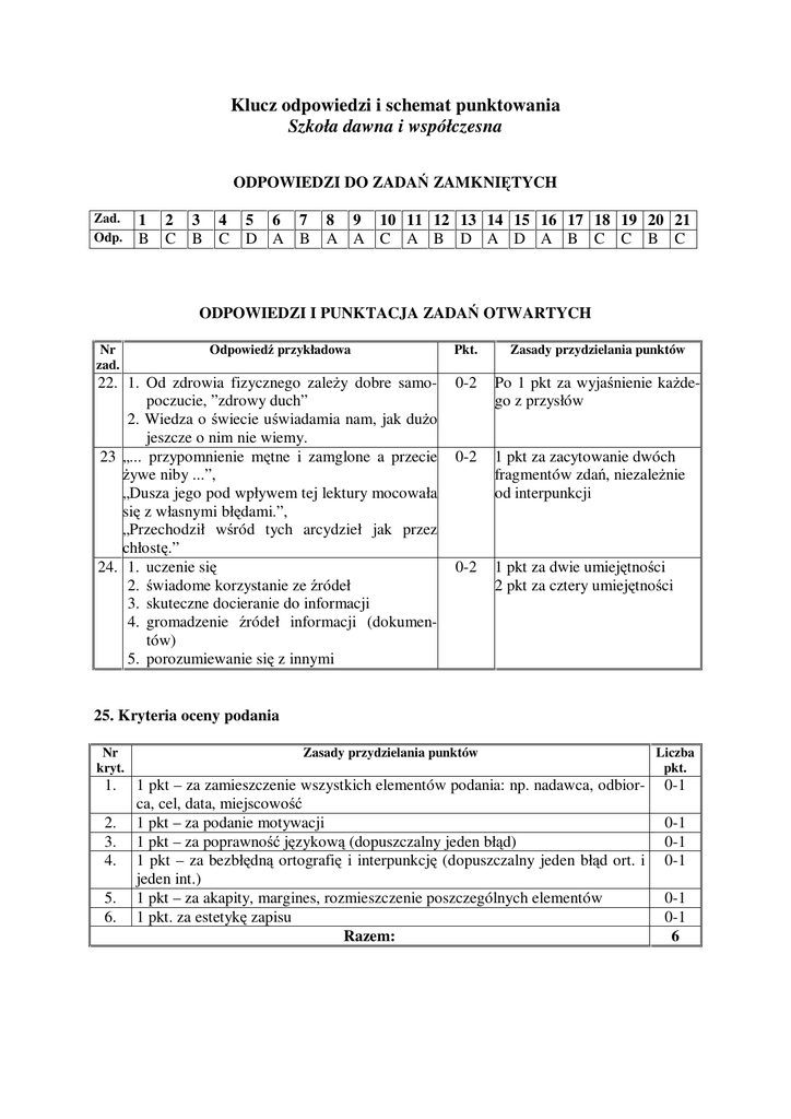 Klucz odpowiedzi i schemat punktowania Szkoła dawna i współczesna ODPOWIEDZI DO ZADA ZAMKNI TYCH Zad. Odp. 1 B 2 C 3 B 4 C 5 6 7 D A B 8 9 10 11 12 13 14 15 16 17 18 19 20 21 A A C A B D A D A B C C B C ODPOWIEDZI I PUNKTACJA ZADA OTWARTYCH Nr zad. Odpowied przykładowa 22. 1. Od zdrowia fizycznego zale y dobre samopoczucie, ”zdrowy duch” 2. Wiedza o wiecie u wiadamia nam, jak du o jeszcze o nim nie wiemy. 23 „... przypomnienie m tne i zamglone a przecie ywe niby ...”, „Dusza jego pod wpływem tej lektury mocowała si z własnymi bł dami.”, „Przechodził w ród tych arcydzieł jak przez chłost .” 24. 1. uczenie si 2. wiadome korzystanie ze ródeł 3. skuteczne docieranie do informacji 4. gromadzenie ródeł informacji (dokumentów) 5. porozumiewanie si z innymi Pkt. Zasady przydzielania punktów 0-2 Po 1 pkt za wyja nienie ka dego z przysłów 0-2 1 pkt za zacytowanie dwóch fragmentów zda , niezale nie od interpunkcji 0-2 1 pkt za dwie umiej tno ci 2 pkt za cztery umiej tno ci 25. Kryteria oceny podania Nr kryt. 1. 2. 3. 4. 5. 6. Zasady przydzielania punktów 1 pkt – za zamieszczenie wszystkich elementów podania: np. nadawca, odbiorca, cel, data, miejscowo 1 pkt – za podanie motywacji 1 pkt – za poprawno j zykow (dopuszczalny jeden bł d) 1 pkt – za bezbł dn ortografi i interpunkcj (dopuszczalny jeden bł d ort. i jeden int.) 1 pkt – za akapity, margines, rozmieszczenie poszczególnych elementów 1 pkt. za estetyk zapisu Razem: Liczba pkt. 0-1 0-1 0-1 0-1 0-1 0-1 6 MATERIAŁY POMOCNICZE DLA NAUCZYCIELI OKR GOWA KOMISJA EGZAMINACYJNA W ŁOM Y 26. Kryteria oceny wypracowania Nr kryt. Kryteria oceny Pkt. 1 TEMAT (0 - 7 pkt) 1. Tekst w cało ci jest zgodny z tematem (dopuszczalne s pewne odst pstwa od 0 - 1 tematu) 2. Rozwini cie tematu obejmuje: a. podanie trafnego przykładu, 0-1 b. rozwijanie przykładu, 0-1 c. zachowanie przyczynowo – skutkowego toku wypowiedzi, 0–1 d. podsumowanie rozwa a , 0-1 e. realizowanie tematu zgodnie z okre lon koncepcj (zachowanie podsta- 0 – 1 wowych cech formy opowiadania). 3. Praca jest poprawna pod wzgl dem rzeczowym. 0-1 2 KOMPOZYCJA (0 - 3 pkt)* 4. Tekst ma kompozycj trójdzieln z zachowaniem wła ciwych proporcji. 0-1 5. Tekst jest spójny (istniej j zykowe nawi zania pomi dzy poszczególnymi 0 - 1 cz ciami pracy). 6. Tekst jest logicznie uporz dkowany (nie pojawiaj si nieuzasadnione powtó- 0 - 1 rzenia). 3 J ZYK I STYL (0 - 4 pkt)* 7. - Poprawne (pod wzgl dem znaczeniowym) słownictwo, równie 0-3 w zwi zkach frazeologicznych. (dopuszczalne - Poprawna odmiana wyrazów oraz ł czenie wyrazów w zdania i zda trzy bł dy, niepojedynczych w zdania zło one (nie pojawia si powtarzanie tych sa- zale nie od kamych struktur zdaniowych). tegorii) - Trafnie dobrane rodki j zykowe (nie pojawiaj si : wulgaryzmy, 3 bł. - 3 pkt nieuzasadnione kolokwializmy, wielosłowie, wieloznaczno , mie- 4 bł. - 2 pkt szanie stylów, nieuzasadnione powtarzanie wyrazów, nadu ywanie 5 bł. - 1 pkt wyrazów obcych, nieuzasadnionych wyra e typu: praktycznie rzecz 6 bł. - 0 pkt bior c, dajmy na to, powiedzmy). 8. Styl jest funkcjonalny (dostosowany do sytuacji komunikacyjnej, 0-1 formy wypowiedzi). 4 ZAPIS (0 - 3 pkt)* 9. Ortografia jest poprawna. 0-2 0 bł. - 2 pkt 1 bł. - 1 pkt 2 bł. - 0 pkt 10. Interpunkcja jest poprawna (dopuszczalne 3 bł dy). 0-1 0 - 17 Razem * - Punktów z tych kategorii nie przyznaje si , je li praca jest krótsza ni połowa wymaganej obj to ci. Uwaga! Ucze nie otrzymuje punktów za wypracowanie, je eli w cało ci jest ono niezgodne z tematem. 4