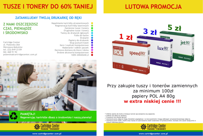 TUSZE I TONERY DO 60% TANIEJ LUTOWA PROMOCJA ZATANKUJEMY TWOJĄ DRUKARKĘ OD RĘKI Z NAMI OSZCZĘDZISZ CZAS, PIENIĄDZE I ŚRODOWISKO Cartridge Center ul. Puławska 26A Warszawa Mokotów tel. (22) 849 23 89 GG: 468 91 92 [email protected] Napełnianie kartridży atramentowych Regeneracja kartridży laserowych Zamienne tusze i tonery Oryginalne tusze i tonery Taśmy do drukarek igłowych Folie do faxów Drukarki Papiery do drukarek Skup pustych kaset Xero i wydruki komputerowe Nadawanie i odbiór paczek Darmowa dostawa do biura i domu Drobne akcesoria komputerowe 100% GWARANCJI Przy zakupie tuszy i tonerów zamiennych za minimum 100zł papiery POL A4 80g w extra niskiej cenie !!! PAMIĘTAJ! Regenerując kartridźe dbasz o środowisko i naszą planetę! * * * * * O ferta ważna do końc a mieiąc a lub do wyc zerpania s ię zapas ów. O ferta nie dotyc zy dowozu. P romoc ji nie mozna łąc zyć . Zamies zc zone zdjęc ia mają c harakter poglądowy i w rzec zywis toś c i mogą odbiegać od prezentowanego zdjęc ia. Zamies zc zone znaki, marki oraz nazwy to zas trzeżone znaki towarowe ic h produc entów. Zos tały one użyte wyłąc znie w c elac h informac yjnyc h.