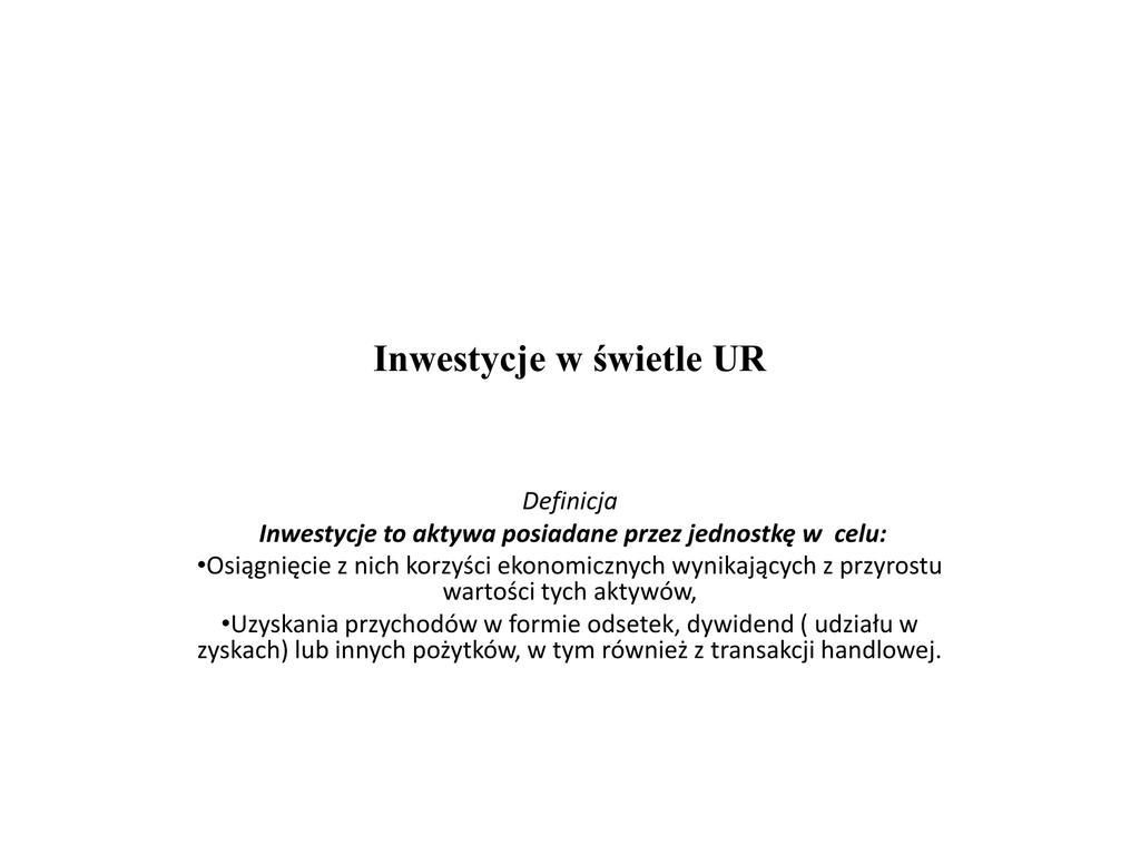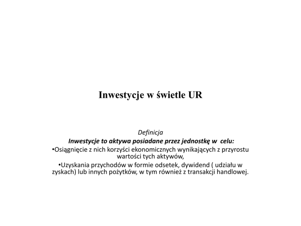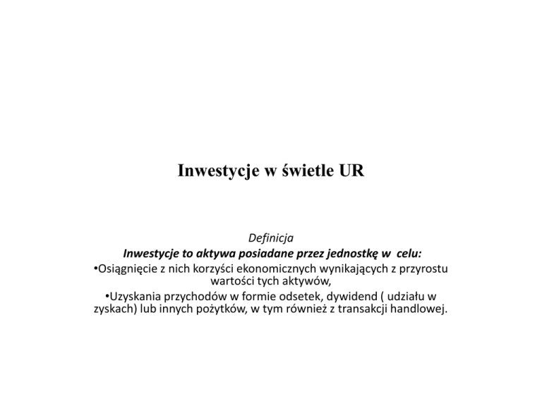 Inwestycje w świetle UR Definicja Inwestycje to aktywa posiadane przez jednostkę w celu: •Osiągnięcie z nich korzyści ekonomicznych wynikających z przyrostu wartości tych aktywów, •Uzyskania przychodów w formie odsetek, dywidend ( udziału w zyskach) lub innych pożytków, w tym również z transakcji handlowej. Ustawa do inwestycji zalicza w szczególności: • Aktywa finansowe, • Nieruchomości, • Wartości niematerialne i prawne, Które nie są przez nią użytkowane. MSR 40 – Nieruchomości inwestycyjne Do kategorii nieruchomości inwestycyjnej wg MSR 40 zalicza się: • Grunty • Budynki Które właściciel lub leasingobiorca w leasingu finansowym traktuje jako źródło przychodów z czynszu lub utrzymuje w posiadaniu ze względu na przyrost wartości A nie w drodze: Wykorzystania przy produkcji, dostawach towarów, świadczeniu usług lub w czynnościach administracyjnych lub Sprzedaży w ramach zwykłej działalności Cechą charakterystyczną takiej nieruchomości jest fakt, iż przepływy generowane przez jednostkę z tytułu posiadania takiej nieruchomości są w dużej mierze niezależne od pozostałych aktywów jednostki. Pozycje bilansowe nieruchomości ze względu na przeznaczenie Nieruchomości Przeznaczone na sprzedaż w ujmowane Dotychczas jako środki trwałe lub inwestycje Użytkowane na własne potrzeby Użytkowane na własne potrzeby Na podstawie leasingu finansowego W trakcie budowy lub dostosowywania Osób trzecich Pozycja w sprawozdaniu finansowym Aktywa trwałe Przeznaczone do sprzedaży Rzeczowe aktywa trwałe MSR regulujący zasady ujmowania i wyceny MSSF 5 MSR 16 Rzeczowe aktywa trwałe MSR 17 Koszty działalności MSR 11 umowy o budowę Przeznaczone na sprzedaż w ramach zwykłej działalności Zapasy MSR 2 Start Czy nieruchomość jest przeznaczona na sprzedaż tak Stosuj MSR2 nie Czy nieruchomość jest zajmowana przez jej właściciela tak Stosuj MSR 16 nie Czy nieruchomość jest w trakcie budowy na zlecenie klienta tak Stosuj MSR 11 nie Czy nieruchomość jest nieruchomością inwestycyjną tak Stosuj MSR 40 Klasyfikacja nieruchomości w przypadku osiągania przychodów z tyt. świadczenia usług dodatkowych Przychody ze sprzedaży Przychody z najmu Usług dodatkowych Przychody ze sprzedaży Usług dodatkowych Przychody z najmu Wycena nieruchomości inwestycyjnych • Według kosztu wytworzenia lub ceny nabycia, pomniejszonych o odpisy amortyzacyjne i umorzeniowe oraz odpisy z tytułu trwałej utraty wartości ( wycena zgodnie z MSR 16) • Według ceny rynkowej bądź inaczej określonej wartości godziwej ( po dokonaniu wyceny wartość pozostaje niezmieniona aż do następnej wyceny czyli nie dokonuje się odpisów amortyzacyjnych) • Skutki aktualizacji wyceny odnosi się w pozostałe przychody, koszty operacyjne ( w wynik okresu, w który aktualizacja miała miejsce) Zadanie Spółka Halinex posiada kilka nieruchomości. Poniżej zaprezentowano szczegółowe informacje dotyczące tych nieruchomości: • Rodzaj nieruchomości cena nabycia wartość godziwa wartość godziwa na 01.01.2011 31.12. 2012 31.12.2013 Nieruchomość A Nieruchomość B Nieruchomość C 150 000 120 000 120 000 240 000 180 000 140 000 200 000 145 000 150 000 Wszystkie trzy nieruchomości zostały zakupione 01.01.2011r. nieruchomości A i B to 50 lat. Nieruchomość C będzie użytkowana przez 15 lat. Nieruchomość A jest wynajmowana na warunkach komercyjnych spółce zależnej od Halinex. Inne nieruchomości są również wynajmowane na warunkach komercyjnych, ale jednostkom niepowiązanym. Halinex wycenia nieruchomości inne niż inwestycyjne wg modelu historycznego. Natomiast w przypadku nieruchomości inwestycyjnych wycena dokonywana jest wg modelu wartości godziwej. Polecenia: • Wycenić poszczególne aktywa, wskazać prezentację rachunku zysków i strat. Zadanie Firma AS dysponuje niżej wymienionymi nieruchomościami co do, których nie jest pewna, w jaki sposób je ująć w księgach: a) Budynek, który 5 lat wcześniej został nabyty ca 150 000,-. Nieruchomość jest własnością spółki i jest wynajmowana osobom prywatnym na okresy sześciomiesięczne. Obecna wartość rynkowa nieruchomości wynosi 175 000,b) Biurowiec, który został zakupiony 10 lat temu i kosztował wówczas 75 000,-, w biurowcu mieści się główna siedziba spółki, c) Rozpoczęta inwestycja zrealizowana w dwóch trzecich, AS zamierza wynająć obiekt spółce XXX, w której posiada kontrolny pakiet udziałów Spółka AS stosuje stawkę amortyzacji w wysokości 2% rocznie. Polecenie: Opisz najbardziej odpowiedni sposób ujęcia każdej z wymienionych wyżej nieruchomości