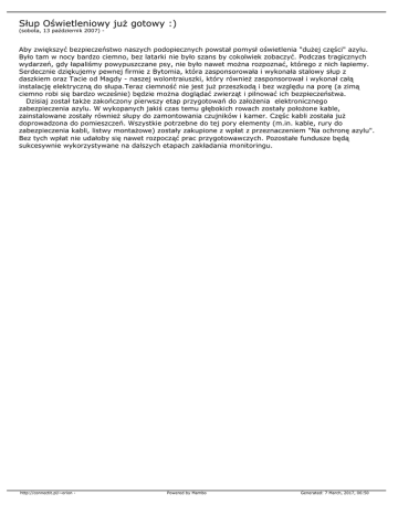 Słup Oświetleniowy już gotowy :) (sobota, 13 październik 2007) - Aby zwiększyć bezpieczeństwo naszych podopiecznych powstał pomysł oświetlenia "dużej części" azylu. Było tam w nocy bardzo ciemno, bez latarki nie było szans by cokolwiek zobaczyć. Podczas tragicznych wydarzeń, gdy łapaliśmy powypuszczane psy, nie było nawet można rozpoznać, którego z nich łapiemy. Serdecznie dziękujemy pewnej firmie z Bytomia, która zasponsorowała i wykonała stalowy słup z daszkiem oraz Tacie od Magdy - naszej wolontraiuszki, który również zasponsorował i wykonał całą instalację elektryczną do słupa.Teraz ciemność nie jest już przeszkodą i bez względu na porę (a zimą ciemno robi się bardzo wcześnie) będzie można doglądać zwierząt i pilnować ich bezpieczeństwa. Dzisiaj został także zakończony pierwszy etap przygotowań do założenia elektronicznego zabezpieczenia azylu. W wykopanych jakiś czas temu głębokich rowach zostały położone kable, zainstalowane zostały również słupy do zamontowania czujników i kamer. Częśc kabli została już doprowadzona do pomieszczeń. Wszystkie potrzebne do tej pory elementy (m.in. kable, rury do zabezpieczenia kabli, listwy montażowe) zostały zakupione z wpłat z przeznaczeniem "Na ochronę azylu". Bez tych wpłat nie udałoby się nawet rozpocząć prac przygotowawczych. Pozostałe fundusze będą sukcesywnie wykorzystywane na dalszych etapach zakładania monitoringu. http://connectit.pl/~orion - Powered by Mambo Generated: 7 March, 2017, 06:50