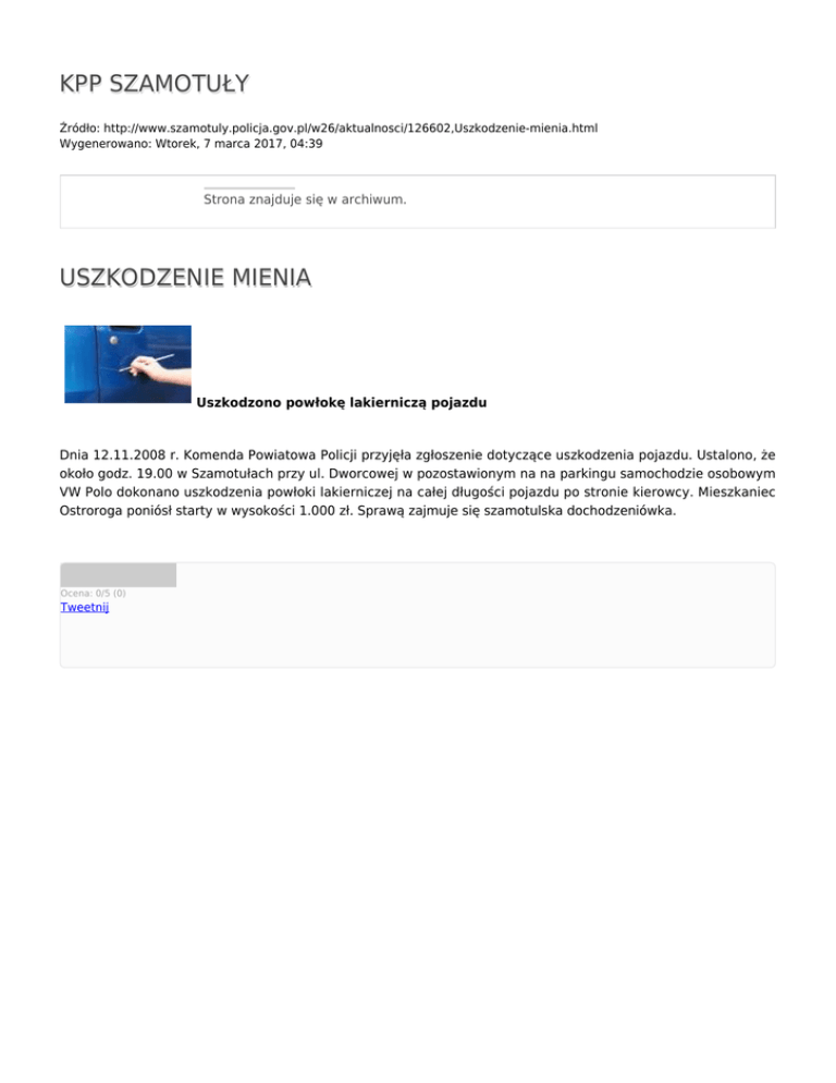 KPP SZAMOTUŁY Źródło: http://www.szamotuly.policja.gov.pl/w26/aktualnosci/126602,Uszkodzenie-mienia.html Wygenerowano: Wtorek, 7 marca 2017, 04:39 Strona znajduje się w archiwum. USZKODZENIE MIENIA Uszkodzono powłokę lakierniczą pojazdu Dnia 12.11.2008 r. Komenda Powiatowa Policji przyjęła zgłoszenie dotyczące uszkodzenia pojazdu. Ustalono, że około godz. 19.00 w Szamotułach przy ul. Dworcowej w pozostawionym na na parkingu samochodzie osobowym VW Polo dokonano uszkodzenia powłoki lakierniczej na całej długości pojazdu po stronie kierowcy. Mieszkaniec Ostroroga poniósł starty w wysokości 1.000 zł. Sprawą zajmuje się szamotulska dochodzeniówka. Ocena: 0/5 (0) Tweetnij