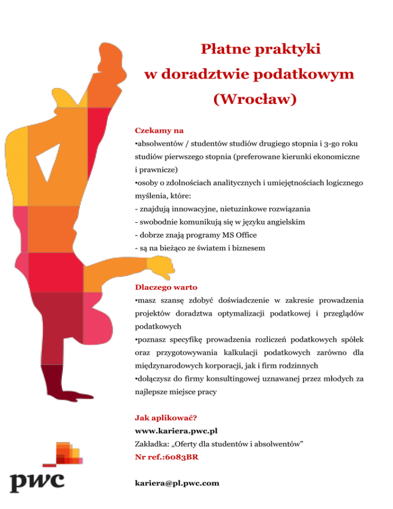 Płatne praktyki w doradztwie podatkowym (Wrocław) Czekamy na •absolwentów / studentów studiów drugiego stopnia i 3-go roku studiów pierwszego stopnia (preferowane kierunki ekonomiczne i prawnicze) •osoby o zdolnościach analitycznych i umiejętnościach logicznego myślenia, które: - znajdują innowacyjne, nietuzinkowe rozwiązania - swobodnie komunikują się w języku angielskim - dobrze znają programy MS Office - są na bieżąco ze światem i biznesem Dlaczego warto •masz szansę zdobyć doświadczenie w zakresie prowadzenia projektów doradztwa optymalizacji podatkowej i przeglądów podatkowych •poznasz specyfikę prowadzenia rozliczeń podatkowych spółek oraz przygotowywania kalkulacji podatkowych zarówno dla międzynarodowych korporacji, jak i firm rodzinnych •dołączysz do firmy konsultingowej uznawanej przez młodych za najlepsze miejsce pracy Jak aplikować? www.kariera.pwc.pl Zakładka: „Oferty dla studentów i absolwentów” Nr ref.:6083BR [email protected]