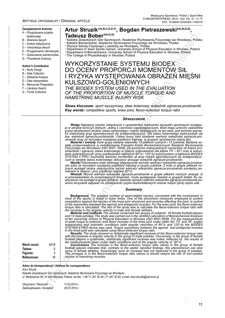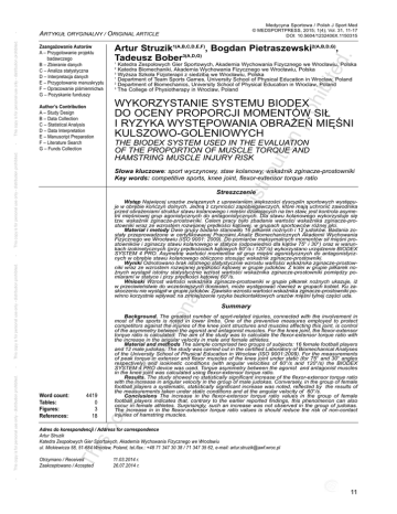 ed . 1 Katedra Zespołowych Gier Sportowych, Akademia Wychowania Fizycznego we Wrocławiu, Polska Katedra Biomechaniki, Akademia Wychowania Fizycznego we Wrocławiu, Polska Wyższa Szkoła Fizjoterapii z siedzibą we Wrocławiu, Polska 1 Department of Team Sports Games, University School of Physical Education in Wroclaw, Poland 2 Department of Biomechanics, University School of Physical Education in Wroclaw, Poland 3 The College of Physiotherapy in Wroclaw, Poland 2 3 tio np roh ibit Author’s Contribution A – Study Design B – Data Collection C – Statistical Analysis D – Data Interpretation E – Manuscript Preparation F – Literature Search G – Funds Collection Artur Struzik1(A,B,C,D,E,F), Bogdan Pietraszewski2(A,B,D,G), Tadeusz Bober3(A,D,G) WYKORZYSTANIE SYSTEMU BIODEX DO OCENY PROPORCJI MOMENTÓW SIŁ I RYZYKA WYSTĘPOWANIA OBRAŻEŃ MIĘŚNI KULSZOWO-GOLENIOWYCH ibu THE BIODEX SYSTEM USED IN THE EVALUATION OF THE PROPORTION OF MUSCLE TORQUE AND HAMSTRING MUSCLE INJURY RISK dis tr Słowa kluczowe: sport wyczynowy, staw kolanowy, wskaźnik zginacze-prostowniki Key words: competitive sports, knee joint, flexor-extensor torque ratio Streszczenie rso na lu This copy is for personal use only - distribution prohibited. se - on ly - Wstęp Najwięcej urazów związanych z uprawianiem większości dyscyplin sportowych występuje w obrębie kończyn dolnych. Jedną z czynności zapobiegawczych, które mają uchronić zawodnika przed obrażeniami struktur stawu kolanowego i mięśni działających na ten staw, jest kontrola asymetrii mięśniowej grup agonistycznych do antagonistycznych. Dla stawu kolanowego wykorzystuje się tzw. wskaźnik zginacze-prostowniki. Celem pracy było zbadanie wartości wskaźnika zginacze-prostowniki wraz ze wzrostem rozwijanej prędkości kątowej, w grupach sportowców różnej płci. Materiał i metody Dwie grupy badane stanowiło 16 piłkarek nożnych i 12 judoków. Badania zostały przeprowadzone w certyfikowanej Pracowni Analiz Biomechanicznych Akademii Wychowania Fizycznego we Wrocławiu (ISO 9001: 2009). Do pomiarów maksymalnych momentów sił mięśni prostowników i zginaczy stawu kolanowego w statyce (odpowiednio dla kątów 75° i 30°) oraz w warunkach izokinetycznych (przy prędkościach kątowych 60°/s i 120°/s) wykorzystano urządzenie BIODEX SYSTEM 4 PRO. Asymetrię wartości momentów sił grup mięśni agonistycznych do antagonistycznych w obrębie stawu kolanowego obliczono stosując wskaźnik zginacze-prostowniki. Wyniki Odnotowano brak istotnego statystycznie wzrostu wartości wskaźnika zginacze-prostowniki wraz ze wzrostem rozwijanej prędkości kątowej w grupie judoków. Z kolei w grupie piłkarek nożnych wystąpił istotny statystycznie wzrost wartości wskaźnika zginacze-prostowniki pomiędzy pomiarami w statyce i przy prędkości kątowej 60°/s. Wnioski Wzrost wartości wskaźnika zginacze-prostowniki w grupie piłkarek nożnych ukazuje, iż w przeciwieństwie do wcześniejszych doniesień, może występować również w grupach kobiet. Ku zaskoczeniu nie wystąpił w grupie judoków. Zjawisko wzrostu wartości wskaźnika zginacze-prostowniki powinno korzystnie wpływać na zmniejszenie ryzyka bezkontaktowych urazów mięśni tylnej części uda. Summary 4419 0 3 18 is c Word count: Tables: Figures: References: y is - for pe Background. The greatest number of sport-related injuries, connected with the involvement in most of the sports is noted in lower limbs. One of the preventive measures employed to protect competitors against the injuries of the knee joint structures and muscles affecting this joint, is control of the asymmetry between the agonist and antagonist muscles. For the knee joint, the flexor-extensor torque ratio is calculated. The aim of the study was to calculate the flexor-extensor torque ratio with the increase in the angular velocity in male and female athletes. Material and methods The sample comprised two groups of subjects: 16 female football players and 12 male judokas. The study was carried out in the certified Laboratory of Biomechanical Analyses of the University School of Physical Education in Wroclaw (ISO 9001:2009). For the measurements of peak torque in extensor and flexor muscles of the knee joint under static (for 75° and 30° angles respectively) and isokinetic conditions (with angular velocities of 60°/s and 120°/s) the BIODEX SYSTEM 4 PRO device was used. Torque asymmetry between the agonist and antagonist muscles in the knee joint was calculated using flexor-extensor torque ratio. Results. The study showed no statistically significant increase of the flexor-extensor torque ratio with the increase in angular velocity in the group of male judokas. Conversely, in the group of female football players a systematic, statistically significant increase was noted, reflected by the results of the measurements taken under static conditions and at the angular velocity of 60°/s. Conclusions The increase in the flexor-extensor torque ratio values in the group of female football players indicates that, contrary to the earlier reported findings, this phenomenon can also occur in female athletes. Surprisingly, such an increase was not observed in the group of judokas. The increase in in the flexor-extensor torque ratio values is should reduce the risk of non-contact injuries of hamstring muscles. op This copy is for personal use only - distribution prohibited. Zaangażowanie Autorów A – Przygotowanie projektu badawczego B – Zbieranie danych C – Analiza statystyczna D – Interpretacja danych E – Przygotowanie manuskryptu F – Opracowanie piśmiennictwa G – Pozyskanie funduszy This copy is for personal use only - distribution prohibited. - ARTYKUŁ ORYGINALNY / ORIGINAL ARTICLE Th Adres do korespondencji / Address for correspondence Artur Struzik Katedra Zespołowych Gier Sportowych, Akademia Wychowania Fizycznego we Wrocławiu ul. Mickiewicza 58, 51-684 Wrocław, Poland, tel./fax.: +4