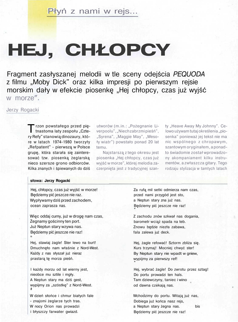 Płyń z nami w rejs... HEJ, CHŁOPCY Fragment zasłyszanej melodii w tle sceny odejścia PEQUODA z filmu „Moby Dick" oraz kilka impresji po pierwszym rejsie morskim dały w efekcie piosenkę „Hej chłopcy, czas już wyjść w morze Jerzy Rogacki rzon powstałego przed piętnastoma laty zespołu „Cztery Refy" stanowią dinozaury, które w latach 1974-1980 tworzyły „Refpatent" - pierwszą w Polsce grupę, która starała się zainteresować tzw. piosenką żeglarską nieco szersze grono odbiorców. Kilka znanych i śpiewanych do dziś T utworów (m.in.: „Pożegnanie Liverpoolu", „Niech zabrzmi pieśń", „Syrena", „Maggie May", „Wesoły wiatr") powstało ponad 20 lat temu. Najstarszą z tego okresu jest piosenka „Hej chłopcy, czas już wyjść w morze", której melodia zaczerpnięta jest z tradycyjnej szan- ty „Heave Away My Johnny". Celowo używam tutaj określenia „piosenka" ponieważ jej tekst nie ma nic wspólnego z chropawym, szantowym oryginałem, a ponadto świadomie został wprowadzony akompaniament kilku instrumentów, a zwłaszcza gitary. Tego rodzaju stylizacja w tamtych latach słowa: Jerzy Rogacki Hej, chłopcy, czas już wyjść w morze! Będziemy pić jeszcze nie raz. Wypływamy dziś przed zachodem, ocean zaprasza nas. Za rufą mil setki odmierza nam czas, przed nami przygód jest sto, a Neptun stary zna już nas. Będziemy pić jeszcze nie raz! * Więc oddaj curny, już w drogę nam czas, Żegnamy gościnny ten port. Już Neptun stary wzywa nas. Będziemy pić jeszcze nie raz! Z zachodu znów szkwał nas dogania, barometr wciąż spada na teb. Znowu będzie niezła zabawa, fala zalewa już deck. s Hej, stawiaj żagle! Ster lewo na burt! Dmuchnęło nam właśnie z Nord-West. Każdy z nas słyszał już nieraz prastarą tę morza pieśń. Hej, żagle refować! Sztorm zbliża się. Kurs trzymaj! Mocniej chwyć ster! By Neptun stary nie wpadt w gniew, wypijmy za pierwszy ref! * l każdy morzu od lat wierny jest, nieobce mu sztile i mgły. A Neptun stary ma dziś gest, wypijmy za „szóstkę" z Nord-West. # Hej, wybrać żagle! Do zwrotu przez sztag! Do portu prowadzi ten hals. Tam dziewczyny, taniec i wino od dawna czekają nas. W dzień słońce i chmur białych fale - znajomi żeglarze tych tras. W nocy Orion nas prowadzi i błyszczy farwater gwiazd. Wchodzimy do portu. Witają już nas, Dobiega już końca nasz rejs, a Neptun stary żegna nas. bis Będziemy pić jeszcze nie raz! była wręcz rewolucją, którą można by porównać z obecnym wprowadzaniem do piosenek żeglarskich instrumentów elektrycznych. Byto to wręcz niezbędne, żeby tego rodzaju utwory mogły być zaakceptowane przez grono większe niż kilku zaprzyjaźnionych żeglarzy. Oczywiście, nic nie stało na przeszkodzie, żeby sięgnąć po „elektrykę" (notabene większość „Refpatentu" stanowili studenci Wydziału E l e k t r y c z n e g o Poltechniki Łódzkiej), ale jakoś nikt nie wpadł na taki pomysł i po prostu zachowano rozsądny umiar. Pierwszą ofiarą takiej stylizacji padła wspomniana wyżej szanta. Fragment zasłyszanej melodii w tle sceny odejścia PEOUODA z filmu „Moby Dick" oraz kilka impresji po pierwszym rejsie morskim dały w efekcie piosenkę „Hej chłopcy, czas już wyjść w morze". Weszła ona na trwałe do repertuaru grupy, była śpiewana publicznie na pierwszej YAPIE w 1974 r. a następnie przez długie lata pojawiała się w kolejnych śpiewnikach turystycznych i żeglarskich. Gdy z perspektywy lat próbowałem ponownie porównać ten utwór z oryginałem, czy choćby z jego polską wersją „Ciągaj fał, J o h n n y " (A k i e d y b y ł e m m a ł y brzdąc...), ogarniały mnie dosyć dziwne uczucia. Nie marn jednak kompleksów; na podobnej zasadzie powstały też różne inne „polskie morskie pieśni" a podpisywały się pod nimi takie osobistości jak Włodzimierz G ł o w a c k i , czy Halina Stefanowska. Optymistycznym akcentem jest także fakt, że alternatywny tytuł prezentowanego utworu - „Będziemy pić jeszcze nie raz", jest stale aktualny.