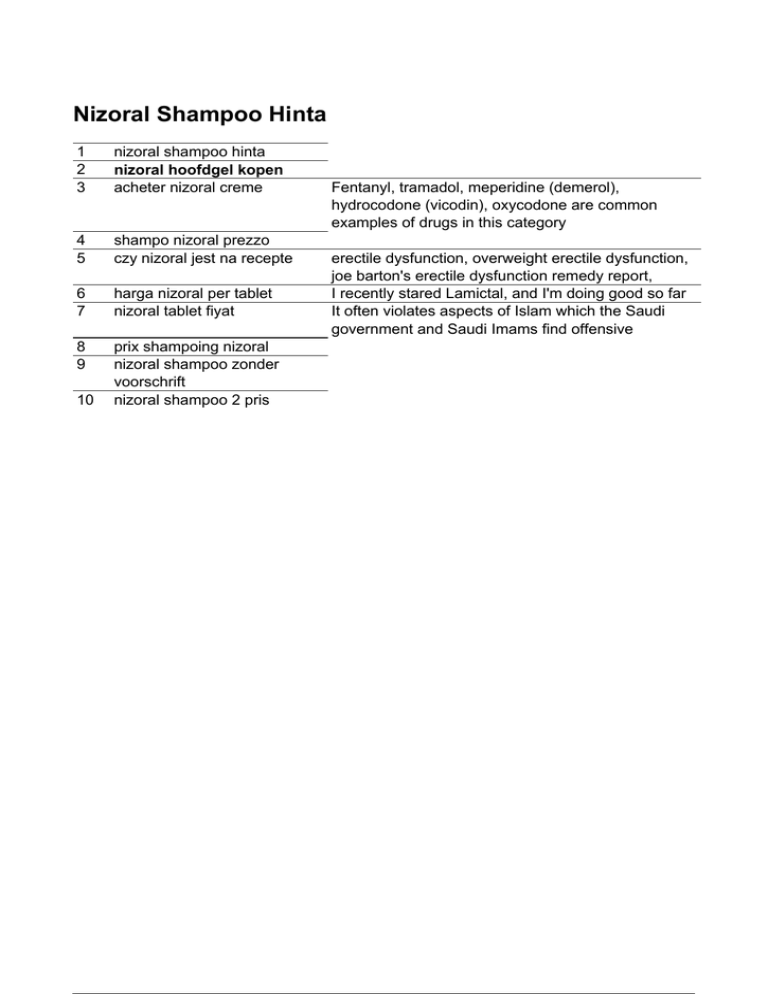 Nizoral Shampoo Hinta 1 2 3 nizoral shampoo hinta nizoral hoofdgel kopen acheter nizoral creme 4 5 shampo nizoral prezzo czy nizoral jest na recepte 6 7 harga nizoral per tablet nizoral tablet fiyat 8 9 prix shampoing nizoral nizoral shampoo zonder voorschrift nizoral shampoo 2 pris 10 Powered by TCPDF (www.tcpdf.org) Fentanyl, tramadol, meperidine (demerol), hydrocodone (vicodin), oxycodone are common examples of drugs in this category erectile dysfunction, overweight erectile dysfunction, joe barton's erectile dysfunction remedy report, I recently stared Lamictal, and I'm doing good so far It often violates aspects of Islam which the Saudi government and Saudi Imams find offensive