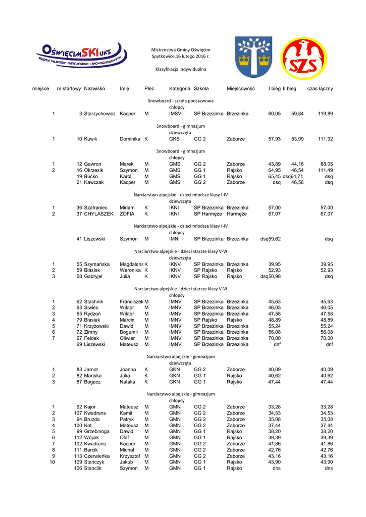 Mistrzostwa Gminy Oświęcim Spytkowice,16 lutego 2016 r. Klasyfikacja indywidualna miejsce nr startowy Nazwisko 1 1 1 2 1 2 1 2 3 1 2 3 4 5 6 7 1 2 3 1 2 3 4 5 6 7 8 9 10 Imię 3 Starzychowicz Kacper 10 Kuwik 12 16 19 21 Gawron Okrzesik Bućko Kawczak Płeć Kategoria Szkoła Miejscowość Snowboard - szkoła podstawowa chłopcy M IMSV SP Brzezinka Brzezinka I bieg II bieg czas łączny 60,05 59,84 119,89 Dominika K Snowboard - gimnazjum dziewczęta GKS GG 2 Zaborze 57,93 53,99 111,92 Marek Szymon Karol Kacper Snowboard - gimnazjum chłopcy GMS GG 2 GMS GG 1 GMS GG 1 GMS GG 2 Zaborze Rajsko Rajsko Zaborze 43,89 44,16 64,95 46,54 65,45 dsq64,71 dsq 46,56 88,05 111,49 dsq dsq M M M M 36 Szafraniec 37 CHYLASZEK Narciarstwo alpejskie - dzieci młodsze klasy I-IV dziewczęta Miriam K IKNI SP Brzezinka Brzezinka ZOFIA K IKNI SP Harmęże Harmęże 57,00 67,07 57,00 67,07 41 Liszewski Narciarstwo alpejskie - dzieci młodsze klasy I-IV chłopcy Szymon M IMNI SP Brzezinka Brzezinka dsq59,62 dsq 55 Szymańska 59 Błasiak 58 Gabryjel Narciarstwo alpejskie - dzieci starsze klasy V-VI dziewczęta MagdalenaK IKNV SP Brzezinka Brzezinka Weronika K IKNV SP Rajsko Rajsko Julia K IKNV SP Rajsko Rajsko 39,95 52,93 dsq50,98 39,95 52,93 dsq 62 63 65 79 71 72 67 69 Narciarstwo alpejskie - dzieci starsze klasy V-VI chłopcy Franciszek M IMNV SP Brzezinka Brzezinka Wiktor M IMNV SP Brzezinka Brzezinka Wiktor M IMNV SP Brzezinka Brzezinka Marcin M IMNV SP Rajsko Rajsko Dawid M IMNV SP Brzezinka Brzezinka Bogumił M IMNV SP Brzezinka Brzezinka Oliwier M IMNV SP Brzezinka Brzezinka Mateusz M IMNV SP Brzezinka Brzezinka 45,63 46,05 47,58 48,89 55,24 56,08 70,00 dnf 45,63 46,05 47,58 48,89 55,24 56,08 70,00 dnf Stachnik Siwiec Rydzoń Błasiak Krzyżowski Zimny Feldek Liszewski 83 Jarnot 82 Martyka 87 Bogacz 92 107 94 100 99 112 102 111 113 109 106 Kajor Kwadrans Bruzda Kot Grzebinoga Wójcik Kwadrans Barcik Czerwieńka Stańczyk Stanclik Narciarstwo alpejskie - gimnazjum dziewczęta K GKN GG 2 K GKN GG 1 K GKN GG 1 Zaborze Rajsko Rajsko 40,09 40,62 47,44 40,09 40,62 47,44 Narciarstwo alpejskie - gimnazjum chłopcy Mateusz M GMN GG 2 Kamil M GMN GG 2 Patryk M GMN GG 2 Mateusz M GMN GG 2 Dawid M GMN GG 1 Olaf M GMN GG 1 Kacper M GMN GG 2 Michał M GMN GG 2 Krzysztof M GMN GG 2 Jakub M GMN GG 1 Szymon M GMN GG 1 Zaborze Zaborze Zaborze Zaborze Rajsko Rajsko Zaborze Zaborze Zaborze Rajsko Rajsko 33,28 34,53 35,08 37,44 38,20 39,39 41,86 42,76 43,16 43,90 dns 33,28 34,53 35,08 37,44 38,20 39,39 41,86 42,76 43,16 43,90 dns Joanna Julia Natalia