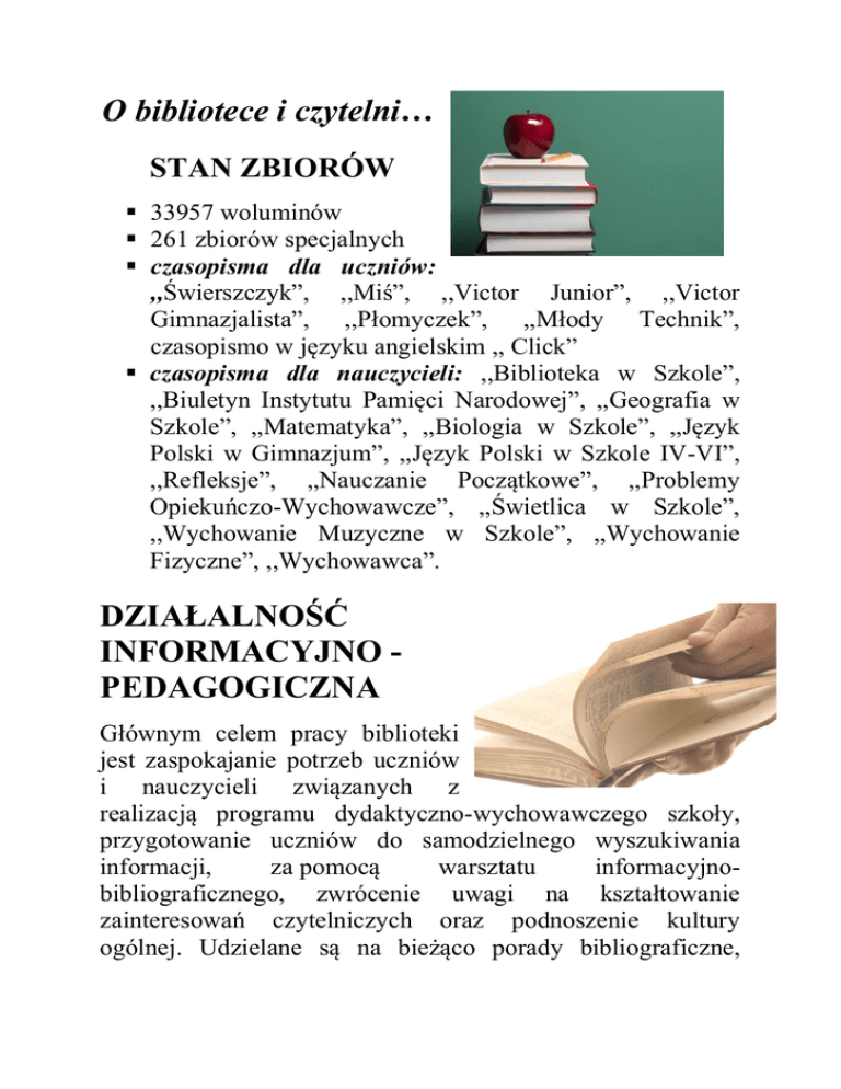 O bibliotece i czytelni… STAN ZBIORÓW 33957 woluminów 261 zbiorów specjalnych czasopisma dla uczniów: ,,Świerszczyk”, ,,Miś”, ,,Victor Junior”, ,,Victor Gimnazjalista”, ,,Płomyczek”, ,,Młody Technik”, czasopismo w języku angielskim ,, Click” czasopisma dla nauczycieli: ,,Biblioteka w Szkole”, ,,Biuletyn Instytutu Pamięci Narodowej”, ,,Geografia w Szkole”, ,,Matematyka”, ,,Biologia w Szkole”, ,,Język Polski w Gimnazjum”, ,,Język Polski w Szkole IV-VI”, ,,Refleksje”, ,,Nauczanie Początkowe”, ,,Problemy Opiekuńczo-Wychowawcze”, ,,Świetlica w Szkole”, ,,Wychowanie Muzyczne w Szkole”, ,,Wychowanie Fizyczne”, ,,Wychowawca”. DZIAŁALNOŚĆ INFORMACYJNO PEDAGOGICZNA Głównym celem pracy biblioteki jest zaspokajanie potrzeb uczniów i nauczycieli związanych z realizacją programu dydaktyczno-wychowawczego szkoły, przygotowanie uczniów do samodzielnego wyszukiwania informacji, za pomocą warsztatu informacyjnobibliograficznego, zwrócenie uwagi na kształtowanie zainteresowań czytelniczych oraz podnoszenie kultury ogólnej. Udzielane są na bieżąco porady bibliograficzne, organizowane wystawki i gazetki tematyczne, przeglądy nowości ,pozycje zalecane. Dużym zainteresowaniem cieszy się Centrum Multimedialne, w którym są cztery komputery z dostępem do Internetu, kserokopiarka, drukarka i szereg zbirów multimedialnych. Biblioteka współpracuje z wychowawcami klas oraz nauczycielami poszczególnych przedmiotów w realizacji zadań dydaktyczno-wychowawczych. Służy pomocą w wyszukiwaniu scenariuszy imprez, materiałów dla uczniów przygotowujących się do olimpiad przedmiotowych. Pomaga w wykonaniu dekoracji przy okazji szkolnych uroczystości. Wydarzenia i imprezy czytelnicze Wystawy(tematyczne, rocznicowe, okolicznościowe, prace uczniów); Lekcje biblioteczne; Pasowanie uczniów klas I na czytelnika. W połowie roku szkolnego klasy pierwsze zostają uroczyście przyjęte w poczet czytelników biblioteki szkolnej. Uczniowie zapoznają się z biblioteką i pierwszy raz wypożyczają książki. Oglądają przygotowane przez starszych kolegów przedstawienie. Dostają okazjonalne dyplomy oraz listy do rodziców na temat ważności czytania. Kiermasze książek Biblioteka utrzymuje stały kontakt z Wydawnictwem Egmont oraz Księgarnią i Hurtownią Taniej Książki w Tuliszkowie. Kilka razy w roku organizowany jest kiermasz taniej książki. Zakupić można w cenach hurtowych książki dla dzieci, albumy, słowniki, encyklopedie, poradniki.