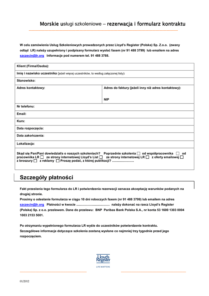 Morskie usługi szkoleniowe – rezerwacja i formularz kontraktu u __________________________________________________________________________________________________________ __________________________________________________________________________________________________________ W celu zamówienia Usług Szkoleniowych prowadzonych przez Lloyd’s Register (Polska) Sp. Z.o.o. (zwany odtąd LR) należy uzupełniony i podpisany formularz wysłać faxem (nr 91 488 3799) lub emailem na adres [email protected] Informacje pod numerem tel. 91 488 3788. Klient (Firma/Osoba): Imię i nazwisko uczestnika (jeżeli więcej uczestników, to według załączonej listy): Stanowisko: Adres kontaktowy: Adres do faktury (jeżeli inny niż adres kontaktowy): NIP Nr telefonu: Email: Kurs: Data rozpoczęcia: Data zakończenia: Lokalizacja: Skąd się Pan/Pani dowiedział/a o naszych szkoleniach? Poprzednie szkolenia od współpracownika od pracownika LR ze strony internetowej Lloyd’s List ze strony internetowej LR z oferty emailowej z broszury z reklamy Proszę podać, z której publikacji? ......................... Szczegóły płatności Fakt przesłania tego formularza do LR i potwierdzenia rezerwacji oznacza akceptację warunków podanych na drugiej stronie. Prosimy o odesłanie formularza w ciągu 10 dni roboczych faxem (nr 91 488 3799) lub emailem na adres [email protected] Płatności w kwocie ...................................... należy dokonać na rzecz Lloyd’s Register (Polska) Sp. z o.o. przelewem. Dane do przelewu: BNP Paribas Bank Polska S.A., nr konta 53 1600 1303 0004 1003 2153 5001. Po otrzymaniu wypełnionego formularza LR wyśle do uczestników potwierdzenie kontraktu. Szczegółowe informacje dotyczące szkolenia zostaną wysłane co najmniej trzy tygodnie przed jego rozpoczęciem. ______________________________________ 01/2012 _____________________________________ Warunki świadczenia usług szkoleniowych 1. 2. 3. Rejestracja 2.1 Rezerwacja wstępna Rezerwacja wstępna powinna być potwierdzona na piśmie w ciągu 10 dni roboczych. 2.2 Rezerwacja potwierdzona Po otrzymaniu potwierdzenia rezerwacji, zostaje zawarta prawnie wiążąca umowa z zastosowaniem niniejszych warunków. Opłaty i płatności 3.1 Opłata za kurs Opłatę za kurs należy uiścić po potwierdzeniu rezerwacji, po czym zostanie wystawiona faktura. Uczestnictwo w kursie uzależnione jest wyłącznie od otrzymania pełnej zapłaty. Klient zobowiązuje się uregulować wszystkie faktury za Usługi w ciągu 30 dni od daty ich wystawienia (termin wymagalności). Jeśli Klient kwestionuje fakturę lub jej część, powinien niezwłocznie powiadomić o tym LR na piśmie. Jeśli przed upływem terminu wymagalności nie wpłynie żadne zawiadomienie, Klient zobowiązany jest do zaakceptowania faktury w całości. Jeśli tylko część faktury jest zakwestionowana, jej niekwestionowana część musi być uregulowana w terminie wymagalności. LR zastrzega sobie prawo do wystawiania okresowych faktur za świadczone usługi przy zastosowaniu zasady proporcjonalności. LR zastrzega sobie prawo do naliczania odsetek za każdy dzień zwłoki w wysokości 2% rocznie powyżej wyższej ze stawek LIBOR (London Interbank Offered Base Rate) (lub jej odpowiednika w kraju, w którym klient posiada siedzibę główną) od każdej kwoty niezapłaconej po terminie wymagalności, oraz do wstrzymania świadczenia dowolnych lub wszystkich Usług do czasu całkowitego uregulowania zaległości wraz z odsetkami. LR może, według własnego uznania i w dowolnym momencie, zaliczyć kwotę otrzymaną od Klienta na uregulowanie wcześniejszych niezapłaconych faktur. Opłaty nie obejmują podatków, w tym między innymi podatku VAT, podatku od towarów i usług, opłaty skarbowej, podatków obrotowych, dopłat i należności zgodnie z wymogami prawa i, jeśli takie wymaganie ma zastosowanie, takimi podatkami lub należnościami obciążany jest Klient, który je opłaca oprócz wyżej wymienionych opłat. Klient zobowiązany jest do zapłaty pełnej Opłaty zgodnie z fakturą, niezależnie od tego, czy prawo nakazuje Klientowi pobrać podatek lub inne należności od kwoty ujętej w fakturze 4. 5. wskutek działania, zaniechania działania, błędu, zaniedbania lub w związku z ponoszeniem odpowiedzialności na zasadzie ryzyka przez członka Grupy LR, lub spowodowane niedokładną informacją lub poradą udzieloną przez członka Grupy LR lub w jego imieniu, niezależnie od sposobu ich udzielenia, nawet jeżeli zostanie stwierdzone, że przyczyniło się to do naruszenia warunków gwarancji. Jednakże, jeżeli Klient Definicje "Kontrakt" oznacza umowę z LR na świadczenie Usług Szkoleniowych na rzecz Klienta zgodnie z ustaleniami niniejszego dokumentu. „Klient” oznacza osobę (opisaną na pierwszej stronie), której LR świadczy Usługę Szkoleniową. „Warunki” oznaczają niniejsze warunki. „Opłaty” oznaczają opłaty związane ze Szkoleniem wyszczególnione na pierwszej stronie. „Grupa LR” obejmuje LR, jego filie i spółki powiązane, a także członków zarządu, dyrektorów, pracowników, przedstawicieli i pełnomocników każdego z nich, indywidualnie lub zbiorowo. „Zawiadomienie” oznacza zawiadomienie przekazane na piśmie, które będzie uważane za doręczone z chwilą faktycznego otrzymania. „Szkolenie” oznacza usługi szkoleniowe (wyszczególnione na pierwszej stronie), które LR zgodził się świadczyć na rzecz Klienta. Poufność LR ani Klient nie ujawnią ani nie pozwolą ujawnić jakiejkolwiek osobie żadnych poufnych informacji otrzymanych od drugiej strony w związku ze Szkoleniem. Powyższe zobowiązanie pozostaje w mocy po zakończeniu Kontraktu. Zobowiązanie to nie dotyczy poufnych informacji znajdujących się w posiadaniu strony otrzymującej, przed ich ujawnieniem, lub które zostaną podane do wiadomości publicznej nie z winy strony otrzymującej, lub staną się w inny sposób dostępne stronie 