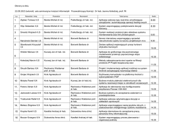 Obrony w dniu 22.09.2015 (wtorek) sala seminaryjna Instytut Informatyki Przewodniczący Komisji: Dr hab. Joanna Kołodziej, prof. PK L.p. Nazwisko i imię Promotor Recenzent Tytuł pracy Godz. 1 Ziębiec Tomasz II,S Bereta Michał dr inż. FialkoSergiy dr hab. inż. Aplikacja webowa typu real-time umożliwiająca zarządzanie i automatyzację operacji trading-owych 8.00 2 Węc Sebastian II,S Bereta Michał dr inż. FialkoSergiy dr hab. inż. System wspomagający podejmowanie decyzji kierowcy 8.30 3 Smardz Wojciech II,S Bereta Michał dr inż. FialkoSergiy dr hab. inż. System realizacji produkcji jako składowa systemu monitorowania sieci linii produkcyjnych 9.00 Serwis internetowy wspomagający sprzedaż nieruchomości oparty na wzorcu projektowym mvc 9.30 4 5 Bereta Michał dr inż. Borowik Barbara dr Narożnicki Damian I,S Słowikowski Krzysztof I,S Bereta Michał dr inż. Wolder Mariusz I,N Kucwaj Jan dr hab. inż. Borowik Barbara dr Borowik Barbara dr 6 Kołodziej Marcin II,S Kucwaj Jan dr hab. inż. Borowik Barbara dr 7. 8 9 10 11. 12. 13 14. 15 16 Struzik Bartosz II,N Grojec Wojciech I,S Motyka Paweł II,N Ferenc Adrian II,S Jackowski Łukasz II,N Trzebuniak Rafał II,S Bielesz Zbigniew II,S Krupka Kamil II,S Boczar Grzegorz II,N Rachowicz Waldemar prof. dr hab. Borowik Barbara dr Krok Agnieszka dr Borowik Barbara dr Krok Agnieszka dr Krok Agnieszka dr Krok Agnieszka dr Krok Agnieszka dr Krok Agnieszka dr Karafiat Andrzej dr hab. Dubowicka Anna drinż. Zestaw aplikacji wspierających pracę hurtowni artykułów biurowych Aplikacja do graficznego dwuwymiarowego modelowania przekroju poprzecznego słupa żelbetowego Metody zabezpieczania sieci oparte na filtracji protokołu IP Projekt bezpiecznej sieci 10.00 10.30 11.00 Projekt i implementacja aplikacji mobilnej na system Android zarządzającej rezerwacją biletów 11.30 Szyfrowany komunikator na platformę Android z wykorzystaniem PGP 12.00 Budowa modułu płatności elektronicznych dla systemu rezerwacji miejsc w ośrodkach wczasowych 12.30 Rachowicz Waldemar prof. dr hab. Aplikacja do sterowania oraz konfigurowania amplitunera Pioneer VSX-922 13.00 Rachowicz Waldemar prof. dr hab. Budowa systemu do zarządzania zadaniami w przedsiębiorstwie 13.30 Rachowicz Waldemar prof. dr hab. Aplikacja webowa optymalizująca decyzje w zakładach sportowych 14.00 Rachowicz Waldemar prof. dr hab. Aplikacja wspomagająca naukę języków obcych, z zastosowaniem inteligentnego systemu kształcenia 14.30 Dubowicka Anna drinż. Aplikacja internetowa do zarządzania pracą personelu firmy informatycznej 15.00 System wspomagający proces planowania i organizacji podróży 15.30 Kucwaj Jan dr hab.inż. Karafiat Andrzej dr hab.