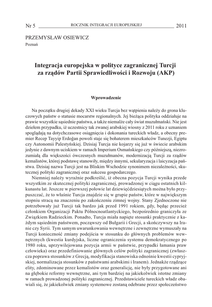 Nr 5 ROCZNIK INTEGRACJI EUROPEJSKIEJ 2011 PRZEMYS£AW OSIEWICZ Poznañ Integracja europejska w polityce zagranicznej Turcji za rz¹dów Partii Sprawiedliwoœci i Rozwoju (AKP) Wprowadzenie Na pocz¹tku drugiej dekady XXI wieku Turcja bez w¹tpienia nale¿y do grona kluczowych pañstw o statusie mocarstw regionalnych. Jej bie¿¹ca polityka oddzia³uje na prawie wszystkie s¹siednie pañstwa, a tak¿e niemal¿e ca³y œwiat muzu³mañski. Nie jest dzie³em przypadku, i¿ uczestnicy tak zwanej arabskiej wiosny z 2011 roku z uznaniem spogl¹daj¹ na dotychczasowe osi¹gniêcia i dokonania tureckich w³adz, a obecny premier Recep Tayyip Erdoðan powoli staje siê bohaterem mieszkañców Tunezji, Egiptu czy Autonomii Palestyñskiej. Dzisiaj Turcja nie kojarzy siê ju¿ w œwiecie arabskim jedynie z dawnym uciskiem w ramach Imperium Osmañskiego czy póŸniejsz¹, niezrozumia³¹ dla wiêkszoœci ówczesnych muzu³manów, modernizacj¹ Turcji za rz¹dów kemalistów, której podstawê stanowi³y, miêdzy innymi, sekularyzacja i laicyzacja pañstwa. Dzisiaj nazwa Turcji jest na Bliskim Wschodzie synonimem niezale¿noœci, skutecznej polityki zagranicznej oraz sukcesu gospodarczego. Niemniej nale¿y wyraŸnie podkreœliæ, i¿ obecna pozycja Turcji wynika przede wszystkim ze skutecznej polityki zagranicznej, prowadzonej w ci¹gu ostatnich kilkunastu lat. Jeszcze w pierwszej po³owie lat dziewiêædziesi¹tych mo¿na by³o przypuszczaæ, ¿e to w³aœnie Turcja znajdzie siê w grupie pañstw, które w najwiêkszym stopniu strac¹ na znaczeniu po zakoñczeniu zimnej wojny. Stany Zjednoczone nie potrzebowa³y ju¿ Turcji tak bardzo jak przed 1991 rokiem, gdy, bêd¹c przecie¿ cz³onkiem Organizacji Paktu Pó³nocnoatlantyckiego, bezpoœrednio graniczy³a ze Zwi¹zkiem Radzieckim. Ponadto, Turcja mia³a napiête stosunki praktycznie z ka¿dym s¹siednim pañstwem, pocz¹wszy od Bu³garii i Grecji, a skoñczywszy na Iranie czy Syrii. Tym samym uwarunkowania wewnêtrzne i zewnêtrzne wymusza³y na Turcji koniecznoœæ zmiany podejœcia w stosunku do g³ównych problemów wewnêtrznych (kwestia kurdyjska, liczne ograniczenia systemu demokratycznego po 1980 roku, uprzywilejowana pozycja armii w pañstwie, przypadki ³amania praw cz³owieka) oraz przedefiniowanie g³ównych celów polityki zagranicznej (zw³aszcza poprawa stosunków z Grecj¹, modyfikacja stanowiska odnoœnie kwestii cypryjskiej, normalizacja stosunków z pañstwami arabskimi i Iranem). Jednak¿e rz¹dz¹ce elity, zdominowane przez kemalistów oraz generalicjê, nie by³y przygotowane ani na g³êbokie reformy wewnêtrzne, ani tym bardziej na jakiekolwiek istotne zmiany w ramach prowadzonej polityki zagranicznej. Przedstawiciele tureckich w³adz obawiali siê, ¿e jakiekolwiek zmiany systemowe zostan¹ odebrane przez spo³eczeñstwo 406 Przemys³aw Osiewicz RIE 5’11 jako oznaka s³aboœci i mog³yby powa¿nie zagroziæ republikañskiemu charakterowi pañstwa1. Sytuacja zmieni³a siê diametralnie dopiero po dojœciu do w³adzy Partii Sprawiedliwoœci i Rozwoju (AKP – Adalet ve Kalkýnýma Partisi) w listopadzie 2002 roku. Od samego pocz¹tku nowy rz¹d stara³ siê przede wszystkim przeprowadziæ szereg reform wewnêtrznych, poprawiæ oraz zintensyfikowaæ stosunki z s¹siednimi pañstwami, uregulowaæ wszelkie sporne kwestie i odbudowaæ/rozszerzyæ polityczn¹ oraz gospodarcz¹ strefê wp³ywów na Bliskim Wschodzie oraz w Azji Centralnej. Tym samym przedstawiciele AKP wyszli poza ramy dotychczasowej polityki zagranicznej, której podstawê stanowi³o przede wszystkim utrzymywanie jak najlepszych stosunków ze Stanami Zjednoczonymi oraz z innymi pañstwami Zachodu, a tak¿e bliska wspó³praca z Izraelem. W tym kontekœcie pojawia siê pytanie o prounijny, europejski kierunek w polityce zagranicznej Turcji po 2002 roku. Pocz¹wszy od pierwszego wyborczego zwyciêstwa AKP pojawia³y siê opinie, ¿e Turcja za rz¹dów tej partii mo¿e odwróciæ siê od Europy i próbowaæ zwi¹zaæ z innymi pañstwami na Bliskim Wschodzie. Pojawia³y siê równie¿ opinie, ¿e byæ mo¿e to unijnym politykom bêdzie wkrótce bardziej zale¿eæ na przyjêciu Turcji ani¿eli tureckim w³adzom na wprowadzeniu swego pañstwa do UE2. Ku zaskoczeniu wielu komentatorów i analityków tureckiej sceny politycznej, rz¹d zdominowany przez konserwatywn¹ AKP od samego pocz¹tku deklarowa³ intensyfikacjê dzia³añ celem uzyskania pe³noprawnego cz³onkostwa w UE. I to w stopniu o wiele wiêkszym ani¿eli rz¹dz¹cy z krótkimi przerwami do 2002 roku kemaliœci. Co wiêcej, s³owa i deklaracje czo³owych polityków AKP znalaz³y wkrótce potwierdzenie w konkretnych dzia³aniach podejmowanych przez rz¹d. Obecnie tureckie w³adze nadal deklaruj¹ chêæ przyst¹pienia do Unii Europejskiej, choæ poparcie dla idei cz³onkostwa w spo³eczeñstwie wyraŸnie spada, mno¿¹ siê problemy polityczne, a negocjacje akcesyjne utkwi³y w martwym punkcie. W tym kontekœcie nale¿a³oby postawiæ pytanie dotycz¹ce prounijnego kierunku w polityce zagranicznej Turcji w okresie rz¹dów Partii Sprawiedliwoœci i Rozwoju w latach 2002–2011, czyli od pierwszego wyborczego zwyciêstwa a¿ do sukcesu 1 Po sukcesie rewolucji i przekszta³ceniu Iranu z cesarstwa w pañstwo teokratyczne w 1979 roku, tureckie w³adze powa¿nie obawia³y siê mo¿liwoœci powtórzenia tego scenariusza tak¿e w ich pañstwie. Chocia¿ szyickie idee promowane przez ajatollaha Chomeiniego nie trafia³y na podatny grunt w zdominowanej wyraŸnie przez sunnitów Turcji, sam przyk³ad stanowi³ zagro¿enie. Tym bardziej, ¿e od pocz¹tku lat siedemdziesi¹tych tureckie spo³eczeñstwo ¿y³o w cieniu terroru ze strony rozmaitych grup nacjonalistycznych oraz lewackich. Jakakolwiek powa¿na destabilizacja sytuacji politycznej mog³a doprowadziæ do nieodwracalnych zmian. W tym nale¿y upatrywaæ, miedzy innymi, przyczyn wojskowego zamachu stanu z 1980 roku. Wiêcej na ten temat zob. E. Özbudun, Ö. F. Ge