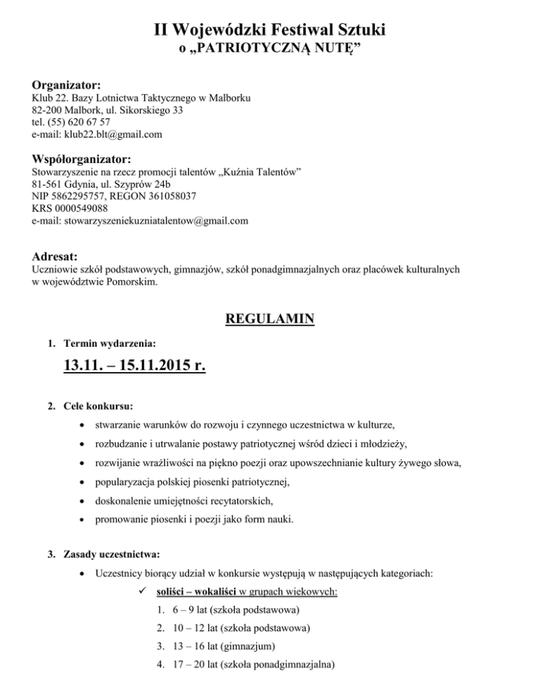 II Wojewódzki Festiwal Sztuki o „PATRIOTYCZNĄ NUTĘ” Organizator: Klub 22. Bazy Lotnictwa Taktycznego w Malborku 82-200 Malbork, ul. Sikorskiego 33 tel. (55) 620 67 57 e-mail: [email protected] Współorganizator: Stowarzyszenie na rzecz promocji talentów „Kuźnia Talentów” 81-561 Gdynia, ul. Szyprów 24b NIP 5862295757, REGON 361058037 KRS 0000549088 e-mail: [email protected] Adresat: Uczniowie szkół podstawowych, gimnazjów, szkół ponadgimnazjalnych oraz placówek kulturalnych w województwie Pomorskim. REGULAMIN 1. Termin wydarzenia: 13.11. – 15.11.2015 r. 2. Cele konkursu: stwarzanie warunków do rozwoju i czynnego uczestnictwa w kulturze, rozbudzanie i utrwalanie postawy patriotycznej wśród dzieci i młodzieży, rozwijanie wrażliwości na piękno poezji oraz upowszechnianie kultury żywego słowa, popularyzacja polskiej piosenki patriotycznej, doskonalenie umiejętności recytatorskich, promowanie piosenki i poezji jako form nauki. 3. Zasady uczestnictwa: Uczestnicy biorący udział w konkursie występują w następujących kategoriach: soliści – wokaliści w grupach wiekowych: 1. 6 – 9 lat (szkoła podstawowa) 2. 10 – 12 lat (szkoła podstawowa) 3. 13 – 16 lat (gimnazjum) 4. 17 – 20 lat (szkoła ponadgimnazjalna) zespoły wokalne i duety w grupach wiekowych: 1. 7 – 12 lat (szkoła podstawowa) 2. 13 – 16 lat (gimnazjum) 3. 17 – 20 lat (szkoła ponadgimnazjalna) recytacja w grupach wiekowych: 1. 10 – 12 lat (szkoła podstawowa) 2. 13 – 16 lat (gimnazjum) 3. 17 – 20 lat (szkoła ponadgimnazjalna) poezja śpiewana w grupach wiekowych: 1. 13 – 16 lat (gimnazjum) 2. 17 – 20 lat (szkoła ponadgimnazjalna) Uczestnicy wszystkich kategorii prezentują dwa utwory, z czego jeden obowiązkowo winien dotyczyć tematyki patriotycznej*, KARTY ZGŁOSZENIA prosimy wysyłać na adres [email protected] lub na adres Klub 22. Bazy Lotnictwa Taktycznego w Malborku ul. Sikorskiego 33, 82-200 Malbork z dopiskiem „Patriotyczna Nuta” w nieprzekraczalnym terminie do dnia 6 listopada 2015 r. (piątek) włącznie, Obowiązkiem uczestnika Festiwalu jest dołączenie wszystkich podkładów muzycznych (półplaybacków) WRAZ Z KARTĄ ZGŁOSZENIA oraz tekstów piosenek i wierszy w liczbie 3 egzemplarzy, Wszystkie wymagania techniczne (również zapotrzebowanie instrumentalne) prosimy zawrzeć w karcie zgłoszenia, Uczestnicy biorący udział w Festiwalu występują według załączonego harmonogramu, Aby wziąć udział w Festiwalu każdy z uczestników może złożyć darowiznę (tzw. Akredytacja festiwalowa), która wynosi: - 20 zł - soliści oraz recytatorzy - 30 zł - duety, zespoły oraz zespoły w kategorii poezja śpiewana (dotyczy całego zespołu) Należy ją wpłacać na konto nie później niż do 6 listopada 2015 r. (piątek): STOWARZYSZENIE NA RZECZ PROMOCJI TALENTÓW „Kuźnia Talentów”, nr konta: mBank 89 1140 2004 0000 3802 7560 4081 z dopiskiem: darowizna na rzecz festiwalu Wszystkie wpłaty wykorzystane zostaną na organizację festiwalu oraz związane z nim atrakcje. W każdej kategorii można zgłosić udział tylko dwóch uczestników (zespołów/duetów/recytatorów) z danej szkoły/placówki**, W kategorii zespoły wokalne i duety liczba wokalistów powinna mieścić się między dwiema, a ośmioma osobami, Kategoria poezja śpiewana – utwory zostają wykonane wraz z zespołem akompaniującym, bądź do podkładu muzycznego (półplayback), W każdej kategorii wybór repertuaru powinien być dostosowany do wieku uczestnika, Łączny czas prezentacji nie powinien zajmować więcej niż 8 minut, Piosenki mogą zostać wykonane zarówno przy akompaniamencie, jak również z podkładem muzycznym /prosimy uprzednio zaznaczyć odpowiedni nośnik w karcie zgłoszenia/, Instrumentaliści akompaniujący soliście bądź grupie nie mogą występować w liczbie większej, niż 4, Zmiana repertuaru po oddaniu karty będzie możliwa wyłącznie za zgodą organizatora, Jury zostanie powołane przez organizatora oraz współorganizatora konkursu, Instruktorzy i opiekunowie uczestników Festiwalu mogą uzyskać od jury uzasadnienie werdyktu ogólnego oraz ocen poszczególnych wykonawców, Lista uczestników oraz szczegółowe informacje dotyczące przesłuchań dostępne będą na stronie internetowej http://www.facebook.com/ – Klub 22. Bazy Lotnictwa Taktycznego w Malborku https://www.facebook.com/pages/Klub-22-Bazy-Lotnictwa-Taktycznego, 4. Kryteria oceny: dykcja i poprawność językowa; emisja głosu; intonacja, czystość dźwięku; dobór repertuaru do wieku uczestnika; ogólny wyraz artystyczny 5. Nagrody: organizator przewiduje dyplomy dla wszystkich uczestników; laureaci Festiwalu otrzymają nagrody rzeczowe, 6. Dodatkowe informacje: Uczestnicy Festiwalu pokrywają koszty przejazdu, wyżywienia oraz ewentualnego zakwaterowania, Werdykt Jury jest niepodważalny, Wszelkie przesłuchania mogą być rejestrowane, transmitowane, nagrywane za zgodą organizatora konkursu, bez jakiejkolwiek odpłatności dla uczestników tego wydarzenia * W przypadku dużej ilości zgłoszeń organizator zastrzega sobie prawo do skrócenia prezentacji do jednego utworu (o tematyce patriotycznej) ** Każda szkoła/placówka ma możliwość wystawienia po dwóch reprezentantach w każdej z kategorii