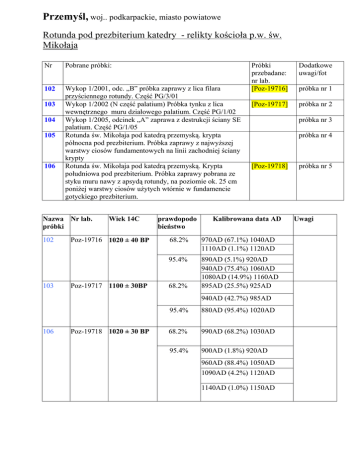 Przemyśl, woj.. podkarpackie, miasto powiatowe Rotunda pod prezbiterium katedry - relikty kościoła p.w. św. Mikołaja Nr Pobrane próbki: 102 Wykop 1/2001, odc. „B” próbka zaprawy z lica filara przyściennego rotundy. Część PG/3/01 Wykop 1/2002 (N część palatium) Próbka tynku z lica wewnętrznego muru działowego palatium. Część PG/1/02 Wykop 1/2005, odcinek „A” zaprawa z destrukcji ściany SE palatium. Część PG/1/05 Rotunda św. Mikołaja pod katedrą przemyską. krypta północna pod prezbiterium. Próbka zaprawy z najwyższej warstwy ciosów fundamentowych na linii zachodniej ściany krypty Rotunda św. Mikołaja pod katedrą przemyską. Krypta południowa pod prezbiterium. Próbka zaprawy pobrana ze styku muru nawy z apsydą rotundy, na poziomie ok. 25 cm poniżej warstwy ciosów użytych wtórnie w fundamencie gotyckiego prezbiterium. 103 104 105 106 Nazwa Nr lab. próbki 102 103 Wiek 14C Poz-19716 1020 ± 40 BP Poz-19717 1100 ± 30BP prawdopodo bieństwo Próbki przebadane: nr lab. [Poz-19716] Dodatkowe uwagi/fot [Poz-19717] próbka nr 2 próbka nr 3 próbka nr 4 [Poz-19718] Kalibrowana data AD 68.2% 970AD (67.1%) 1040AD 1110AD (1.1%) 1120AD 95.4% 890AD (5.1%) 920AD 940AD (75.4%) 1060AD 1080AD (14.9%) 1160AD 895AD (25.5%) 925AD 68.2% 940AD (42.7%) 985AD 106 Poz-19718 1020 ± 30 BP próbka nr 1 95.4% 880AD (95.4%) 1020AD 68.2% 990AD (68.2%) 1030AD 95.4% 900AD (1.8%) 920AD 960AD (88.4%) 1050AD 1090AD (4.2%) 1120AD 1140AD (1.0%) 1150AD próbka nr 5 Uwagi