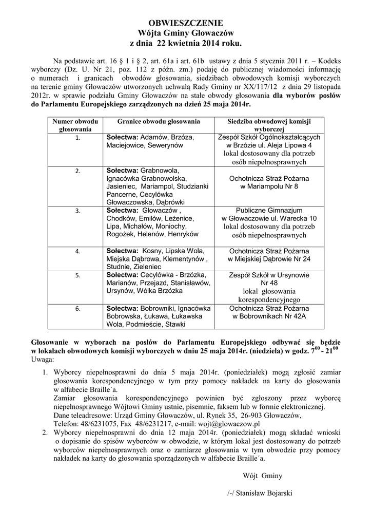 OBWIESZCZENIE Wójta Gminy Głowaczów z dnia 22 kwietnia 2014 roku. Na podstawie art. 16 § 1 i § 2, art. 61a i art. 61b ustawy z dnia 5 stycznia 2011 r. – Kodeks wyborczy (Dz. U. Nr 21, poz. 112 z późn. zm.) podaję do publicznej wiadomości informację o numerach i granicach obwodów głosowania, siedzibach obwodowych komisji wyborczych na terenie gminy Głowaczów utworzonych uchwałą Rady Gminy nr XX/117/12 z dnia 29 listopada 2012r. w sprawie podziału Gminy Głowaczów na stałe obwody głosowania dla wyborów posłów do Parlamentu Europejskiego zarządzonych na dzień 25 maja 2014r. Numer obwodu głosowania 1. Granice obwodu głosowania Sołectwa: Adamów, Brzóza, Maciejowice, Sewerynów Siedziba obwodowej komisji wyborczej Zespół Szkół Ogólnokształcących w Brzózie ul. Aleja Lipowa 4 lokal dostosowany dla potrzeb osób niepełnosprawnych 2. 3. 4. 5. 6. Sołectwa: Grabnowola, Ignacówka Grabnowolska, Jasieniec, Mariampol, Studzianki Pancerne, Cecylówka Głowaczowska, Dąbrówki Sołectwa: Głowaczów , Chodków, Emilów, Leżenice, Lipa, Michałów, Moniochy, Rogożek, Helenów, Henryków Ochotnicza Straż Pożarna w Mariampolu Nr 8 Publiczne Gimnazjum w Głowaczowie ul. Warecka 10 lokal dostosowany dla potrzeb osób niepełnosprawnych Sołectwa: Kosny, Lipska Wola, Miejska Dąbrowa, Klementynów , Studnie, Zieleniec Sołectwa: Cecylówka - Brzózka, Marianów, Przejazd, Stanisławów, Ursynów, Wólka Brzózka Ochotnicza Straż Pożarna w Miejskiej Dąbrowie Nr 24 Sołectwa: Bobrowniki, Ignacówka Bobrowska, Łukawa, Łukawska Wola, Podmieście, Stawki Ochotnicza Straż Pożarna w Bobrownikach Nr 42A Zespół Szkół w Ursynowie Nr 48 lokal głosowania korespondencyjnego Głosowanie w wyborach na posłów do Parlamentu Europejskiego odbywać się będzie w lokalach obwodowych komisji wyborczych w dniu 25 maja 2014r. (niedziela) w godz. 700 - 2100 Uwaga: 1. Wyborcy niepełnosprawni do dnia 5 maja 2014r. (poniedziałek) mogą zgłosić zamiar głosowania korespondencyjnego w tym przy pomocy nakładek na karty do głosowania w alfabecie Braille´a. Zamiar głosowania korespondencyjnego powinien być zgłoszony przez wyborcę niepełnosprawnego Wójtowi Gminy ustnie, pisemnie, faksem lub w formie elektronicznej. Dane teleadresowe: Urząd Gminy Głowaczów, ul. Rynek 35, 26-903 Głowaczów, Telefon: 48/6231075, Fax 48/6231217, e-mail: [email protected] 2. Wyborcy niepełnosprawni do dnia 12 maja 2014r. (poniedziałek) mogą składać wnioski o dopisanie do spisów wyborców w obwodzie, w którym lokal jest dostosowany do potrzeb wyborców niepełnosprawnych oraz o zamiarze głosowania w tym obwodzie przy pomocy nakładek na karty do głosowania sporządzonych w alfabecie Braille´a. Wójt Gminy /-/ Stanisław Bojarski