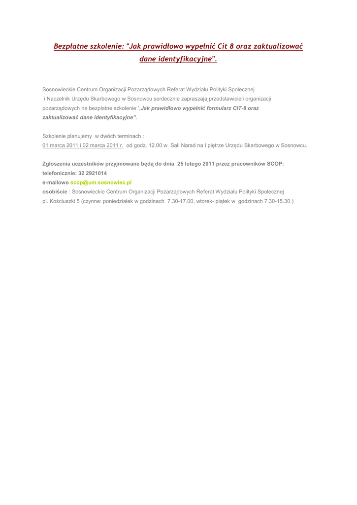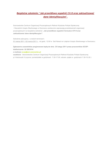 Bezpłatne szkolenie: "Jak prawidłowo wypełnić Cit 8 oraz zaktualizować dane identyfikacyjne". Sosnowieckie Centrum Organizacji Pozarządowych Referat Wydziału Polityki Społecznej i Naczelnik Urzędu Skarbowego w Sosnowcu serdecznie zapraszają przedstawicieli organizacji pozarządowych na bezpłatne szkolenie '„Jak prawidłowo wypełnić formularz CIT-8 oraz zaktualizować dane identyfikacyjne''. Szkolenie planujemy w dwóch terminach : 01 marca 2011 i 02 marca 2011 r. od godz. 12.00 w Sali Narad na I piętrze Urzędu Skarbowego w Sosnowcu. Zgłoszenia uczestników przyjmowane będą do dnia 25 lutego 2011 przez pracowników SCOP: telefonicznie: 32 2921014 e-mailowo [email protected] osobiście : Sosnowieckie Centrum Organizacji Pozarządowych Referat Wydziału Polityki Społecznej pl. Kościuszki 5 (czynne: poniedziałek w godzinach 7.30-17.00, wtorek- piątek w godzinach 7.30-15.30 )