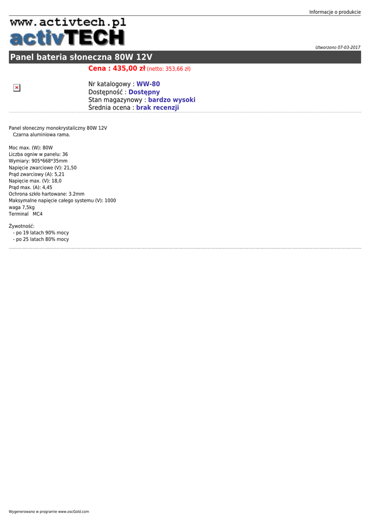 Informacje o produkcie Utworzono 07-03-2017 Panel bateria słoneczna 80W 12V Cena : 435,00 zł (netto: 353,66 zł) Nr katalogowy : WW-80 Dostępność : Dostępny Stan magazynowy : bardzo wysoki Średnia ocena : brak recenzji Panel słoneczny monokrystaliczny 80W 12V Czarna aluminiowa rama. Moc max. (W): 80W Liczba ogniw w panelu: 36 Wymiary: 905*668*35mm Napięcie zwarciowe (V): 21,50 Prąd zwarciowy (A): 5,21 Napięcie max. (V): 18,0 Prąd max. (A): 4,45 Ochrona szkło hartowane: 3.2mm Maksymalne napięcie całego systemu (V): 1000 waga 7,5kg Terminal MC4 Żywotność: - po 19 latach 90% mocy - po 25 latach 80% mocy Wygenerowano w programie www.oscGold.com