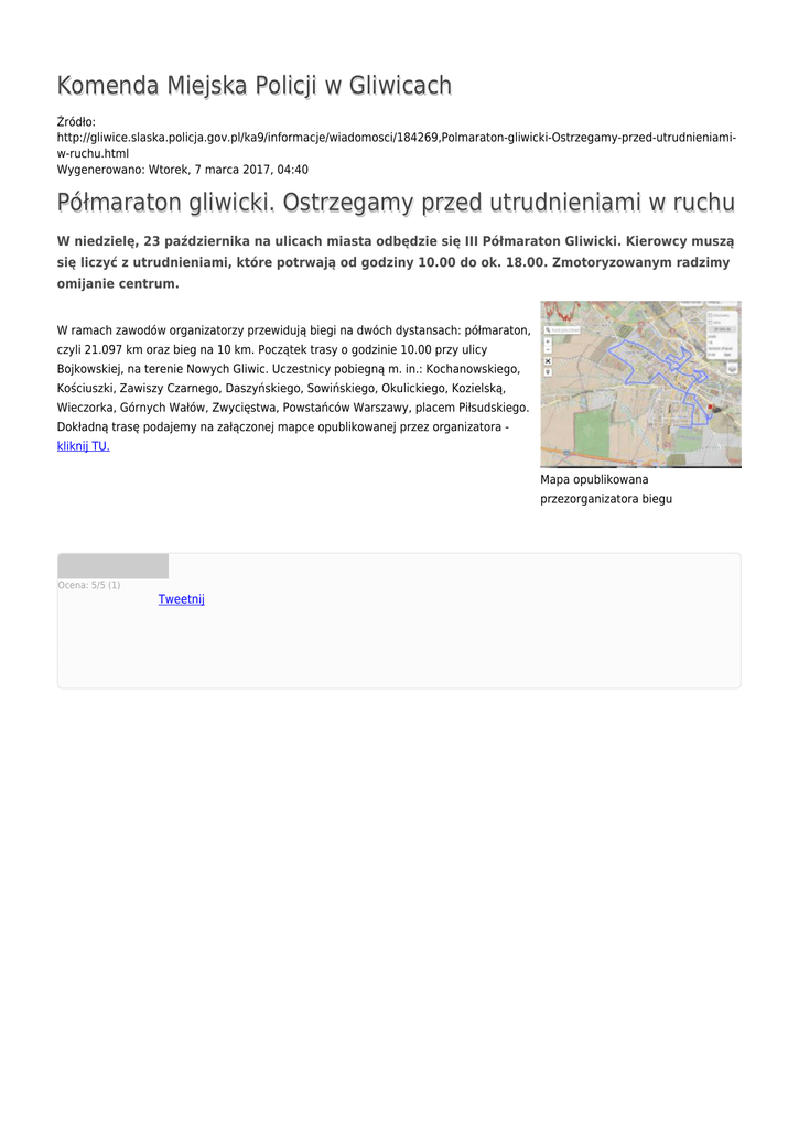 Komenda Miejska Policji w Gliwicach Źródło: http://gliwice.slaska.policja.gov.pl/ka9/informacje/wiadomosci/184269,Polmaraton-gliwicki-Ostrzegamy-przed-utrudnieniamiw-ruchu.html Wygenerowano: Wtorek, 7 marca 2017, 04:40 Półmaraton gliwicki. Ostrzegamy przed utrudnieniami w ruchu W niedzielę, 23 października na ulicach miasta odbędzie się III Półmaraton Gliwicki. Kierowcy muszą się liczyć z utrudnieniami, które potrwają od godziny 10.00 do ok. 18.00. Zmotoryzowanym radzimy omijanie centrum. W ramach zawodów organizatorzy przewidują biegi na dwóch dystansach: półmaraton, czyli 21.097 km oraz bieg na 10 km. Początek trasy o godzinie 10.00 przy ulicy Bojkowskiej, na terenie Nowych Gliwic. Uczestnicy pobiegną m. in.: Kochanowskiego, Kościuszki, Zawiszy Czarnego, Daszyńskiego, Sowińskiego, Okulickiego, Kozielską, Wieczorka, Górnych Wałów, Zwycięstwa, Powstańców Warszawy, placem Piłsudskiego. Dokładną trasę podajemy na załączonej mapce opublikowanej przez organizatora kliknij TU. Mapa opublikowana przezorganizatora biegu Ocena: 5/5 (1) Tweetnij