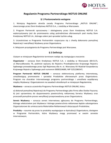 Regulamin Programu Partnerskiego NOTUS ONLINE § 1 Postanowienia wstępne 1. Niniejszy Regulamin określa zasady Programu Partnerskiego „NOTUS ONLINE”, stworzonego przez Dom Kredytowy NOTUS S.A., z siedzibą w Warszawie. 2. Program Partnerski opracowany i obsługiwany przez Dom Kredytowy NOTUS S.A. wykorzystywany jest do promowania usług pośrednictwa oferowanych pod marką Dom Kredytowy NOTUS S.A., którego celem jest sprzedaż tychże usług. 3. Uczestnictwo w Programie Partnerskim rozpoczyna się z chwilą dokonania pomyślnej Rejestracji i weryfikacji Wydawcy przez Organizatora. 4. Miejscem przystąpienia do Programu Partnerskiego jest Warszawa. § 2 Definicje Użytym w niniejszym Regulaminie terminom nadaje się następujące znaczenie: Organizator – oznacza Dom Kredytowy NOTUS S.A. z siedzibą w Warszawie (00-517), ul. Marszałkowska 76, podmiot wpisany do Rejestru Przedsiębiorców Krajowego Rejestru Sądowego prowadzonego przez Sąd Rejonowy dla m. st. Warszawy XII Wydział Gospodarczy Krajowego Rejestru Sądowego pod numerem 0000324689, NIP 5252286547; Program Partnerski NOTUS ONLINE – oznacza elektroniczną platformę internetową, umożliwiającą promowanie i sprzedaż Produktów oferowanych przez Organizatora. Program ma charakter internetowego programu partnerskiego i umożliwia współpracę między Wydawcą i Organizatorem na zasadach określonych w niniejszym Regulaminie; Wydawca – oznacza uczestnika Programu Partnerskiego NOTUS ONLINE, który: a) dokonał pomyślnej Rejestracji do Programu Partnerskiego jako Firma albo Osoba Fizyczna; b) jest uprawniony do dysponowania powierzchnią reklamową Serwisu Wydawcy oraz przeszedł pomyślnie proces weryfikacji przeprowadzony przez Organizatora; Serwis Wydawcy – oznacza serwis internetowy zgłoszony do Programu Partnerskiego, którego właścicielem jest Wydawca i którego powierzchnia reklamowa będzie udostępniana Organizatorowi do umieszczania Materiałów Reklamowych dotyczących Produktów; Produkty – rozumie się przez to produkty występujące w dystrybucji Organizatora, dostępne w Programie Partnerskim, które Wydawcy mogą promować w swoim serwisie internetowym; Prowizje - oznaczają stawki wyrażone procentowo lub kwotowo w polskich złotych (PLN), należne Wydawcy, z tytułu uczestnictwa w Programie Partnerskim. Wartości i rodzaje Prowizji wskazane są w formie elektronicznej w Panelu Klienta; Tabela Prowizji - oznacza elektroniczne zestawienie Prowizji określone w Panelu Wydawcy w zależności od rodzaju Produktu oraz zestawienie warunków, jakie muszą być spełnione, aby Prowizja stała się należna dla Wydawcy; Panel logowania – oznacza elektroniczną platformę, na której Wydawca może rozpocząć proces przystąpienia do Programu Partnerskiego i na którym może się zalogować do konta Wydawcy. Serwis ten zawiera informacje o Programie Partnerskim i Produktach oraz jest dostępny pod adresem: http://notusonline.dknotus.pl/affiliates/panel.php#Home Konto Wydawcy – oznacza udostępnione przez Organizatora po procesie rejestracji Konto do Programu Partnerskiego; zawiera ono informacje na temat Produktów i powiązanych z nimi Prowizji, statystyki dotyczące działań w ramach Programu Partnerskiego. Konto to umożliwia Wydawcy również, pobieranie Materiałów Reklamowych oraz komunikację z Organizatorem; Materiały Reklamowe – oznaczają udostępnione w Programie Partnerskim elektroniczne materiały graficzne (banery, kreacje mailingowe, widgety, kalkulatory, itp.) lub tekstowe (linki, artykuły, opisy Produktów itp.), które mają być umieszczane przez Wydawcę w Serwisie Wydawcy. Materiały te zwykle będą miały postać kodu udostępnionego w Koncie Wydawcy; Rejestracja – oznacza przystąpienie do Programu Partnerskiego , które składa się z 2 etapów, sprecyzowanych w § 3, przez rejestrację rozumie się wypełnienie Formularza Rejestracji i akceptację regulaminu; Użytkownik – oznacza Osobę Fizyczną lub Firmę korzystającą z Serwisu Wydawcy, zainteresowaną Produktami i uprawnioną do wypełniania formularza czyli tzw. Leada; Regulamin - oznacza niniejszy regulamin, który jest dostępny w Programie Partnerskim; Wynagrodzenie - oznacza sumę Prowizji należnych Wydawcy zgodnie z Tabelą Prowizji; Lead – to formularz internetowy, wypełniony przez klienta na stronie wydawcy, zawierający co najmniej numer telefonu, opcjonalnie imię, nazwisko oraz email klienta; Okres Rozliczeniowy – oznacza okres jednego miesiąca kalendarzowego. W przypadku przystąpienia Wydawcy do Programu Partnerskiego lub wystąpienia z niego w trakcie trwania danego miesiąca, rozumie się przez to sumę dni w danym miesiącu, w trakcie których Wydawca był Uczestnikiem Programu Partnerskiego; Zgłoszenie Wypłaty – oznacza poinformowanie Organizatora przez Wydawcę o chęci wypłacenia naliczonego Wynagrodzenia, poprzez kliknięcie w przycisk „Zgłoś wypłatę” w Koncie Wydawcy; Osoba Fizyczna - oznacza osobę, która jest obywatelem Rzeczypospolitej Polskiej i nie prowadzi działalności gospodarczej, ma miejsce zamieszkania lub pobytu na terytorium Rzeczypospolitej Polskiej, ukończyła 18 lat, ma pełną zdolność do czynności prawnych oraz jest właścicielem rachunku bankowego, który zarejestrował się do programu partnerskiego; Firma – oznacza: a) osobę fizyczną, która prowadzi działalność gospodarczą na terytorium Rzeczypospolitej Polskiej, b) osobę prawną, mająca swoją statutową siedzibę na terytorium Rzeczypospolitej Polskiej, która zarejestrowała się do Programu Partnerskiego. § 3 Zasady rejestracji i uczestnictwa w Programie Partnerskim 1. W Programie Partnerskim może uczestniczyć Osoba Fizyczna albo Firma. 2. Uczestnictwo w Programie Partnerskim jest dobrowolne i odbywa się dwuetapowo: a) I etap rejestracja, która prowadzi do zawarcia Umowy i polega na wypełnieniu pełnego Formularza Rejestracji z prawidłowymi i zgodnymi ze stanem fakt