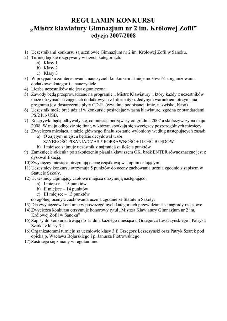 REGULAMIN KONKURSU „Mistrz klawiatury Gimnazjum nr 2 im. Królowej Zofii” edycja 2007/2008 1) Uczestnikami konkursu są uczniowie Gimnazjum nr 2 im. Królowej Zofii w Sanoku. 2) Turniej będzie rozgrywany w trzech kategoriach: a) Klasy 1 b) Klasy 2 c) Klasy 3 3) W przypadku zainteresowania nauczycieli konkursem istnieje możliwość zorganizowania dodatkowej kategorii – nauczyciele. 4) Liczba uczestników nie jest ograniczona. 5) Zawody będą przeprowadzane na programie „ Mistrz Klawiatury”, który każdy z uczestników może otrzymać na zajęciach dodatkowych z Informatyki. Jedynym warunkiem otrzymania programu jest dostarczenie płyty CD-R, (czytelnie podpisanej: imię, nazwisko, klasa). 6) Uczestnik może brać udział w konkursie posiadając własną klawiaturę, zgodną ze standardami PS/2 lub USB. 7) Rozgrywki będą odbywały się, co miesiąc począwszy od grudnia 2007 a skończywszy na maju 2008. W maju odbędzie się finał, w którym spotkają się zwycięzcy poszczególnych miesięcy. 8) Zwycięzca miesiąca, a także głównego finału zostanie wyłoniony według następujących zasad: a) O zajętym miejscu będzie decydował wzór: SZYBKOŚĆ PISANIA/CZAS * POPRAWNOŚĆ + ILOŚĆ BŁĘDÓW b) I miejsce zajmuje uczestnik z najmniejszą ilością punktów 9) Zamknięcie okienka po zakończeniu pisania klawiszem OK. bądź ENTER równoznaczne jest z dyskwalifikacją. 10) Zwycięzcy miesiąca otrzymują ocenę cząstkową w stopniu celującym. 11) Uczestnicy konkursu otrzymują 5 punktów do oceny zachowania ucznia zgodnie z zapisem w Statucie Szkoły. 12) Uczestnicy zajmujący czołowe miejsca otrzymują następująco: a) I miejsce – 15 punktów b) II miejsce – 14 punktów c) III miejsce – 13 punktów do ogólnej oceny z zachowania ucznia zgodnie ze Statutem Szkoły. 13) Dla zwycięzców konkursu w poszczególnych kategoriach przewidziane są nagrody rzeczowe. 14) Zwycięzca konkursu otrzymuje honorowy tytuł „Mistrza Klawiatury Gimnazjum nr 2 im. Królowej Zofii w Sanoku” 15) Zapisy do konkursu trwają do 15 dnia każdego miesiąca u Grzegorza Leszczyńskiego i Patryka Szarka z klasy 3 f. 16) Organizatorami turnieju są uczniowie klasy 3 f: Grzegorz Leszczyński oraz Patryk Szarek pod opieką p. Wacława Bojarskiego i p. Janusza Piotrowskiego. 17) Zastrzega się zmiany w regulaminie.